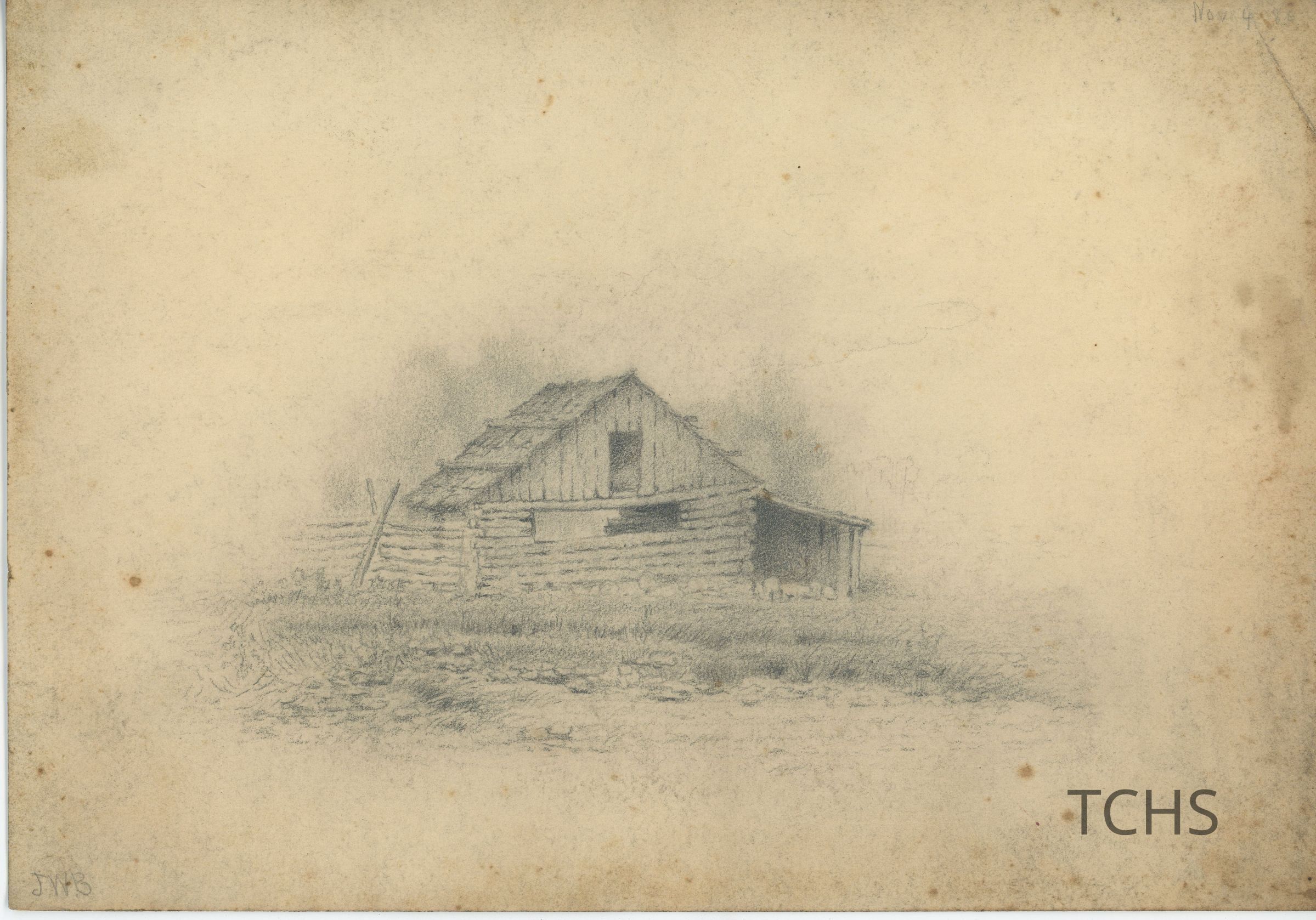 A drawing of an unidentified log cabin by John Walter Bell, signed "JWB" and dated November 4th, 1886. 7 inches by 10 inchesCollection