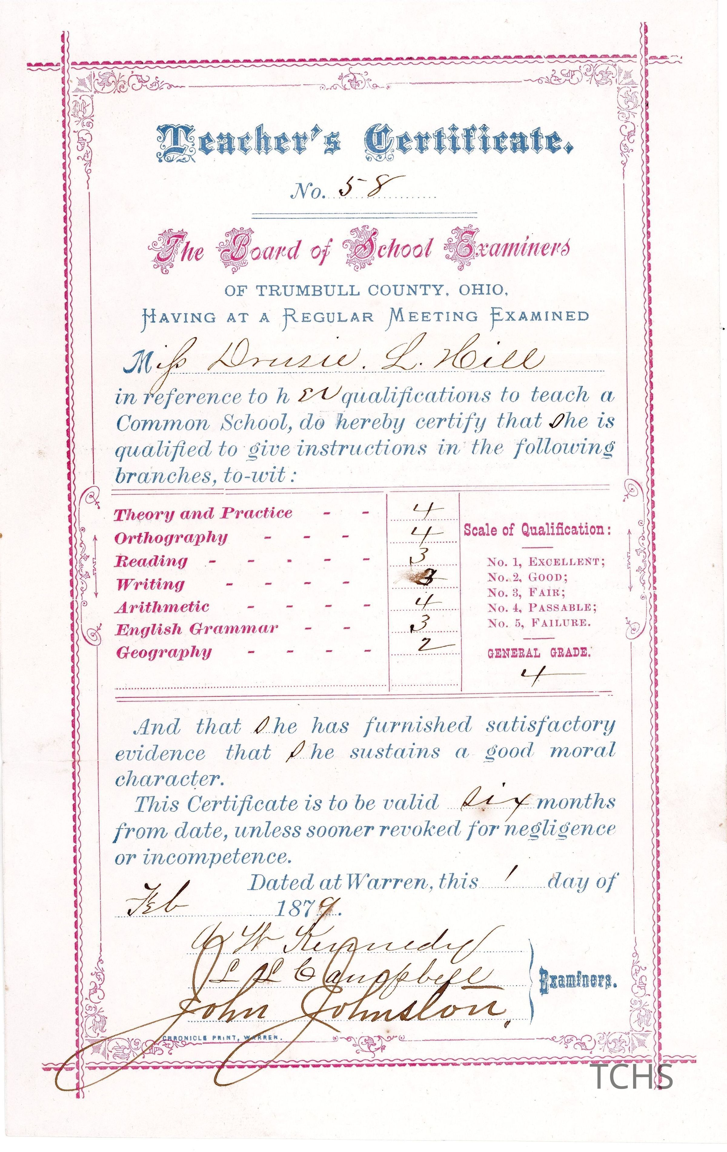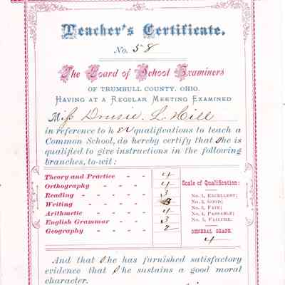 A teacher's certificate for Drusie L. Hill dated February 1st, 1879, issued by the Board of School Examiners of Trumbull County.Date(s) of Creation