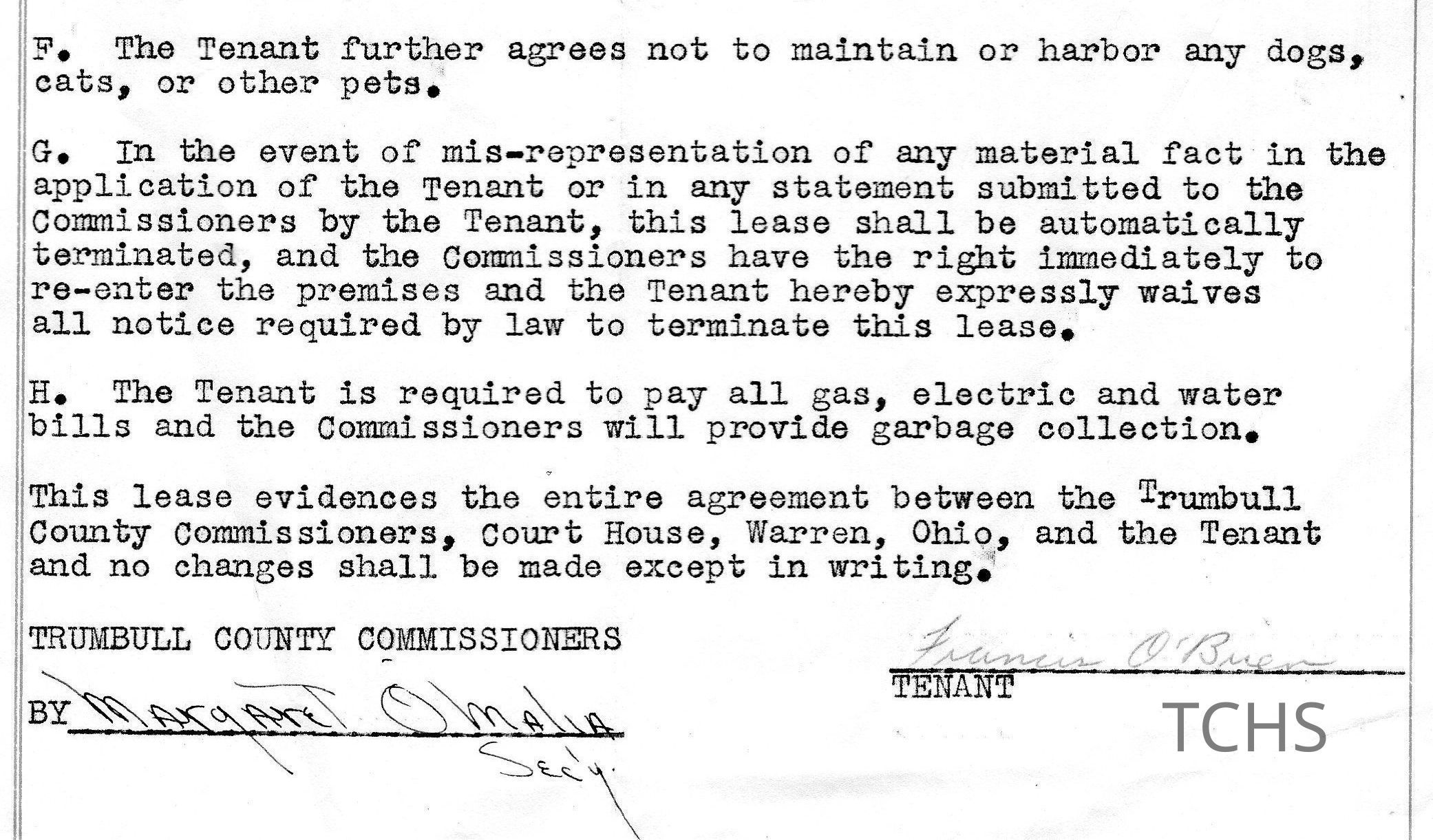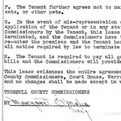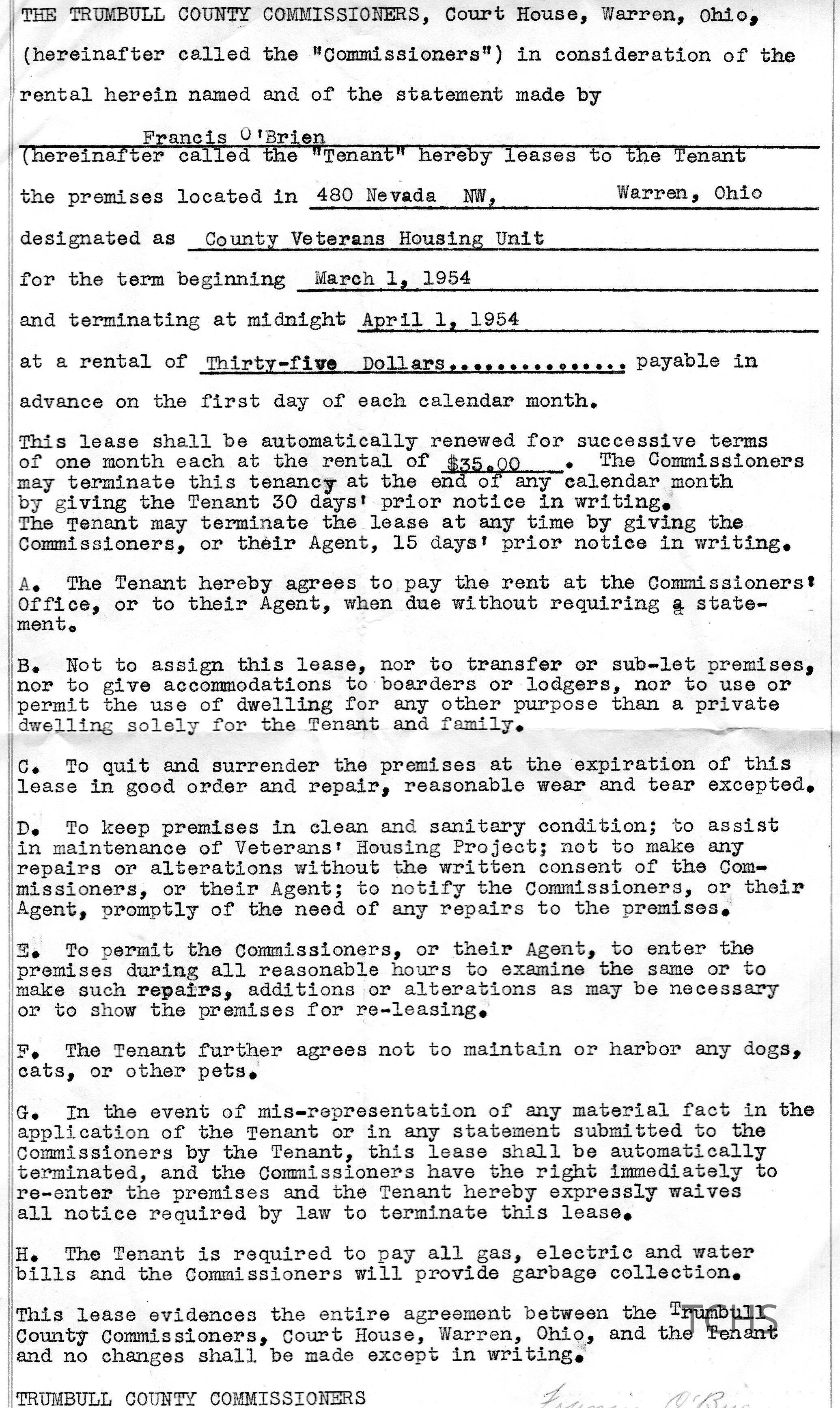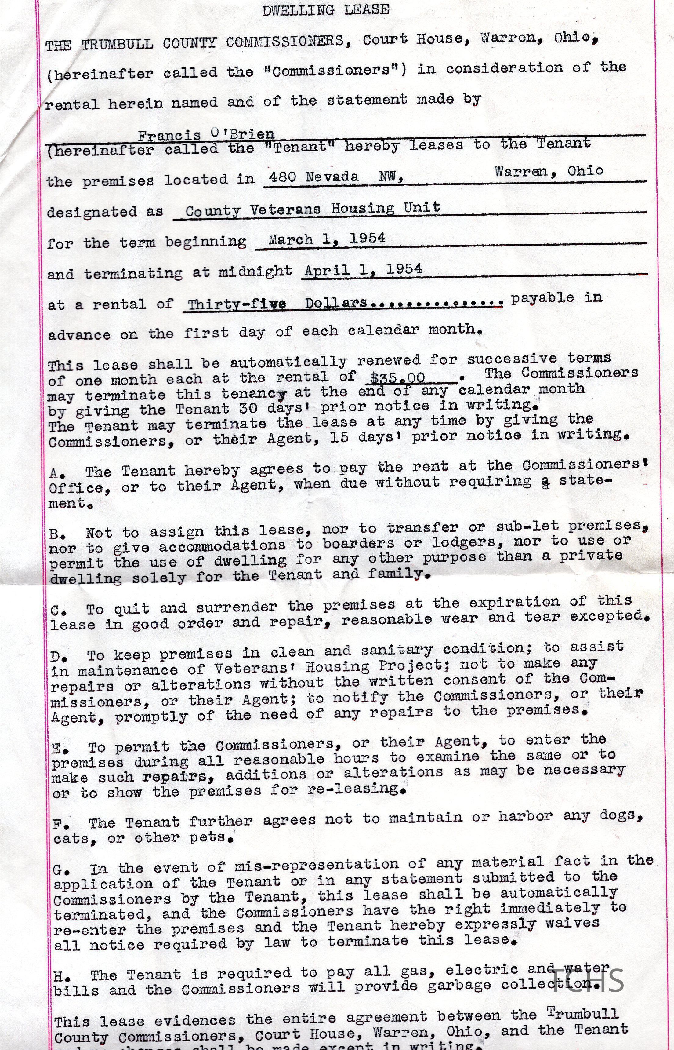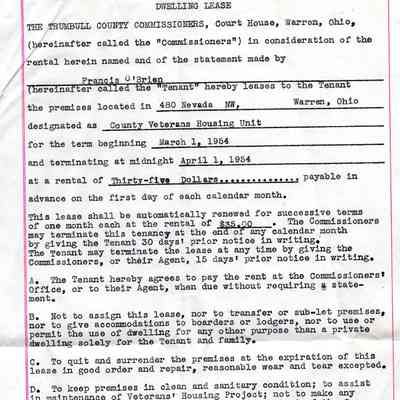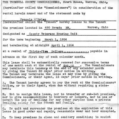 A Dwelling Lease document from the Trumbull County Commissioners office for the tenant Francis O'Brien, located at 480 Nevada NW, Warren, OH. Dated March 1st, 1954 to April 1st, 1954.Acquisition