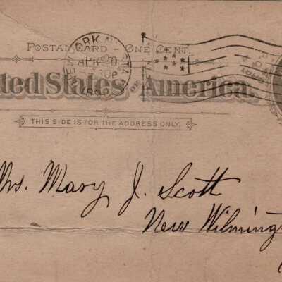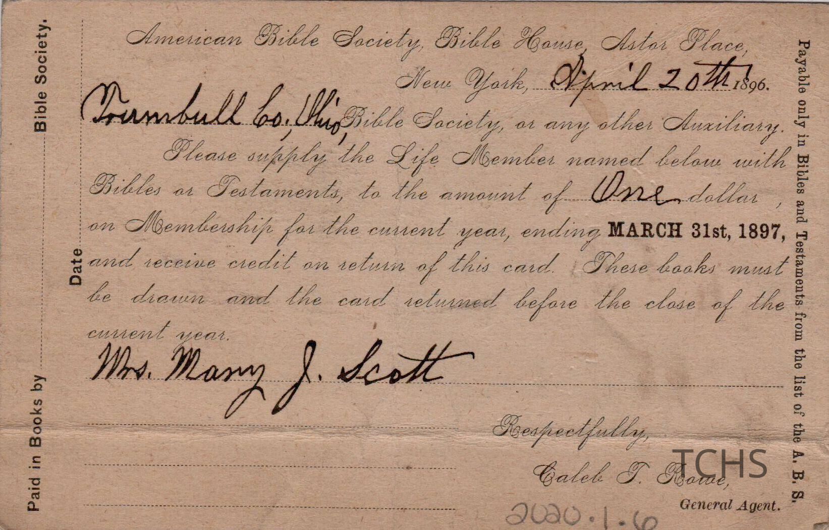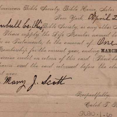Membership card for Mary J. Scott from the Trumbull County Bible SocietyLocation