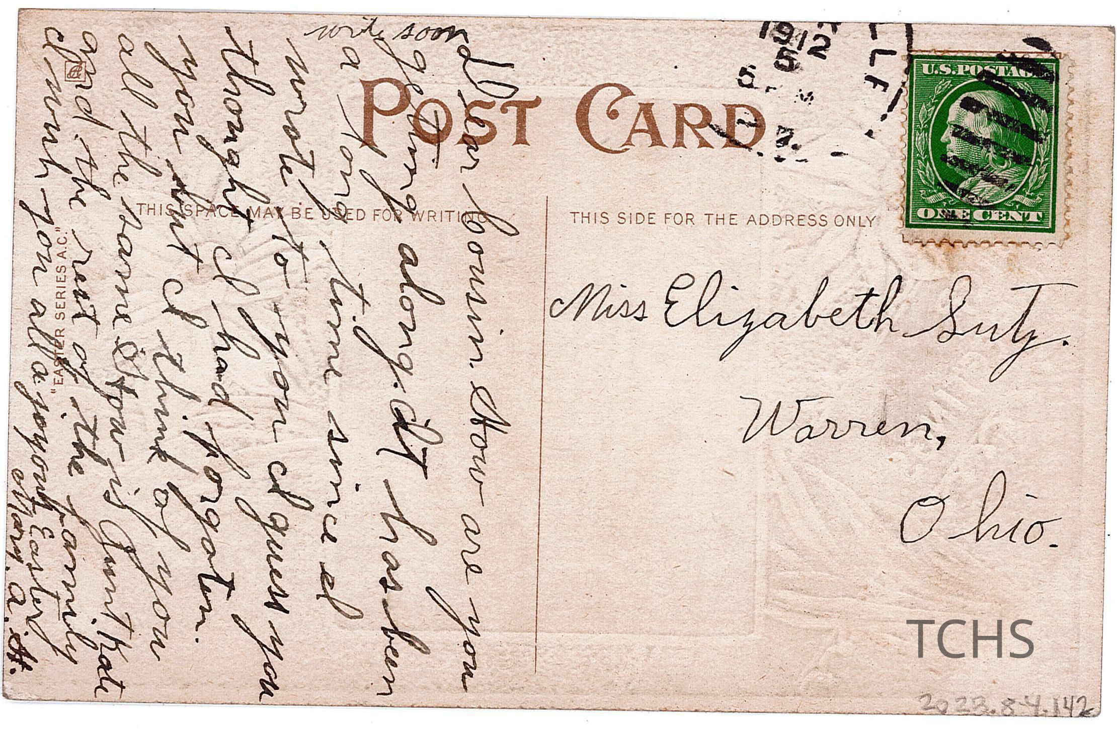 An Easter postcard to Elizabeth "Lizzie" Lutz from Mary A. H., dated 1912.Acquisition