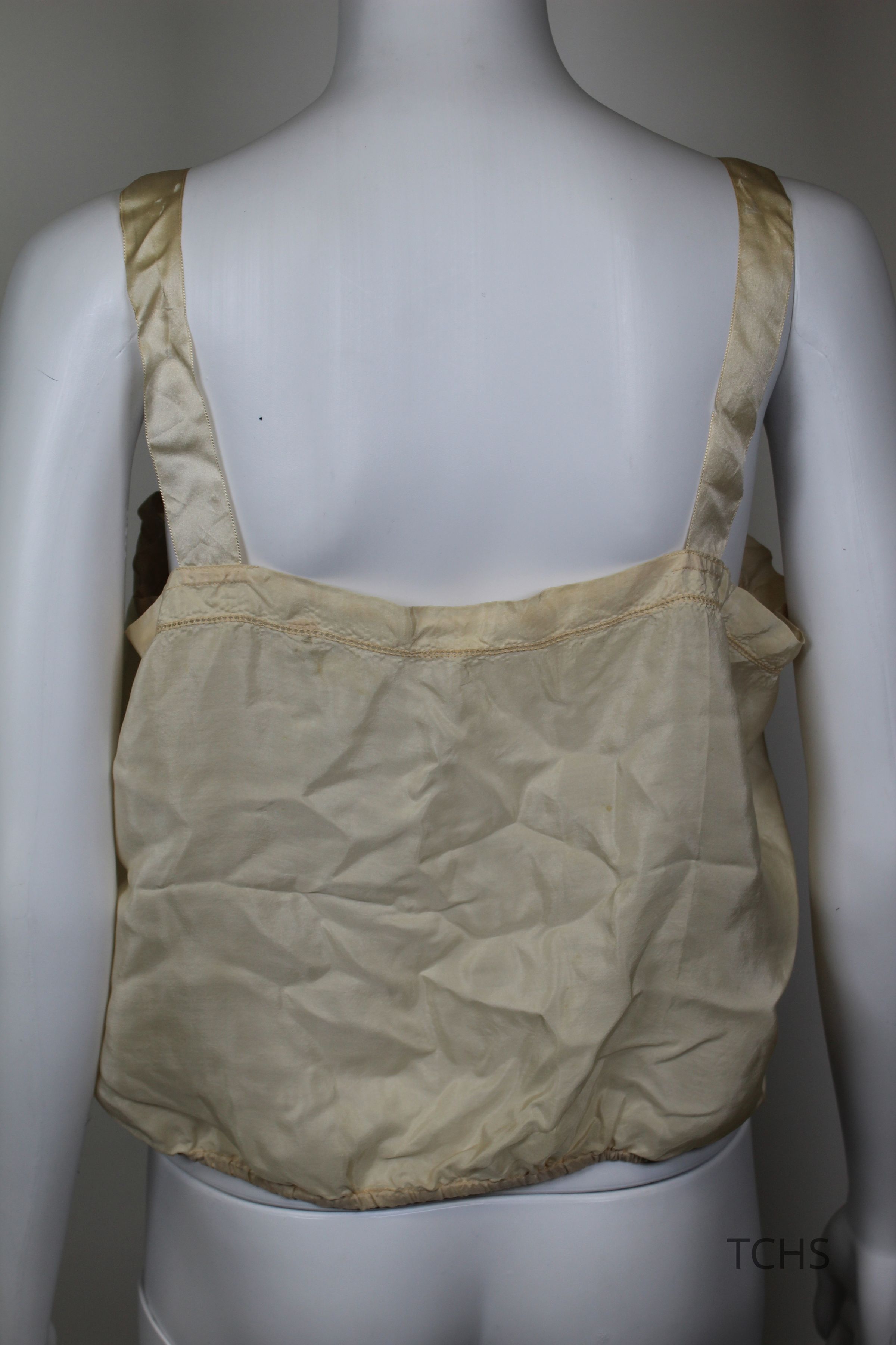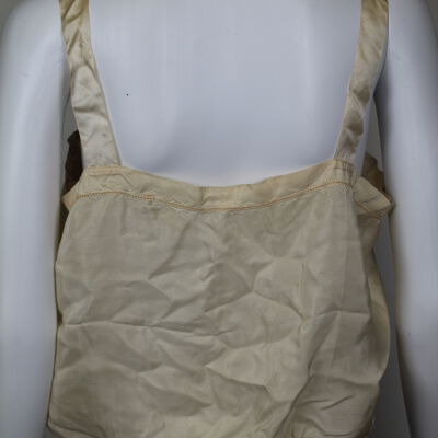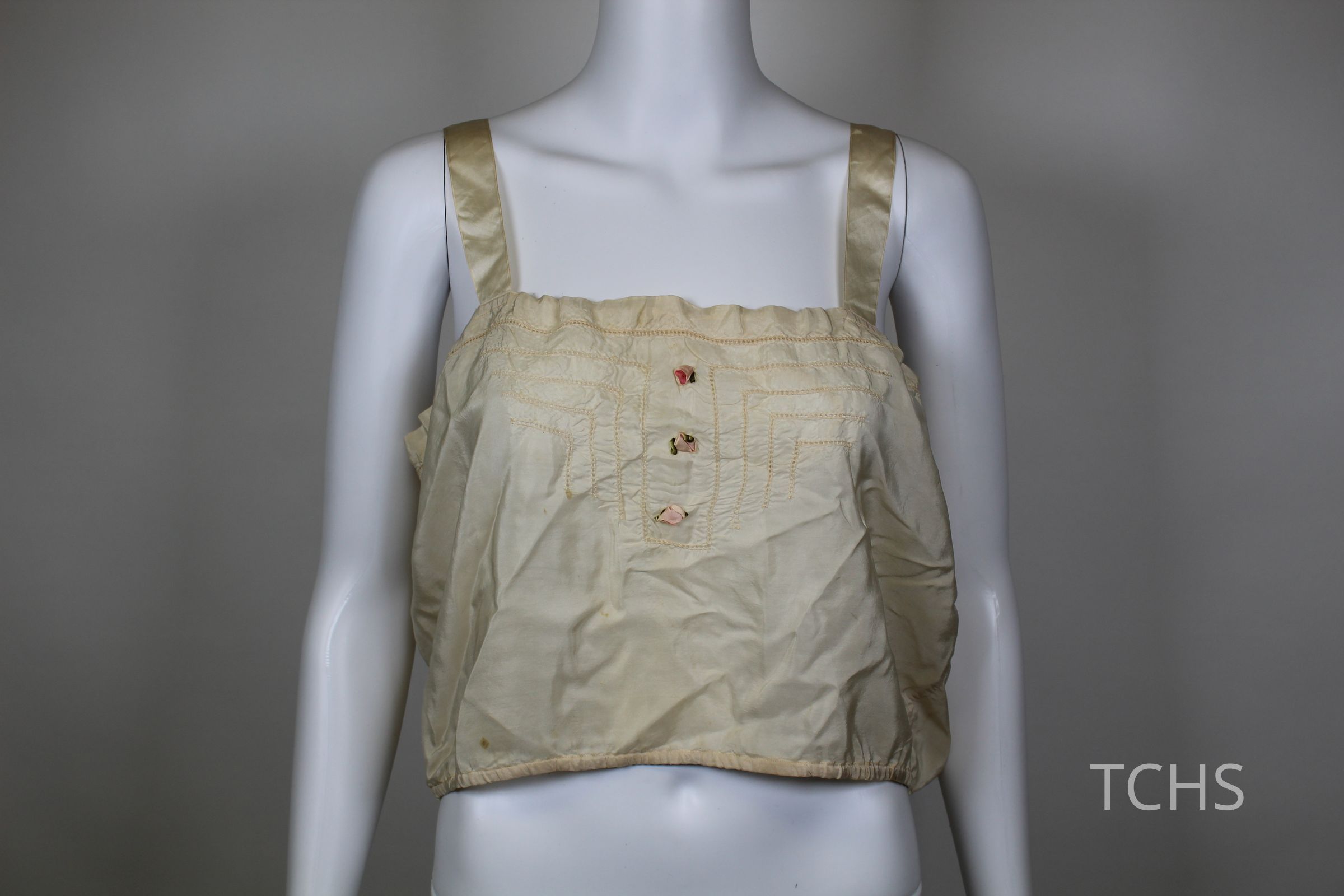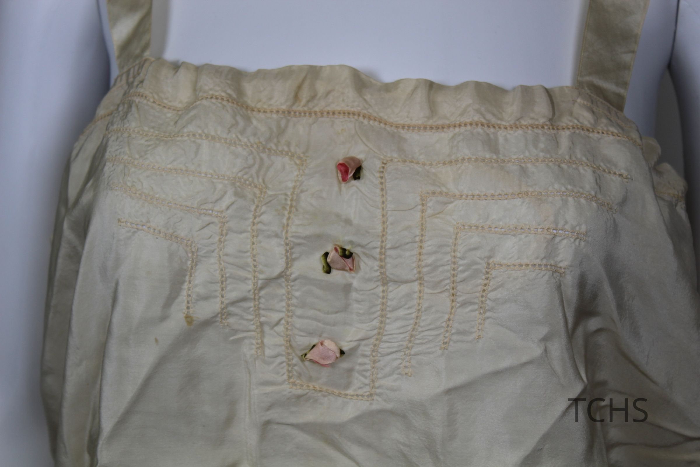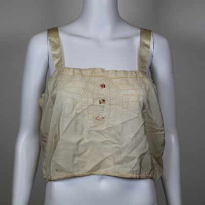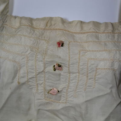 A ecru silk camisole top with three fabric rosebuds down the front.