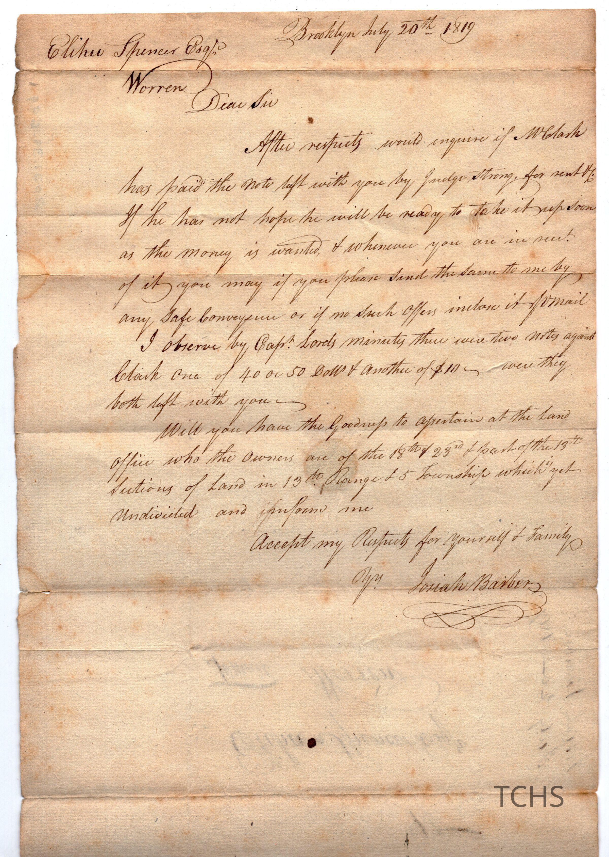 Letter written to Elisha Spencer of Warren. From Josiah Barber, Brooklyn.Collection
