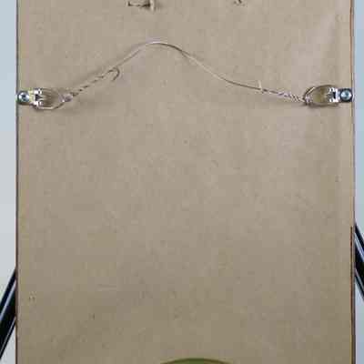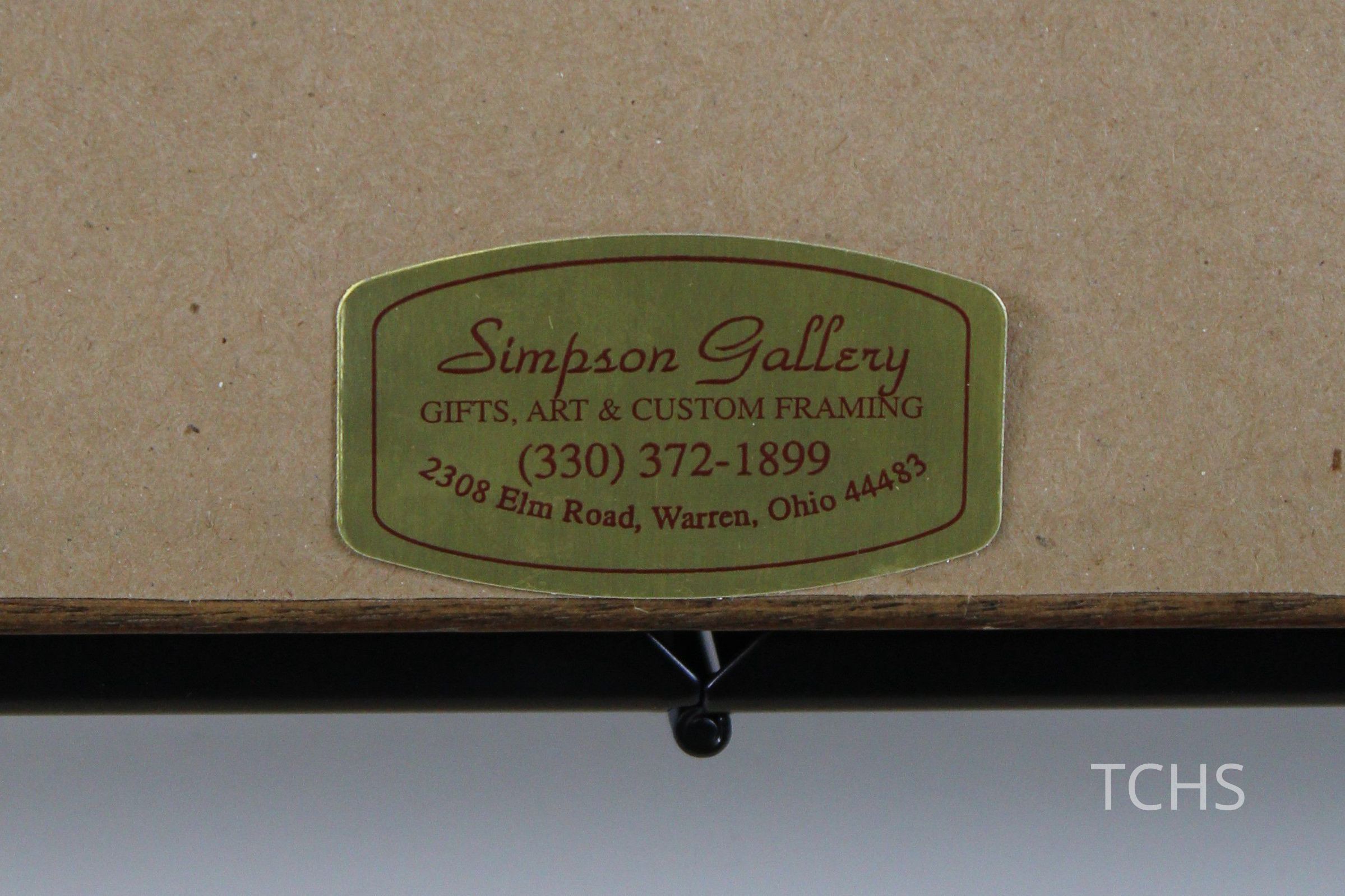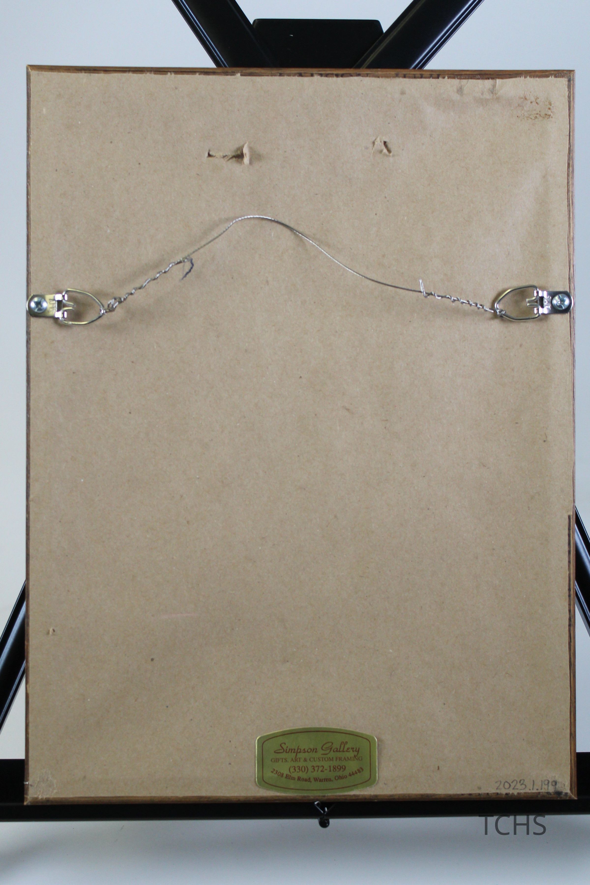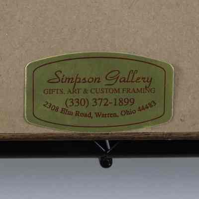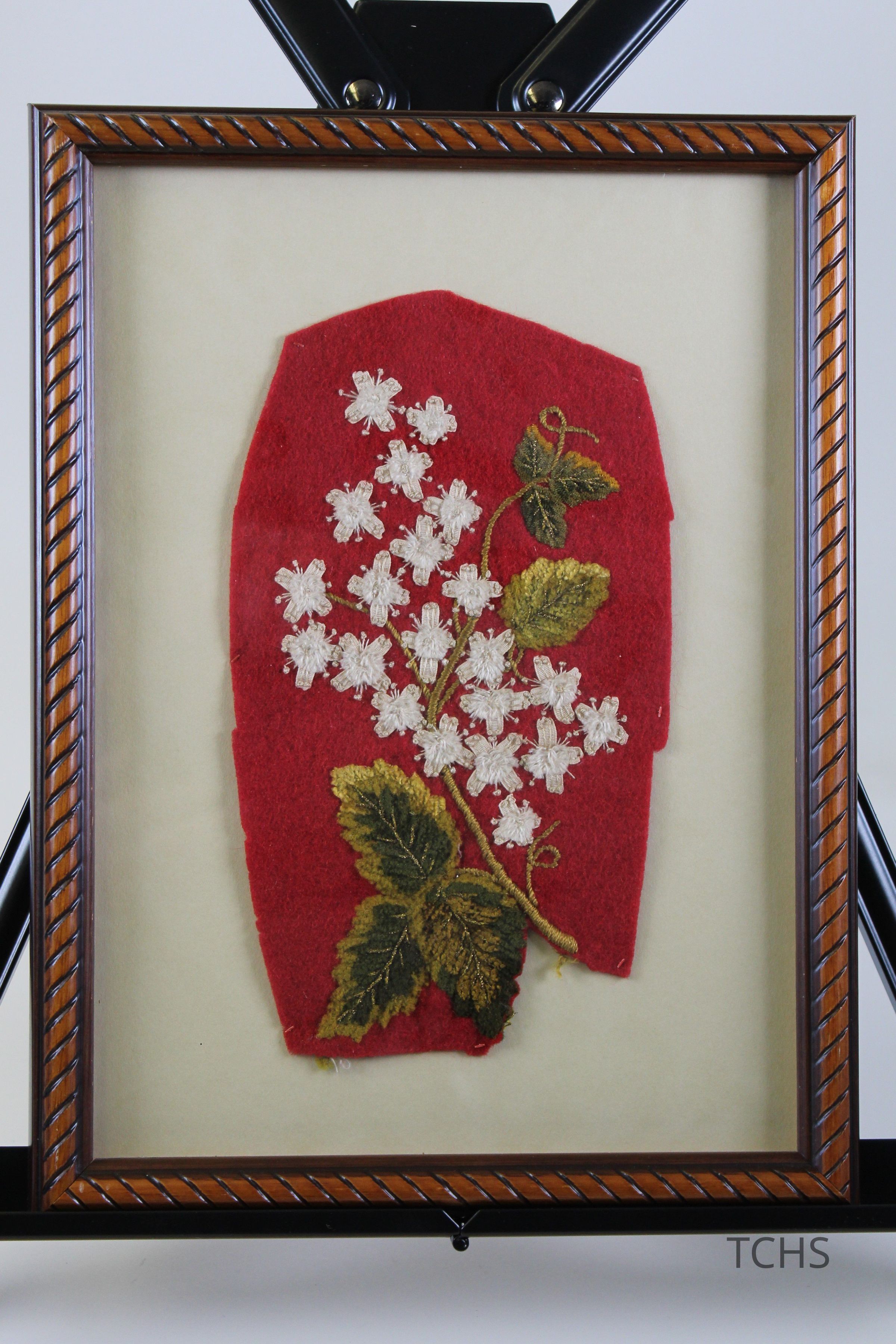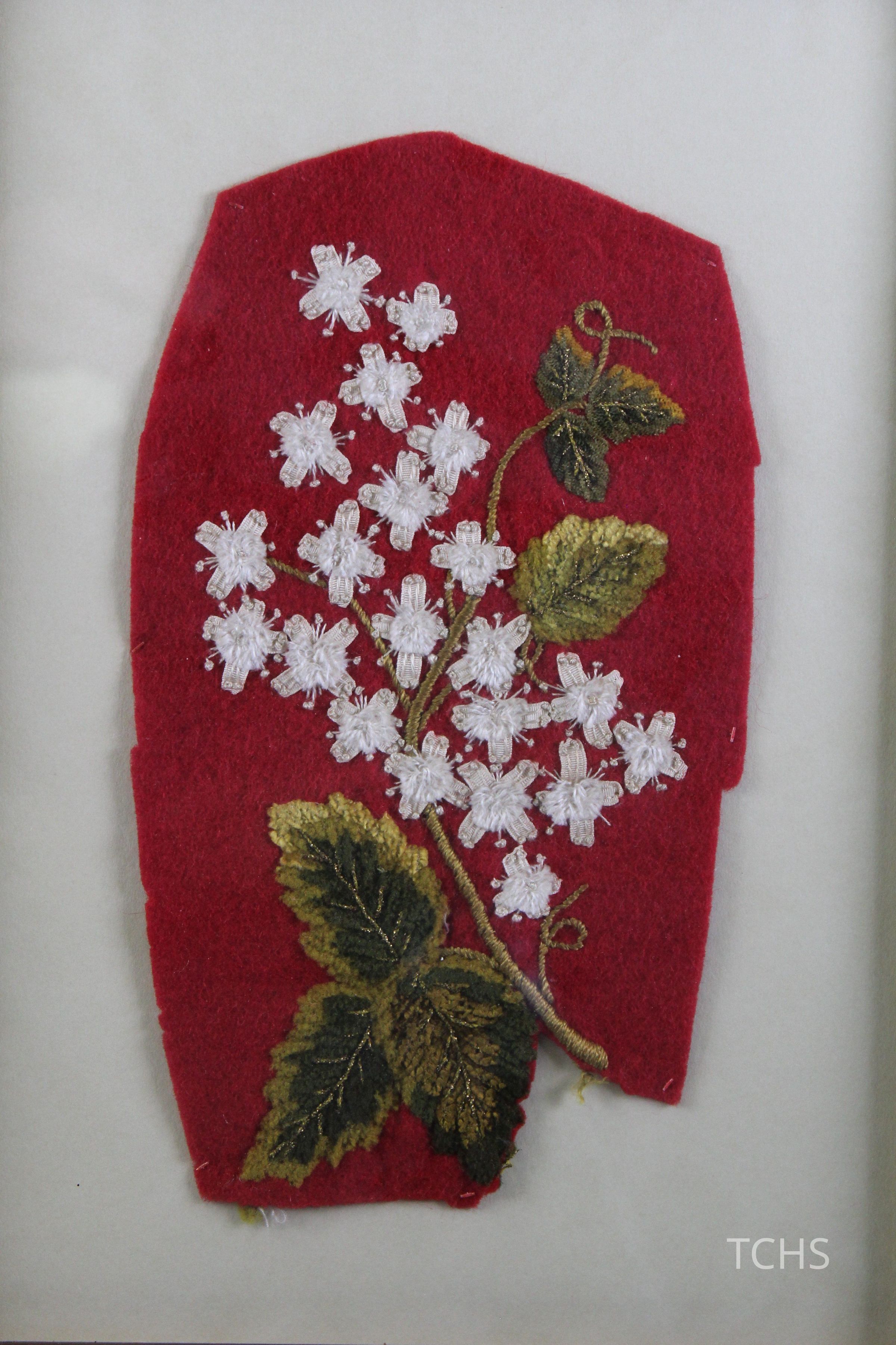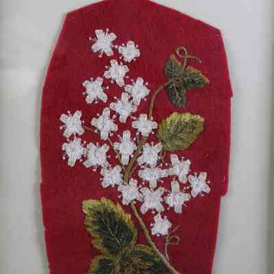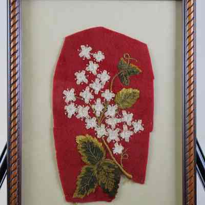 Embroidered white flowers on red felt in a brown frame; there is a sticker on the back for Simpson Gallery located at 2308 Elm Road, Warren, Ohio.Location