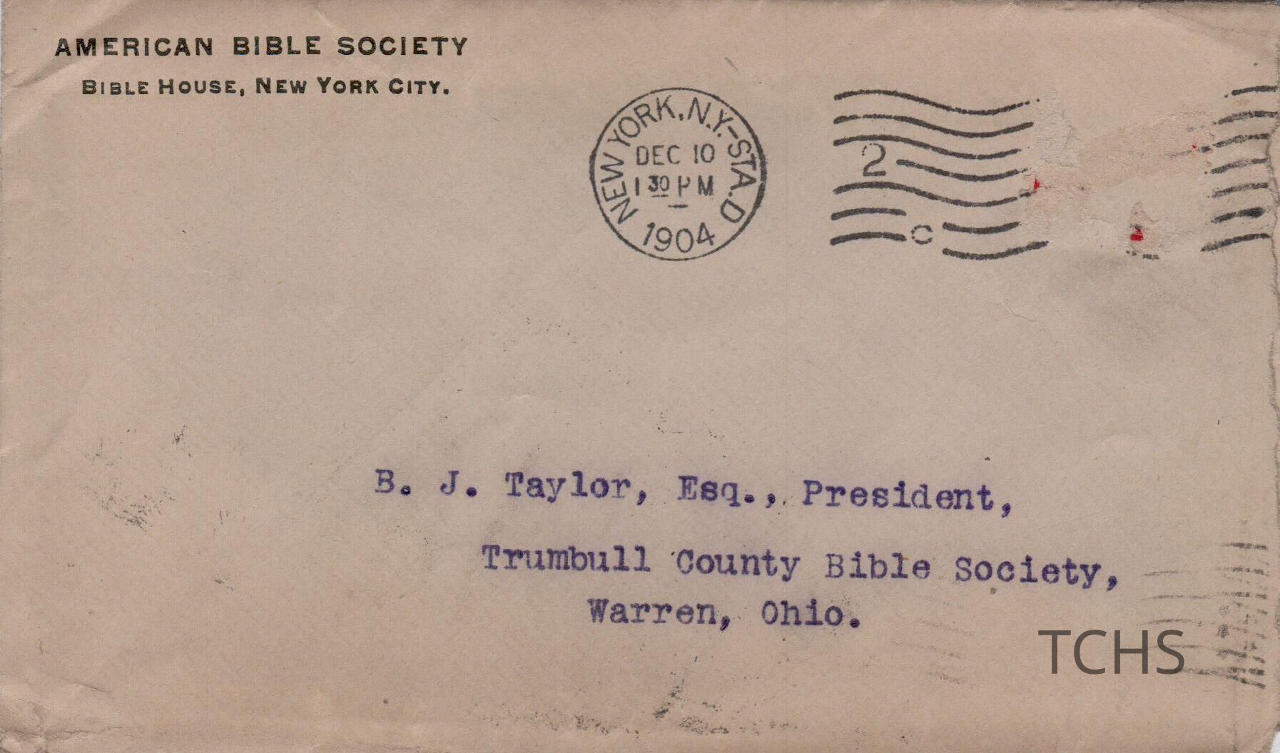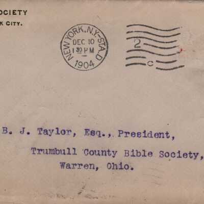 Envelope addressed to B. J. Taylor, president of the Trumbull County Bible Society