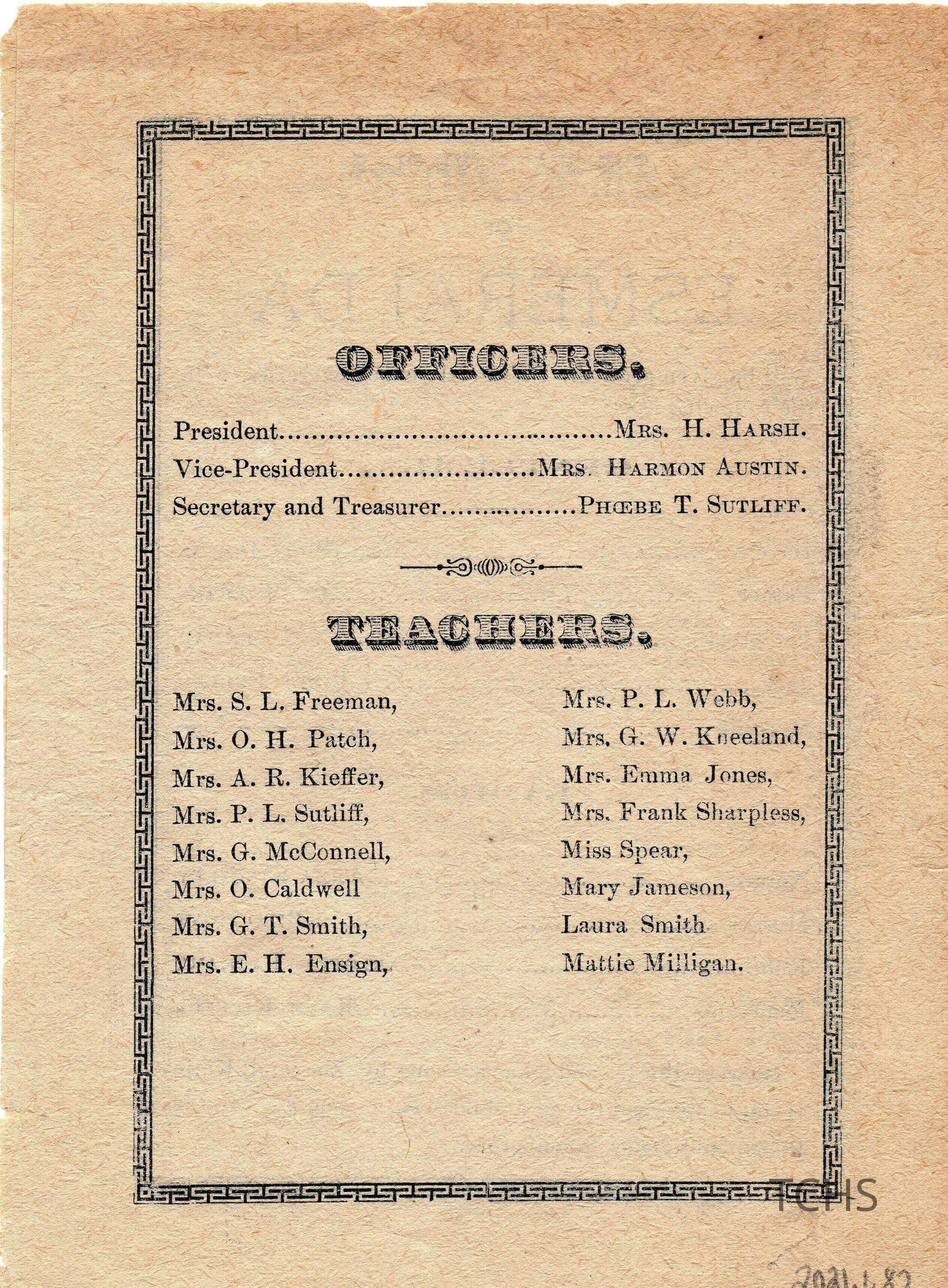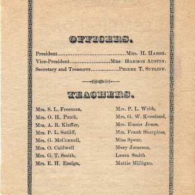 Kieffer, Kate, Brown, Reenie, Smith, Rev. G. T., Ratliff, Jennie, Hoyt, Bird, Smith, Elsie, Sharpless, Mrs. Frank, Harsh, Mrs. H., Sutliff, Phoebe Temperance, Kieffer, Mrs. A.R., Mentzer, Ada, Oxner, Louise, Grimm, Annie, Gartner, Vina, Jameson, Mary, Freeman, Mrs. S.L., Patch, Mrs. O.H., Kingsley, Anna, Jones, Emma, Caldwell, Mrs. O., Shoenberger, Daisy, Sutliff, Phoebe T., Webb, Mrs. P. L., Mentzer, Eva, Fuller, Burt, Wilkins, C., Raible, Barbara, Calendar, C., Ensign, Mrs. E. H., Cowan, Mina, Salen, Jessie, Kaiser, Annie, Brown, Rosa, Mentzer, Katie, Hoyt, Clara, Milligan, Mattie, Austin, Mrs. Harmon, Spear, Miss, Downs, Burt, Thomas, Hattie, Bishop, Minnie, Sutliff, Mrs. P. L., Whitman, Ella, Smith, Mrs. G. T., Packard, Carlotta, Smith, Laura, Kneeland, Mrs. G. W., McConnell, Mrs. G., Morgan, Sadie