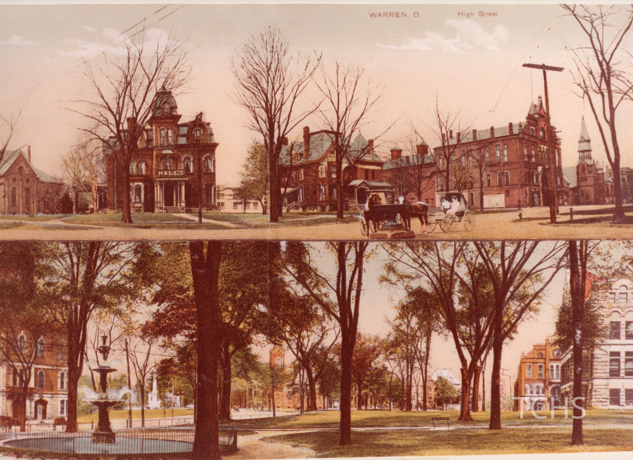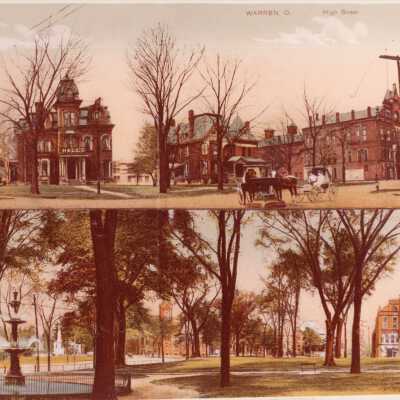 Large copy of a postcard depicting High Street, Warren on photo paper. Postcard has two scenes, one on top and one on bottom, presumed two sides of High. oversized, not fully scannedCollection