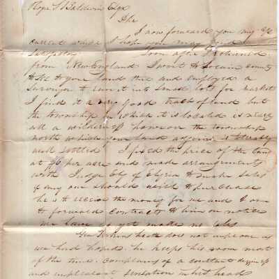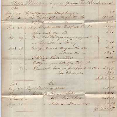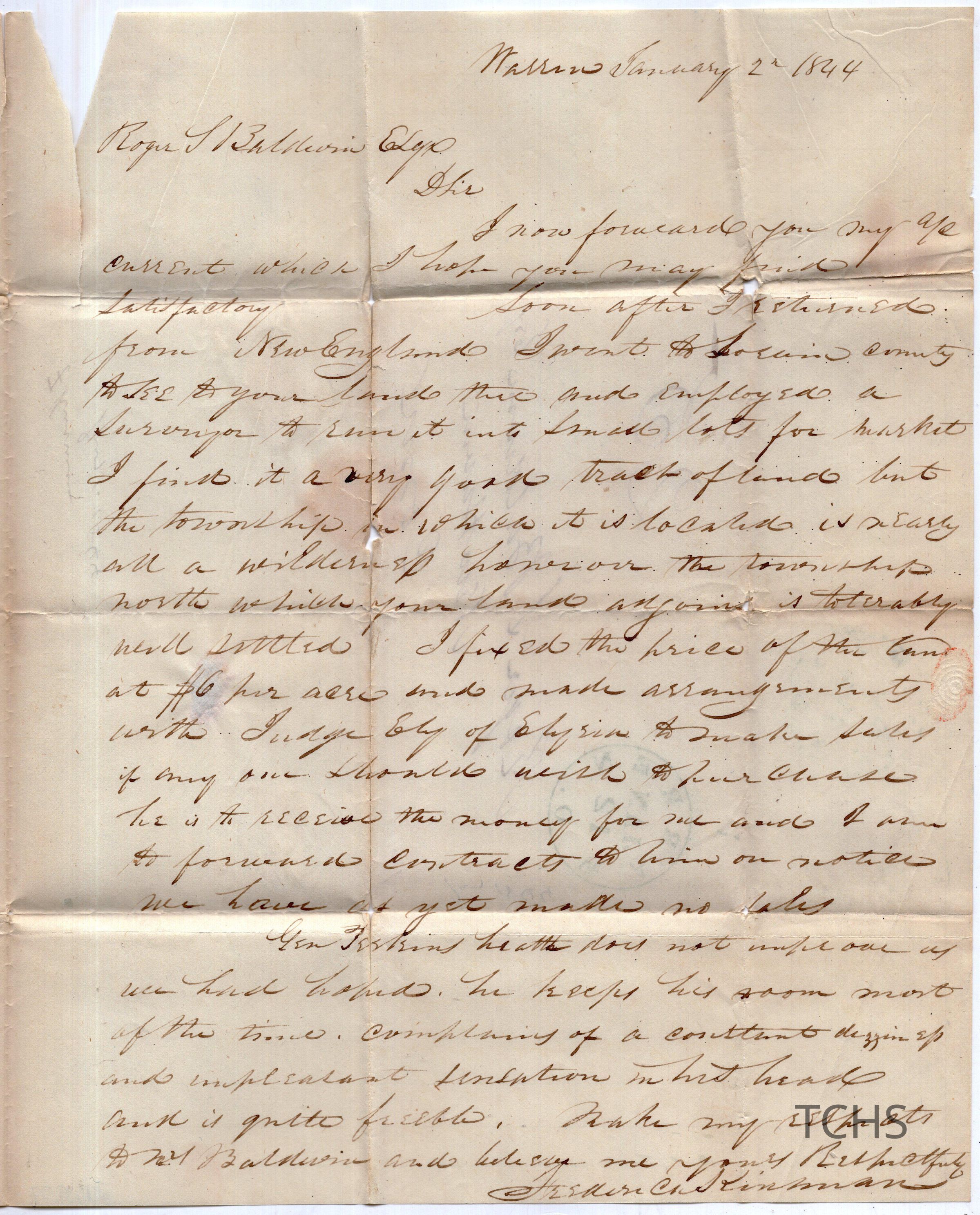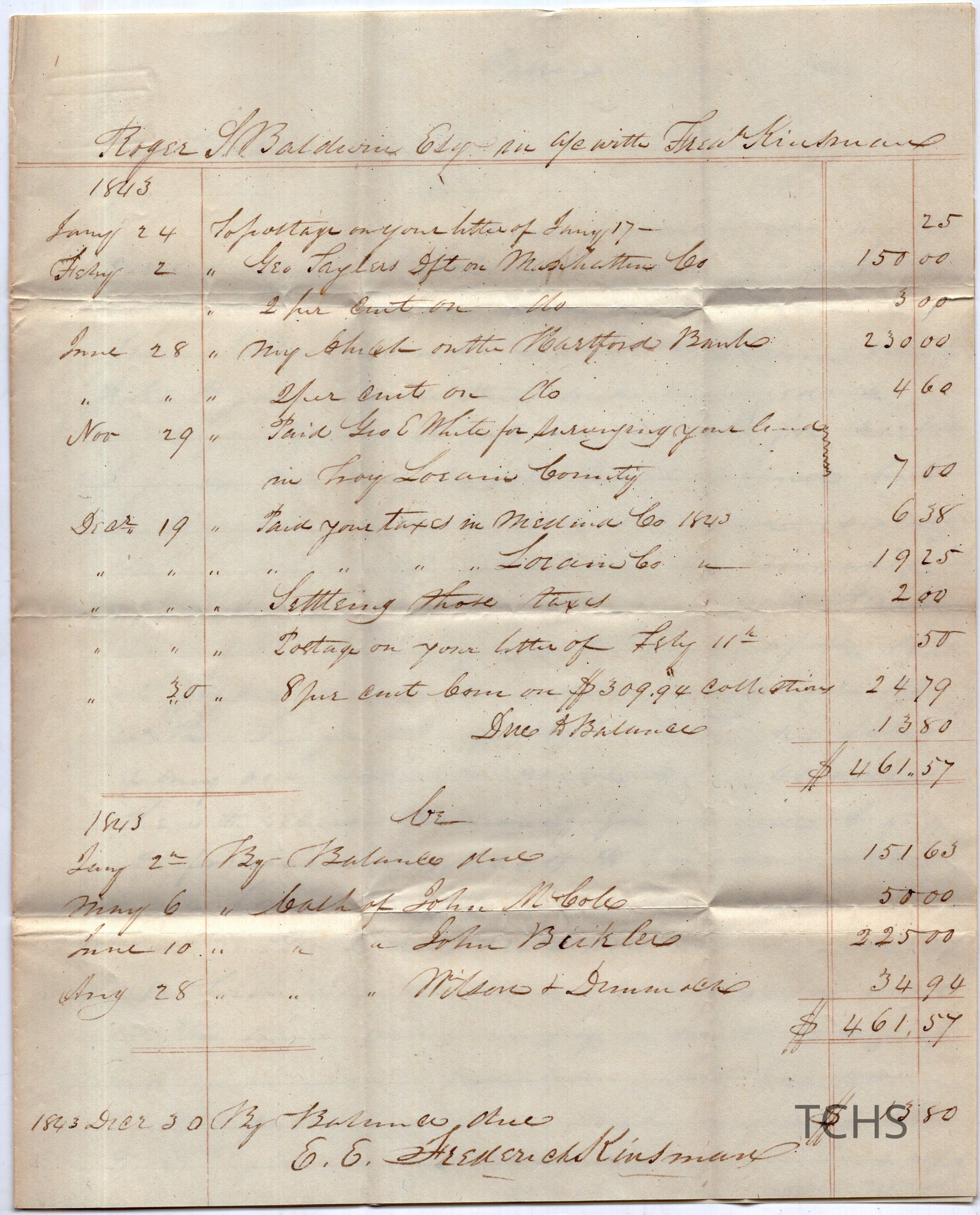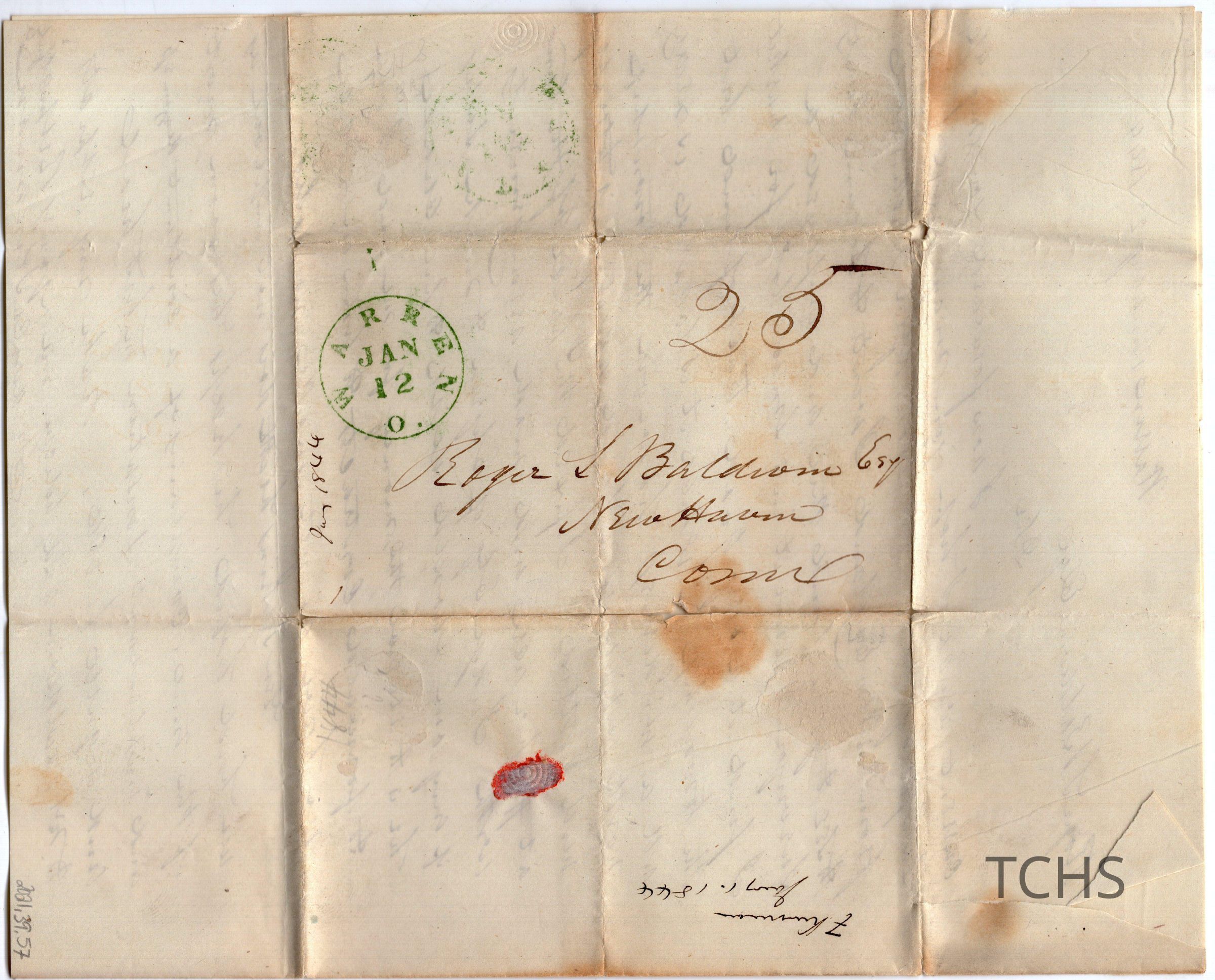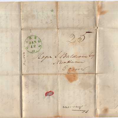 Letter to Roger L. Baldwin, New Haven CT from Frederick Kinsman of Warren. Ledger of account details for the year 1843. Greenish postal mark ink color and "25" handwritten.