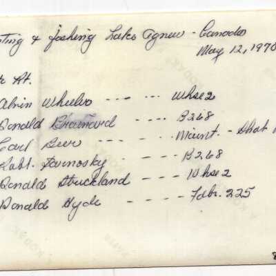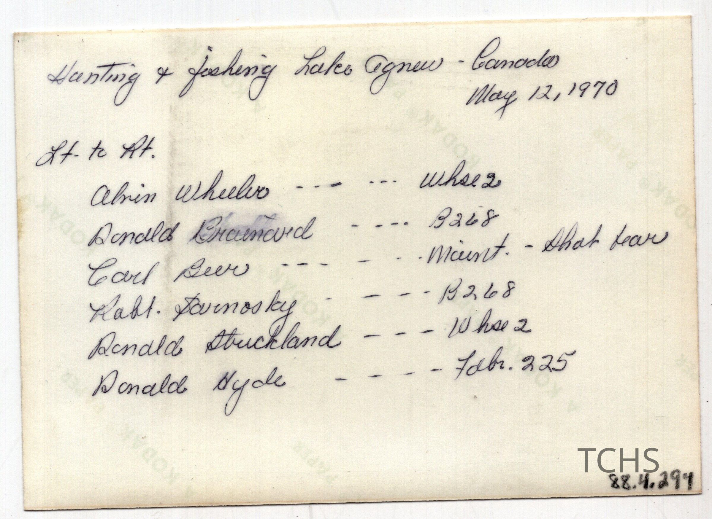 On back "Hunting and Fishing Lake Agnew Canada May 12, 1970" along with names and unidentified factor.