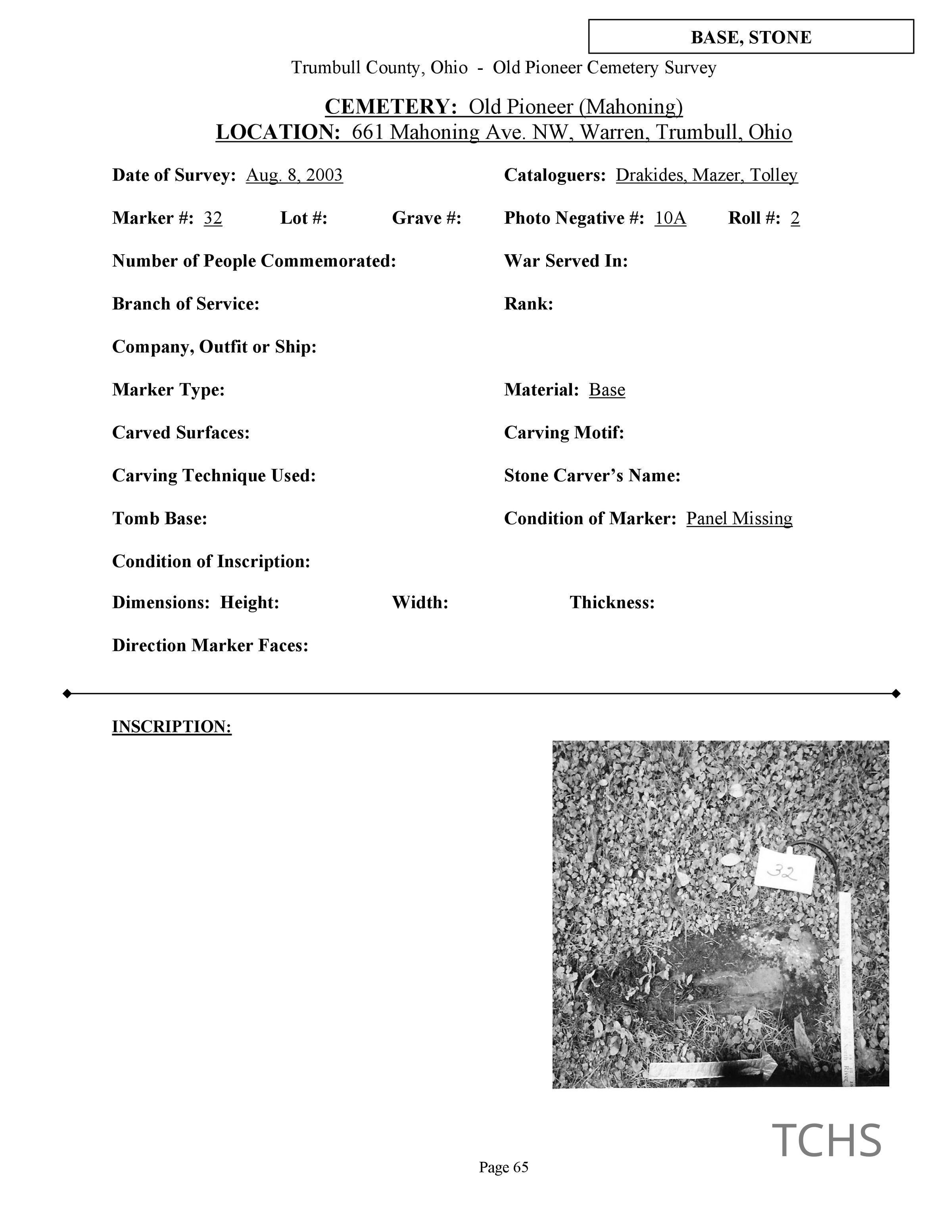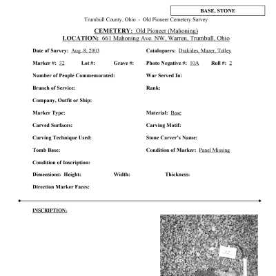 This page was compiled by the Trumbull County Genealogical Society during a 2002-2004 survey of Old Mahoning Cemetery.