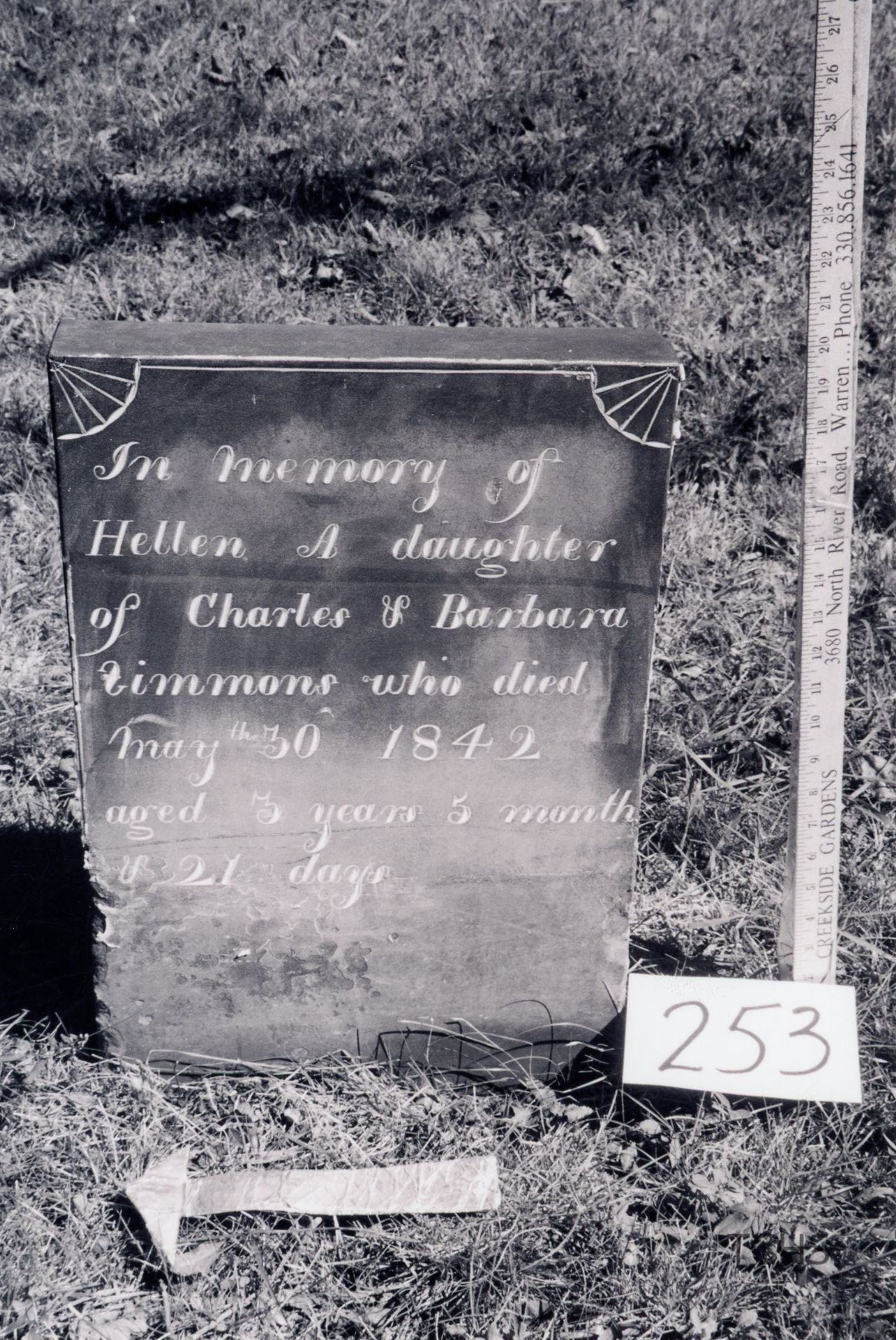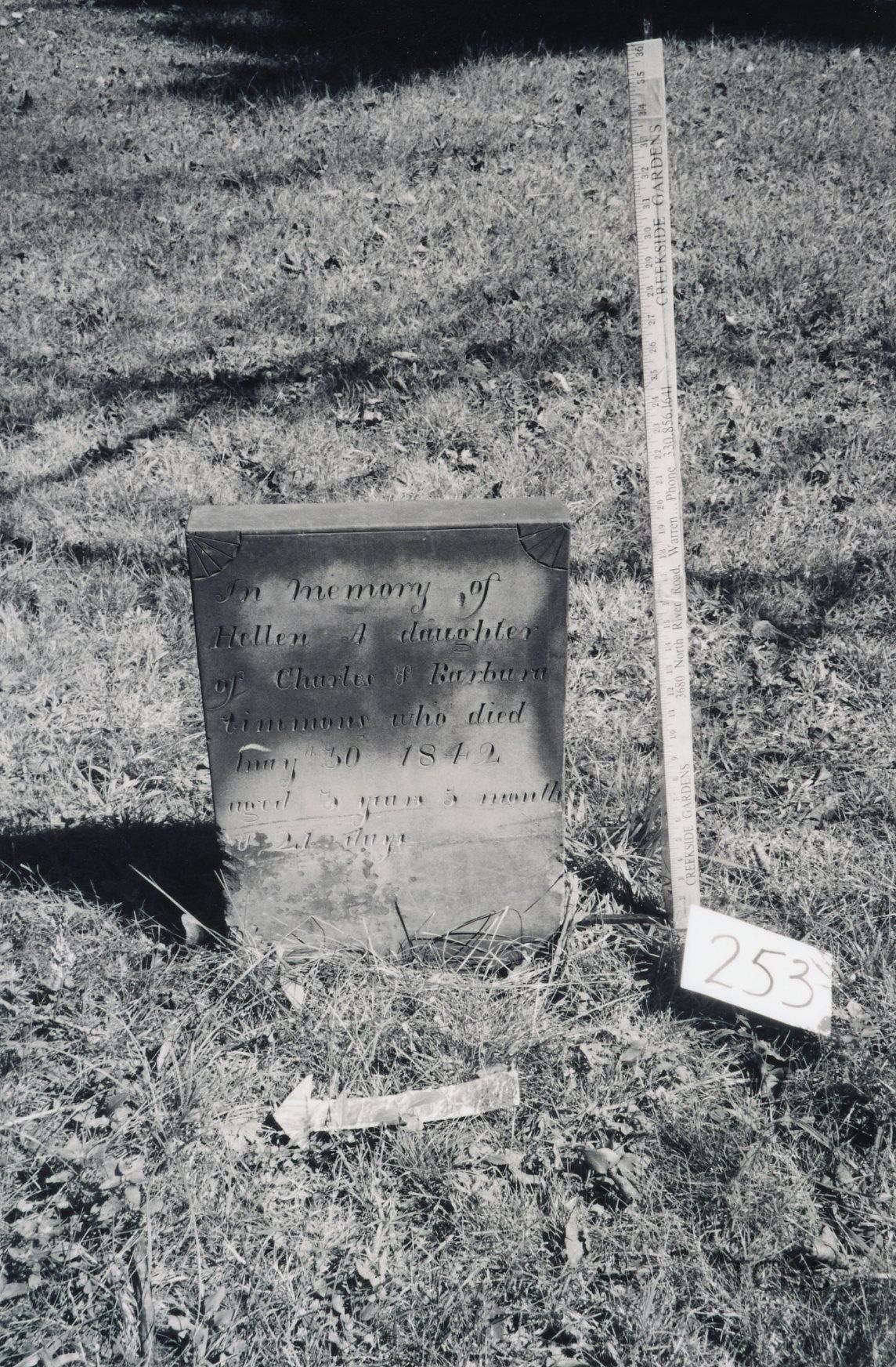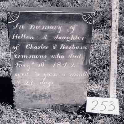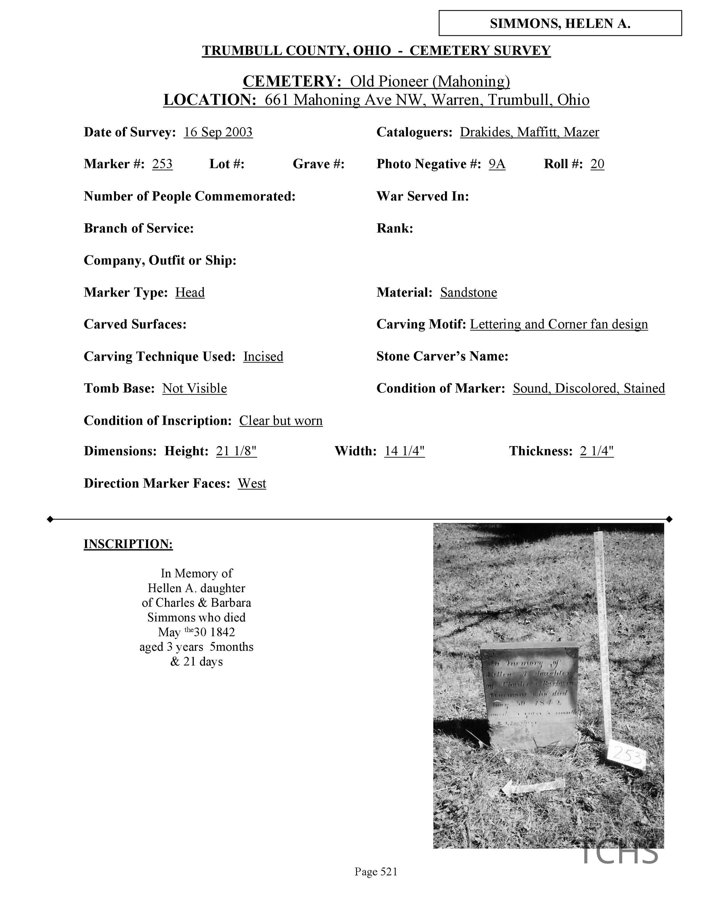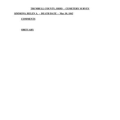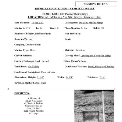 Helen A. Simmons died May 30, 1842 at the age of 3 and is buried at the Old Mahoning (Pioneer) Cemetery.