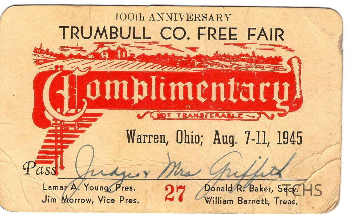 100th anniversary Trumbull County Free Fair complimentary pass for Judge and Mrs. Griffith