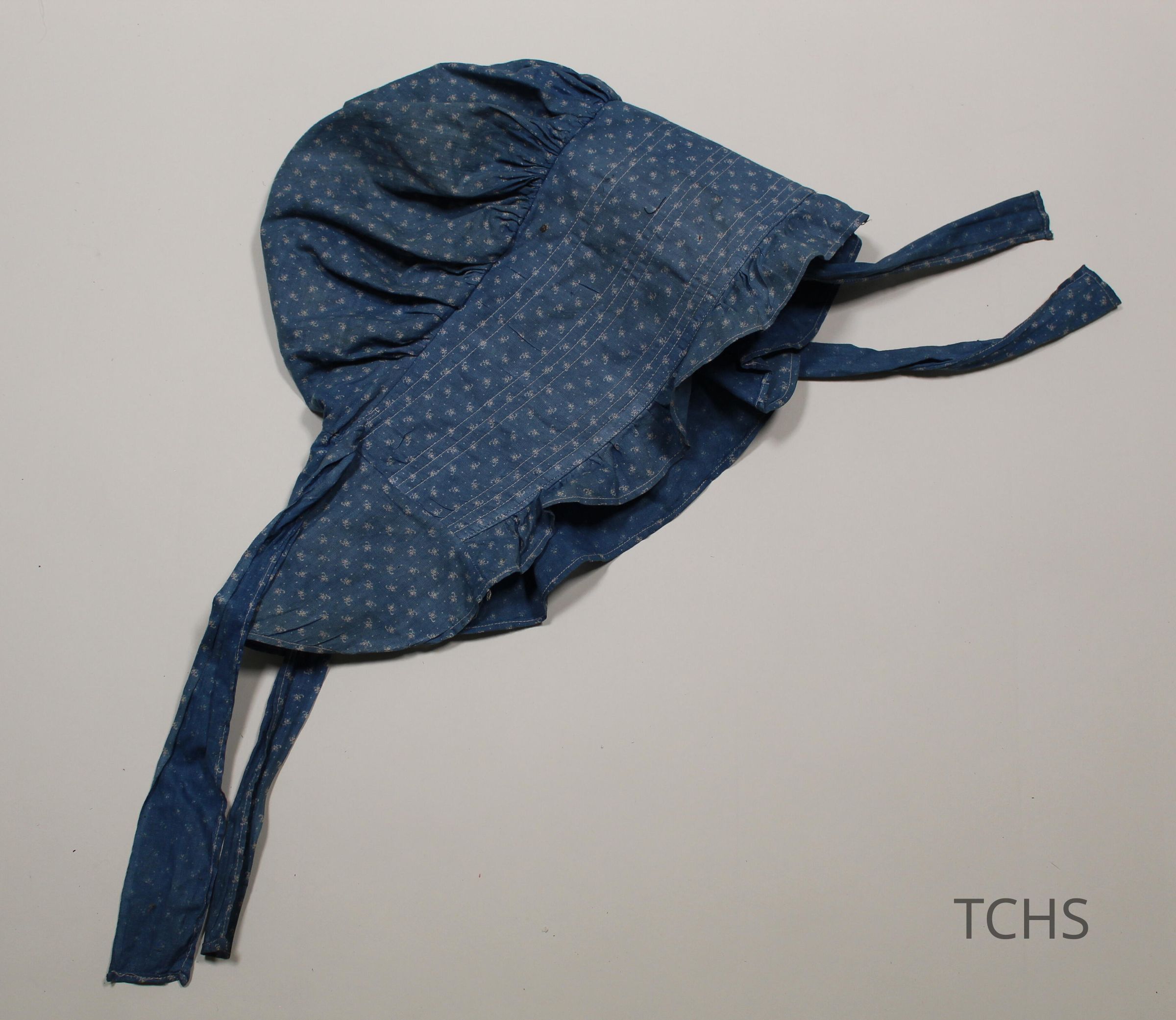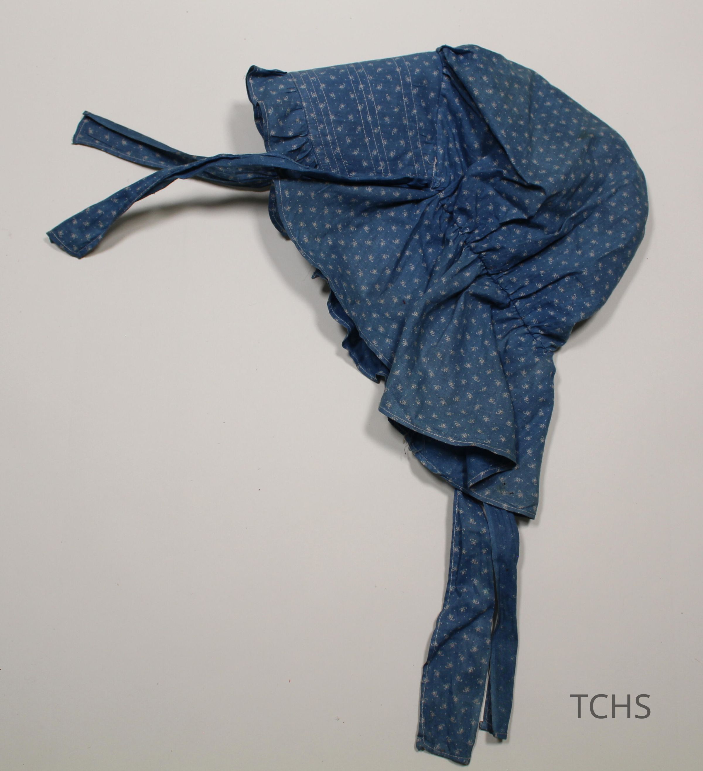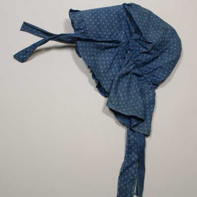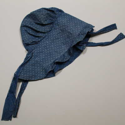 Cotton twill blue calico bonnet. Some loss of color and evidence of staining. Four ribbons in total of the same material. Two 13.25"L ribbons are located in the back, two 11.5"L ribbons located inside the bonnet. 5.5" brim.Collection