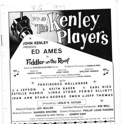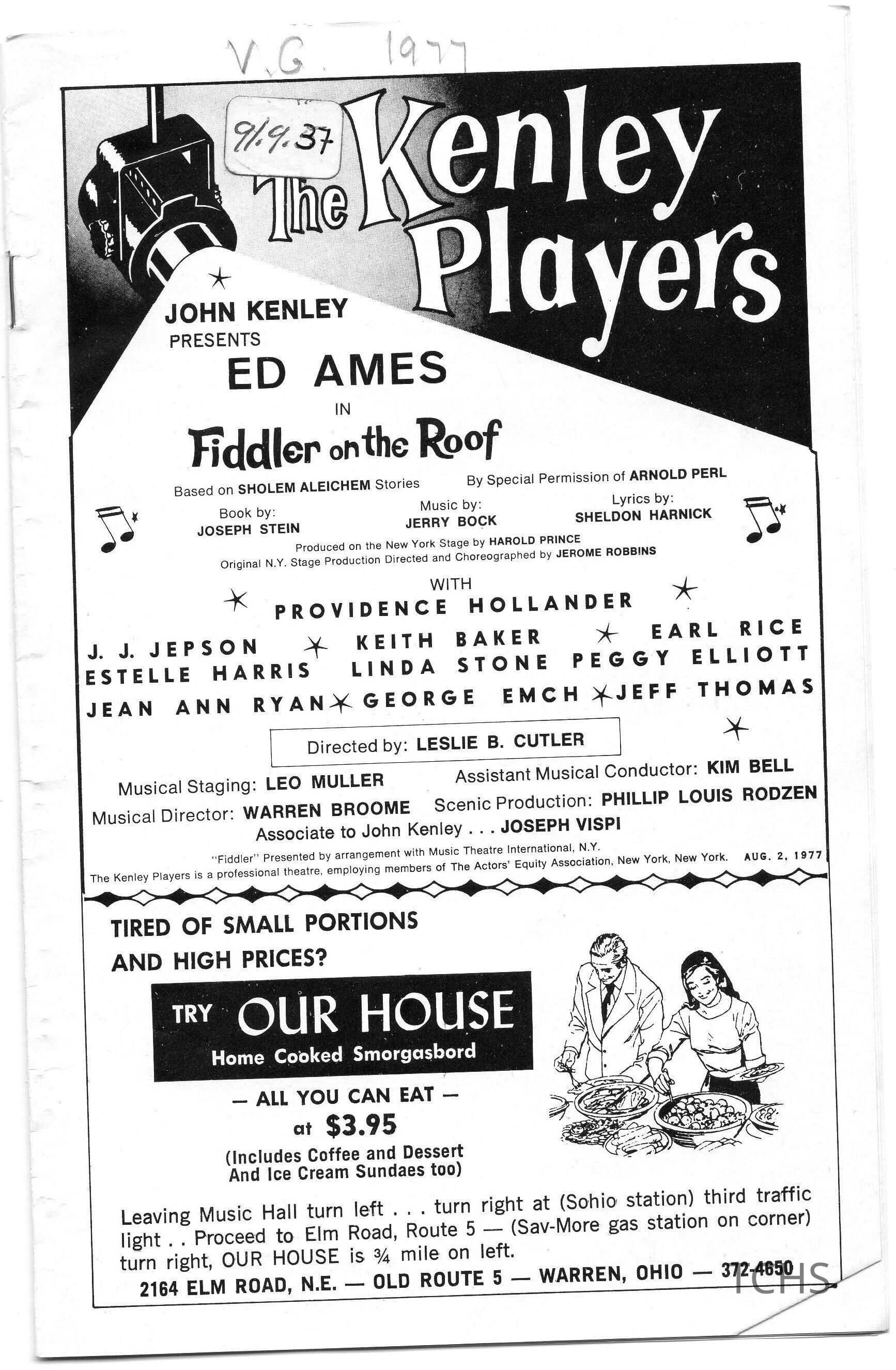 Robbins, Jerome, Hollander, Providence, Baker, Keith, Harris, Estelle, Emch, George, Rice, Earle, Kenley, John, Aleichem, Sholem, Stone, Linda, Stein, Joseph, Harnick, Sheldon, Elliott, Peggy, Kenley Players, Thomas, Jeff, Ames, Ed, Jepson, J. J., Bock, Jerry, Prince, Harold, Ryan, Jean Ann, Perl, Arnold, Cutler, Leslie, Muller, Leo, Bell, Kim, Broome, Warren, Rodzen, Phil, Vispi, Joseph, Our House
