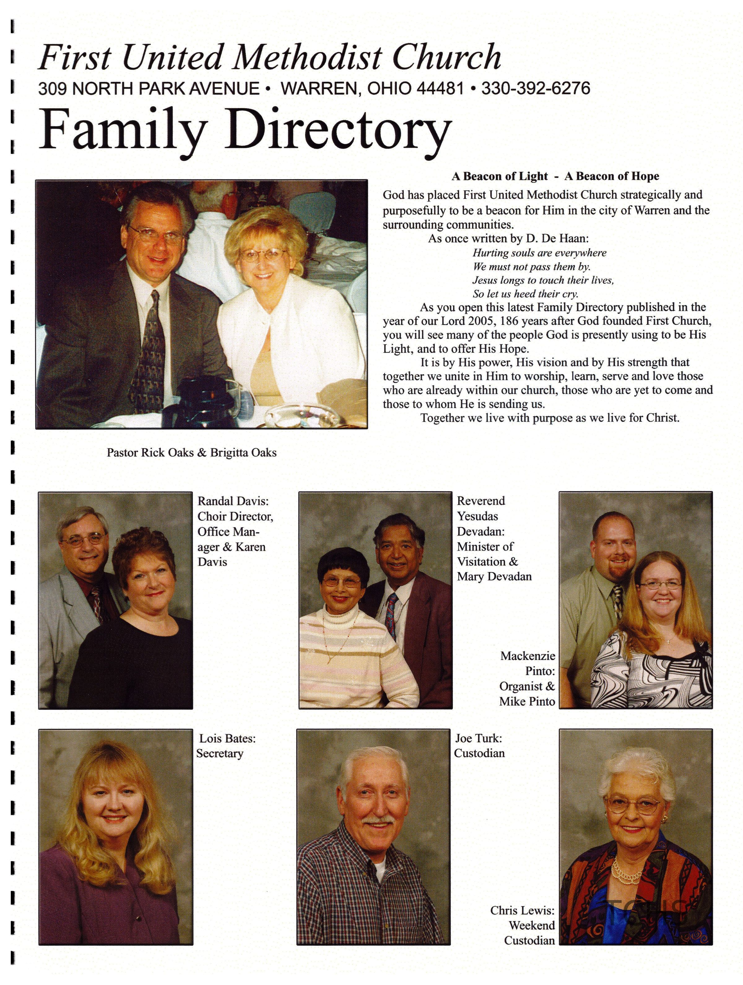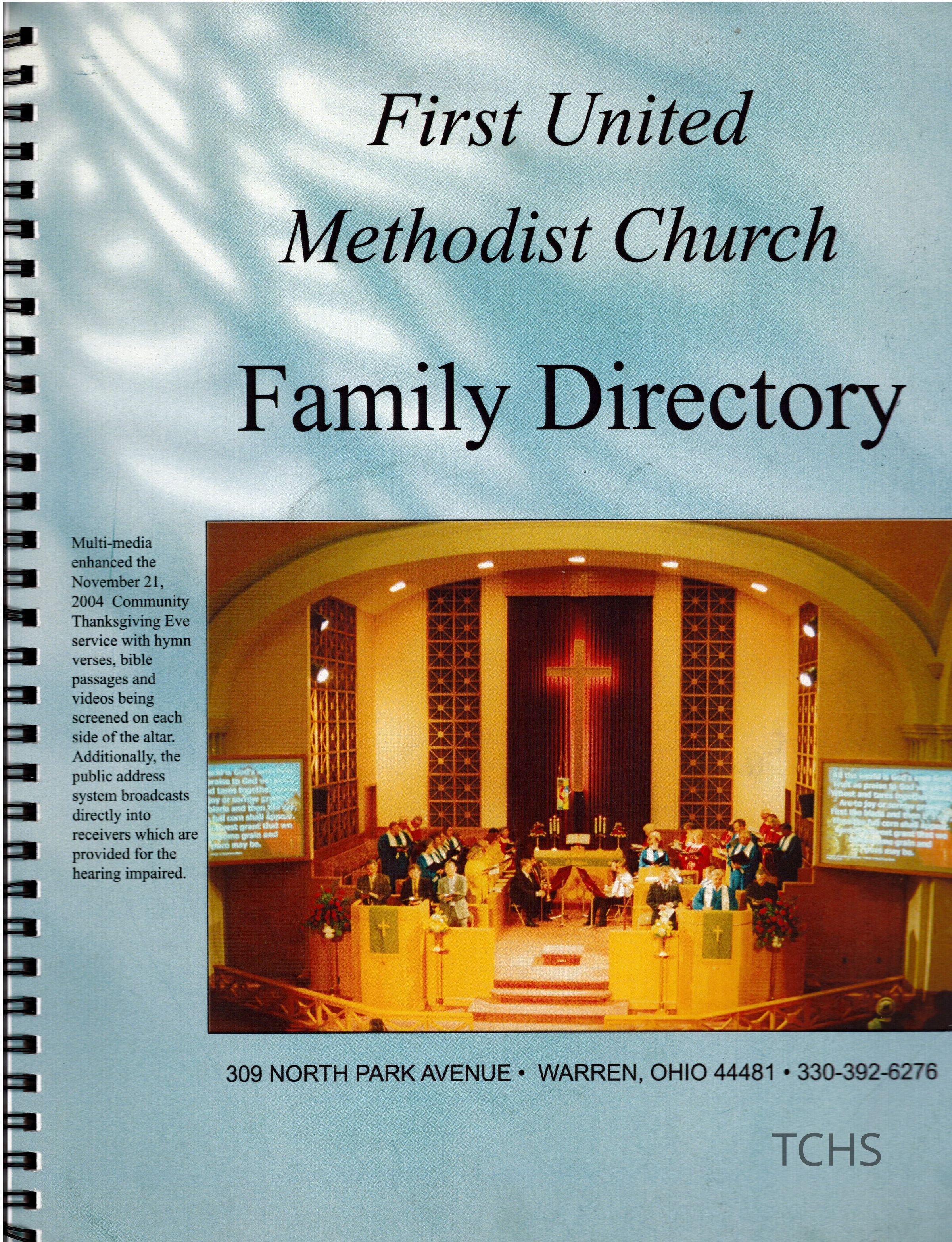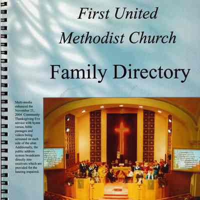 First United Methodist Church Family Directory, featuring a light blue background with the title prominently displayed. On the left side, there is a small text block describing a multimedia-enhanced Thanksgiving Eve service from November 21, 2004, including information about hymn verses, Bible passages, and videos screened on each side of the altar, with an accessible public address system for the hearing impaired.