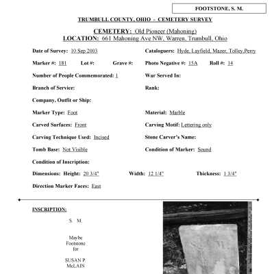 This page was compiled by the Trumbull County Genealogical Society during a 2002-2004 survey of Old Mahoning Cemetery.