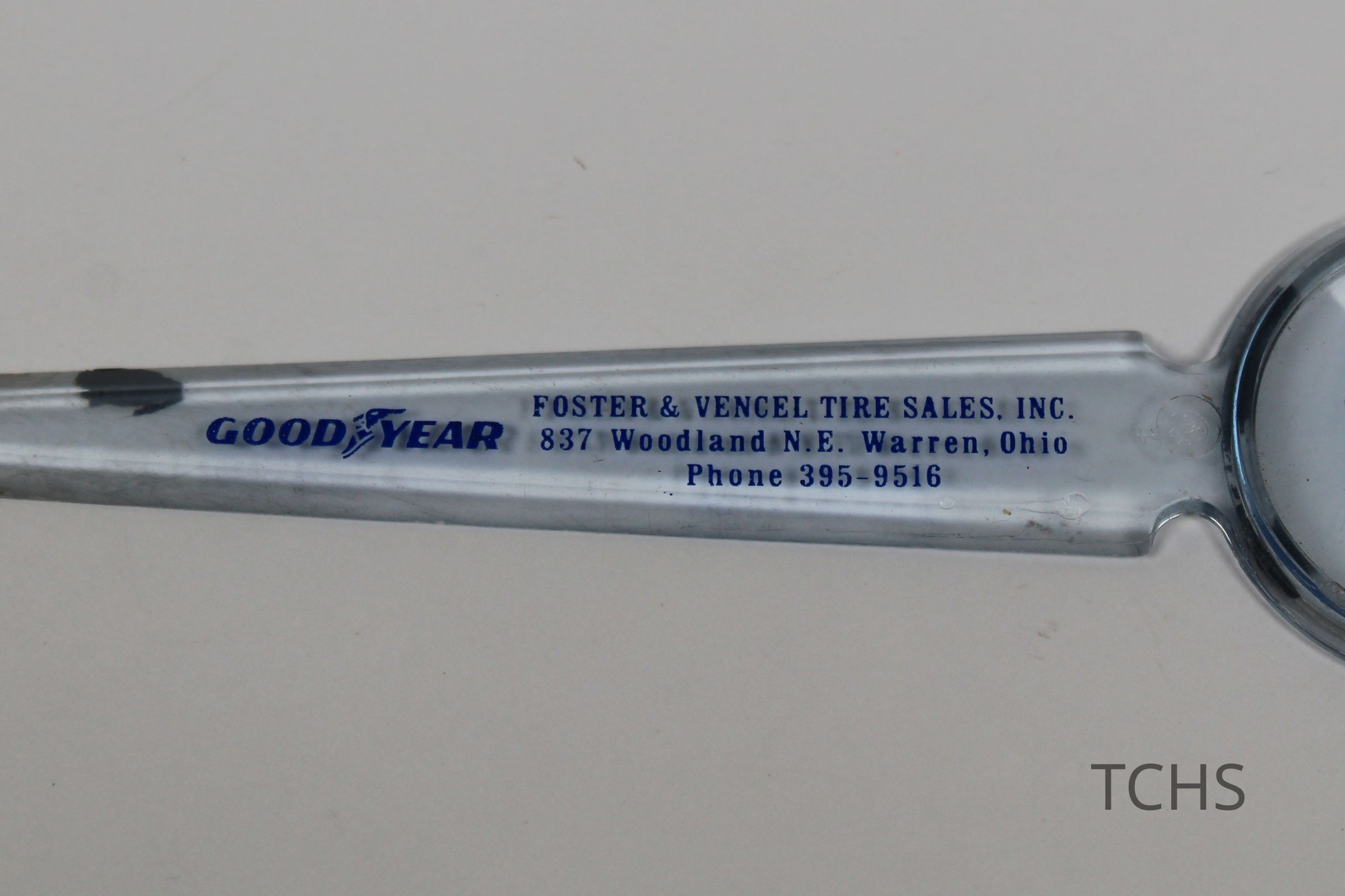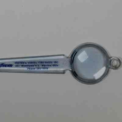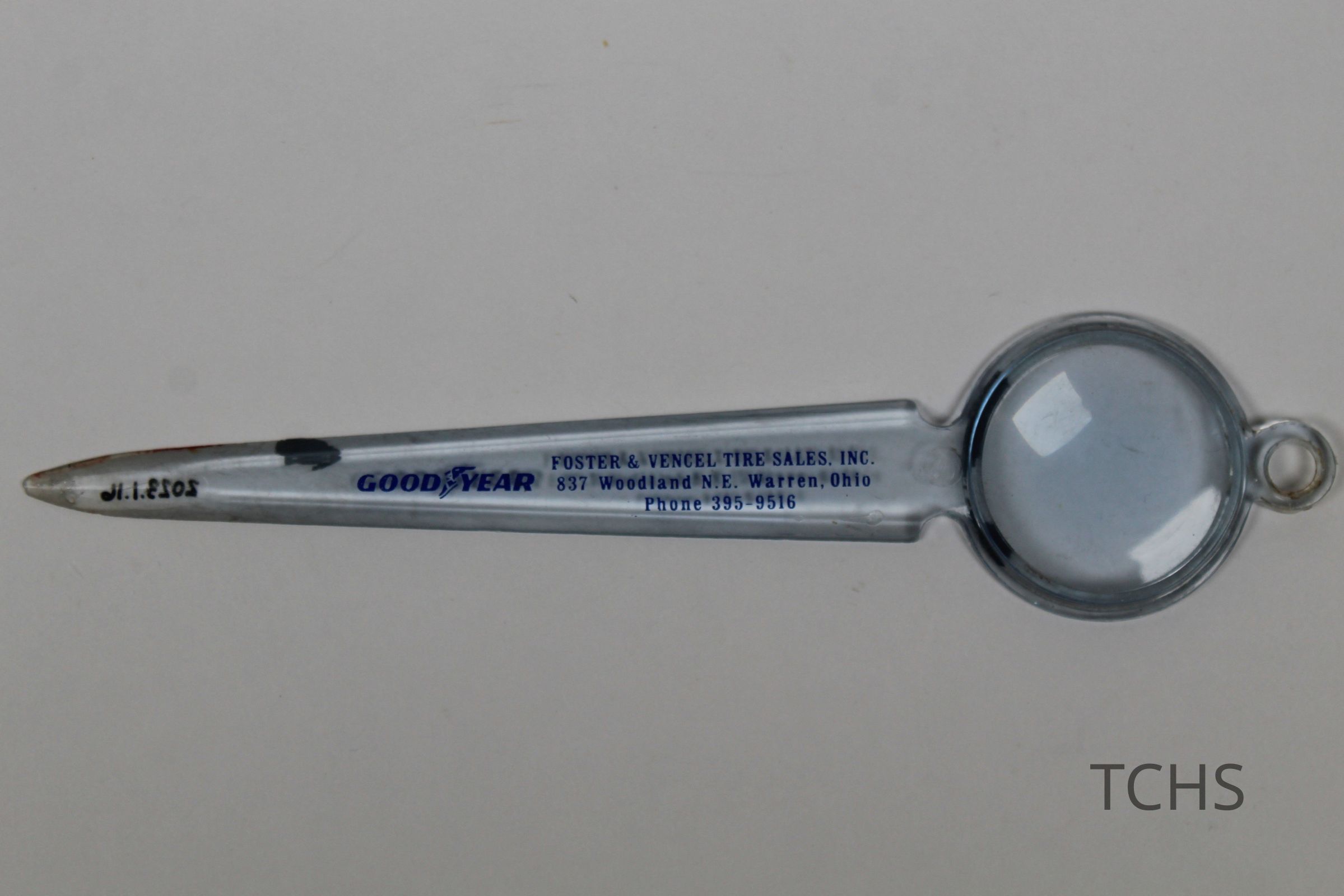 A letter opener with magnifier advertising Foster & Vencel Tire Sales. Inc. located on 837 Woodland N.E., Warren, Ohio.Location