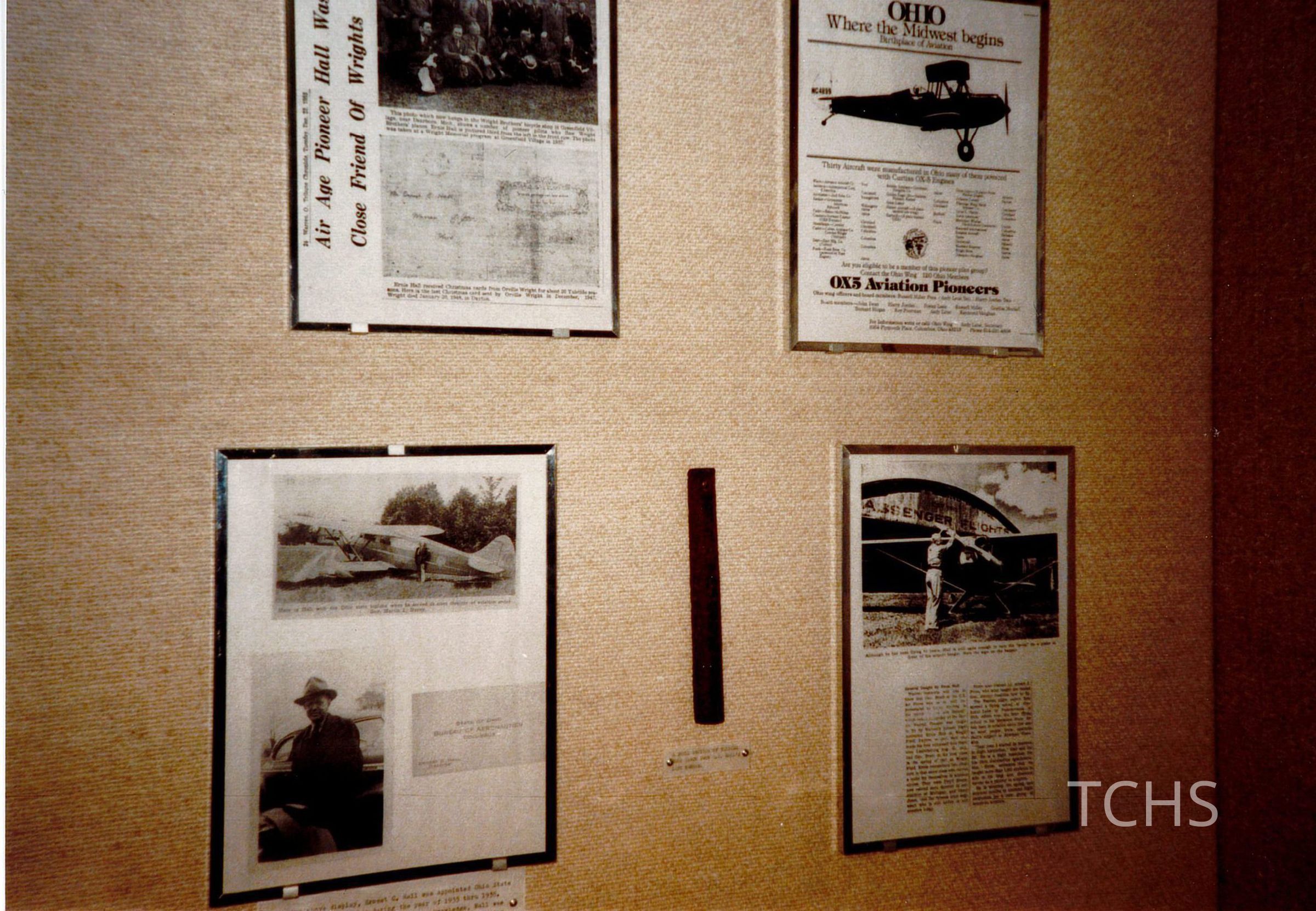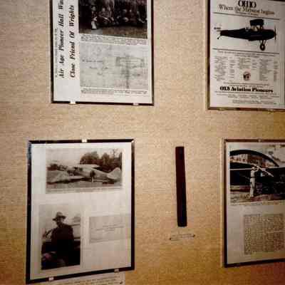 Photograph showing framed articles with photos that were on display for the Ernie Hall Exhibit in the basement of the John Stark Edwards house.Acquisition