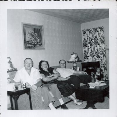Futey family sitting on the couch at 617 Oak Knoll SE Left to right: John Futey, Kate Futey (married to John), Stephen Futey, Jeanne Futey Ipsa