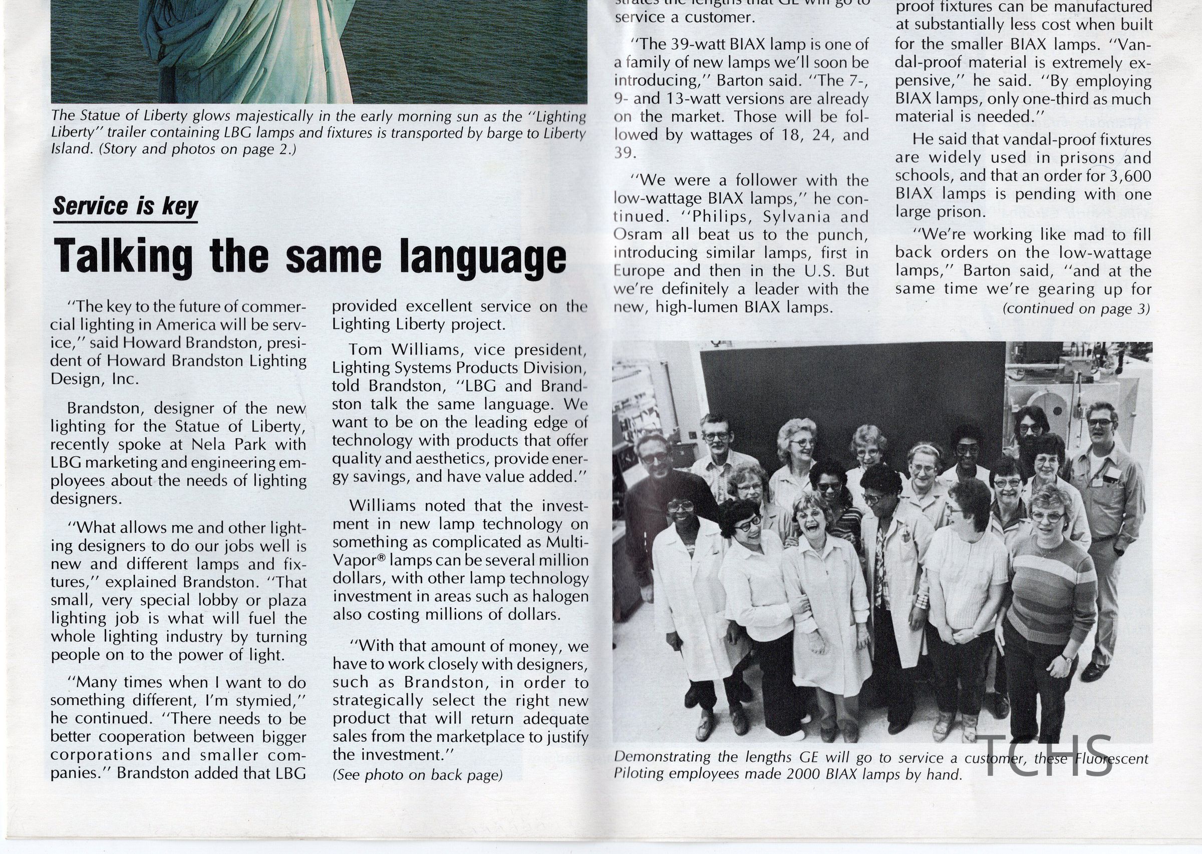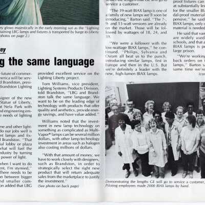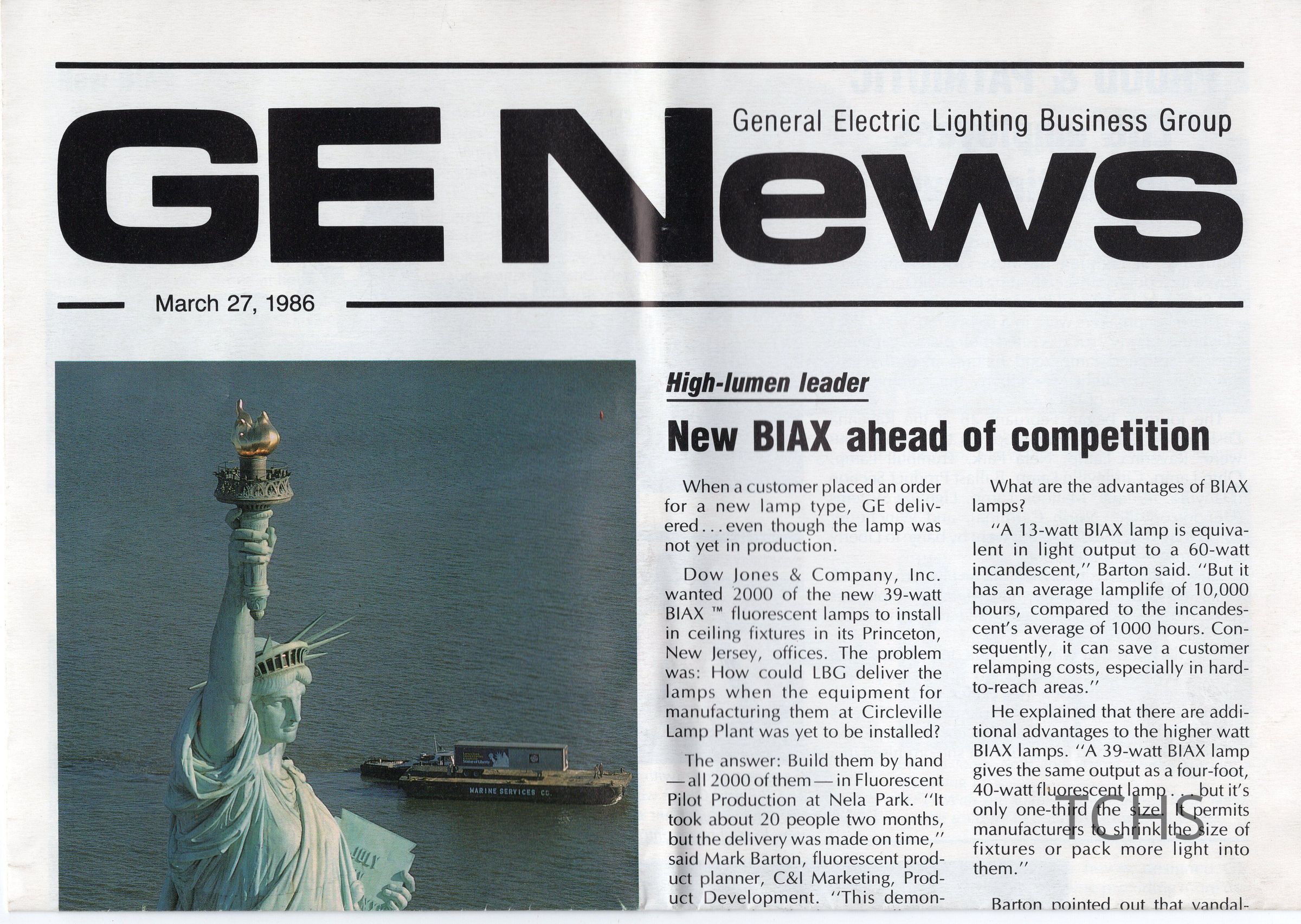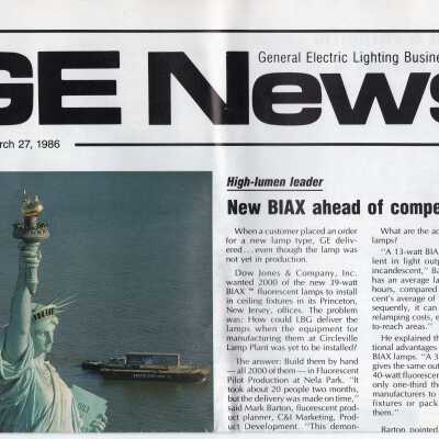 General Electric Lighting Business Group, GE News. A newsletter from March 1986 including information about the Lamps for Liberty project and photo of Statue of Liberty.Location