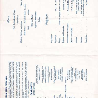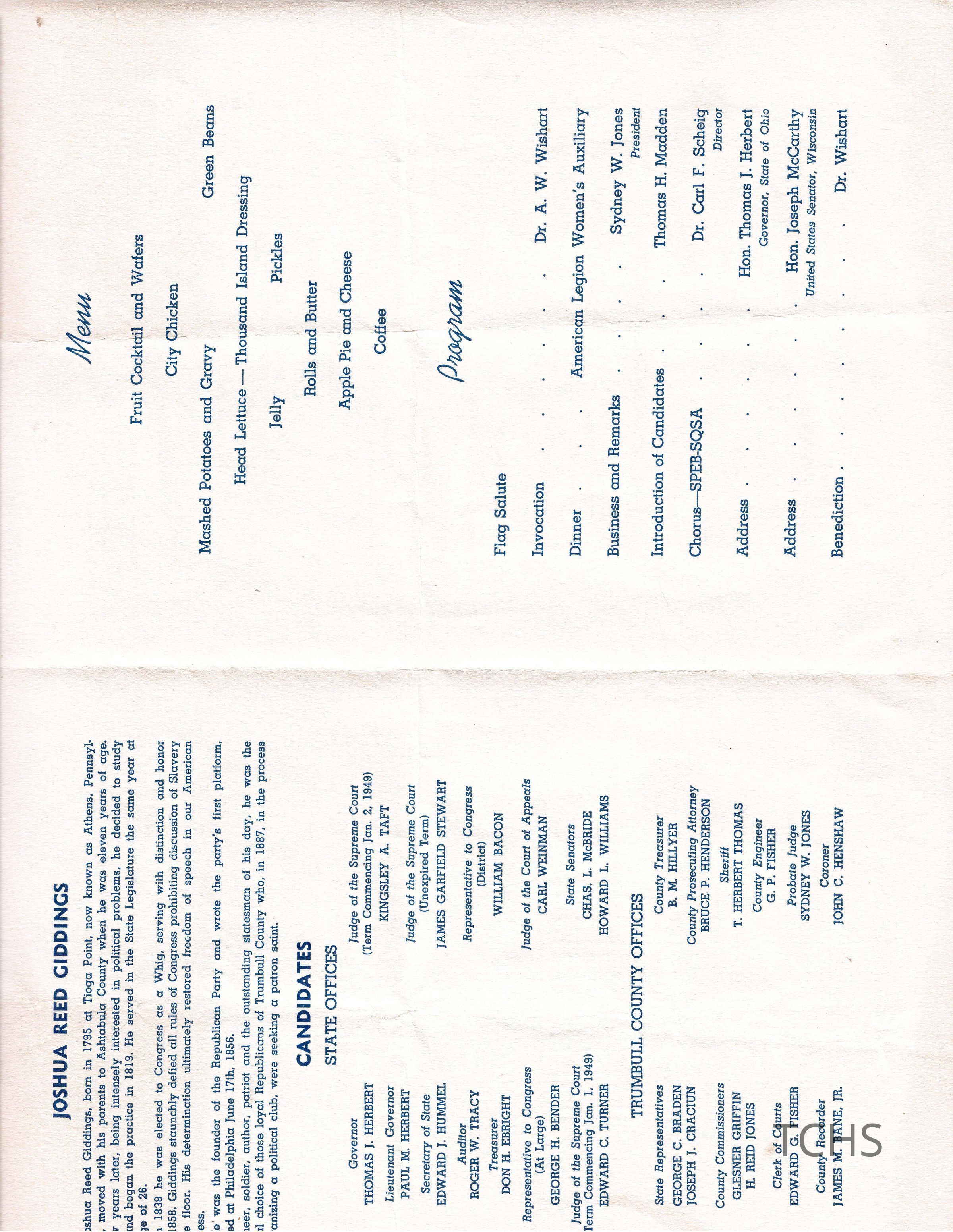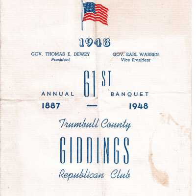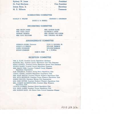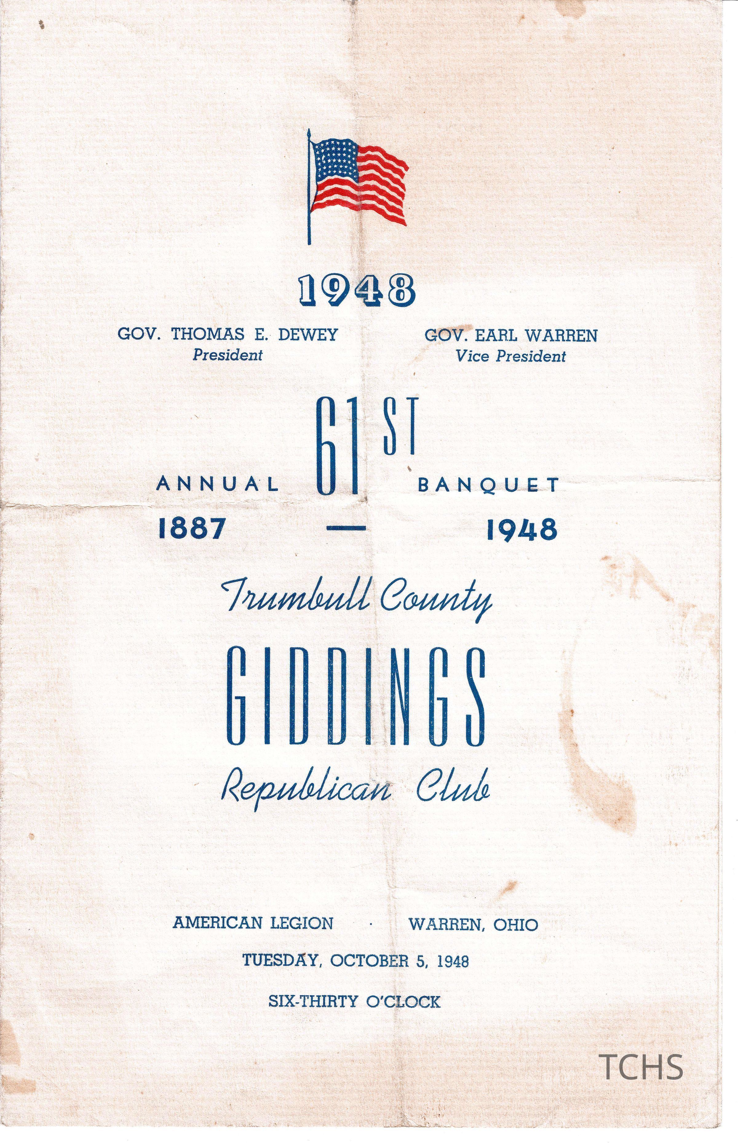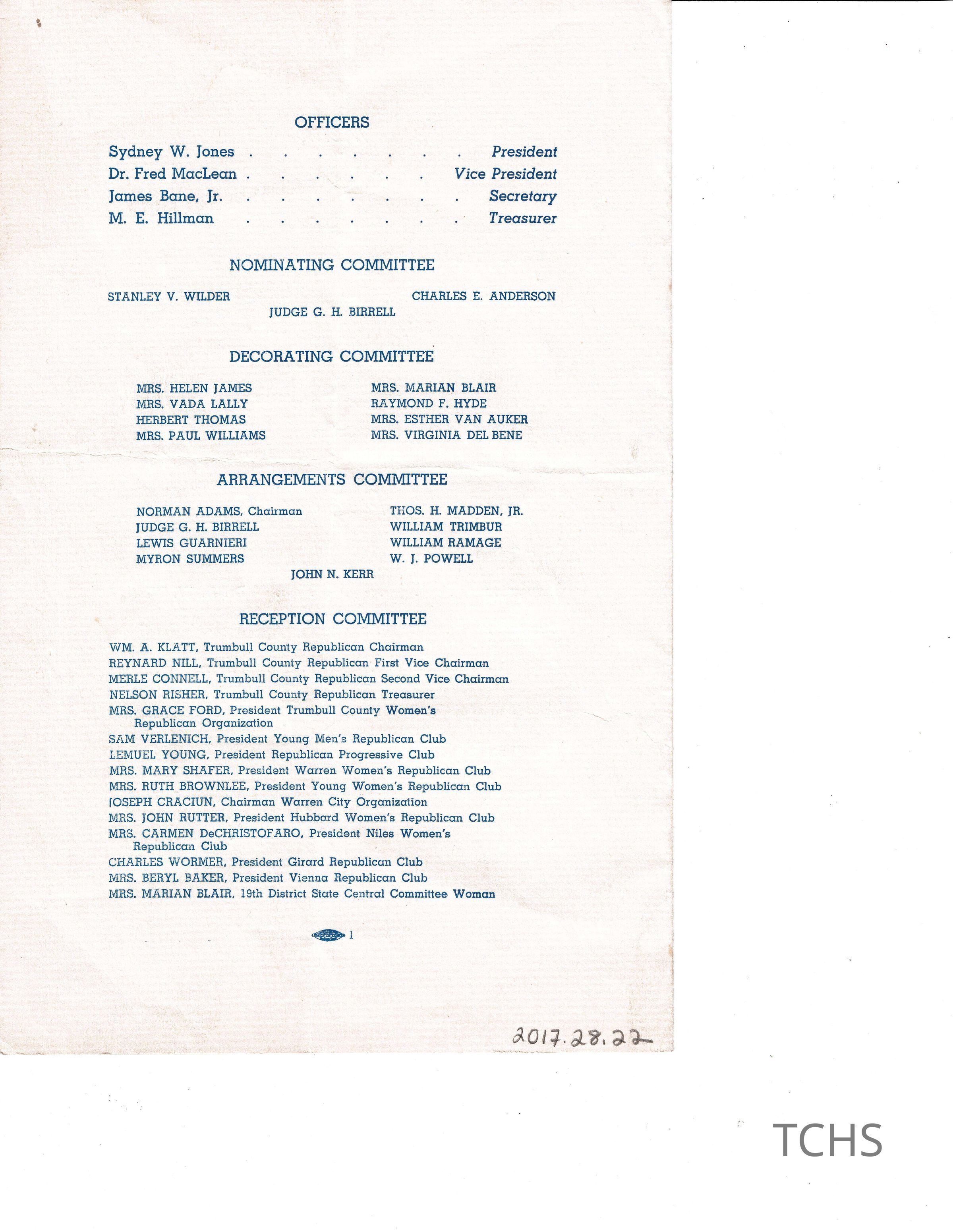 Kerr, John N., Henshaw, John C., Birrell, G.H., Anderson, Charles E., Hyde, Raymond F., MacLean, Fred (Dr), Warren, Earl, Del Bene, Virginia, Fisher, Edward G., Summers, Myron, Scheig, Carl, Bane, James M. (Jr), Stewart, James Garfield, Ramage, William, Turner, Edward C., Jones, Sydney W., Wishart, A.W. (Reverand), Craciun, Joseph, Griffin, Glesner, Jones, Reid, Madden, Thos. H., Henderson, Bruce P., Bender, George H., Herbert, Thomas J., Ebright, Don H., McBride, Charles L., Weinman, Carl, Hummel, Edward J., Braden, George C., Dewey, Thomas E., Bacon, William, Blair, Marion (Mrs), Fisher, G.P., Madden, Thomas H. (Jr), Adams, Norman, James, Helen, Hillman, M.E., Herbert, Paul M., Hillyer, B.M., Tracy, Roger W., Bane, James, William, Paul, Lally, Vada, Van Auker, Esther, Powell, W.J., McCarthy, Joesph, Taft, Kingsley A., Guarnieri, Lewis, Trimbur, William C., Williams, Howard L., Wilder, Stanley V., Thomas, Herbert, Giddings Republican Club