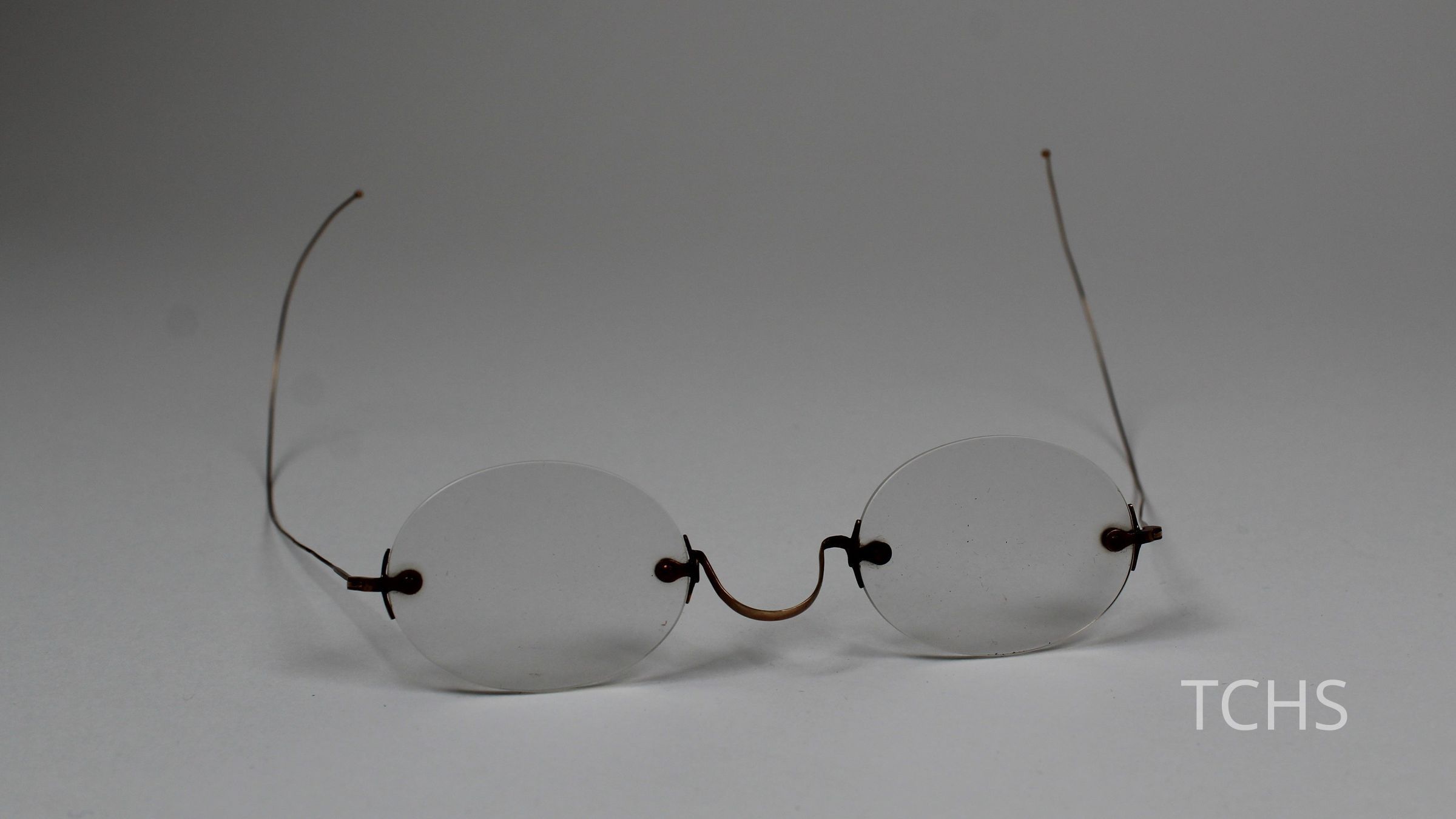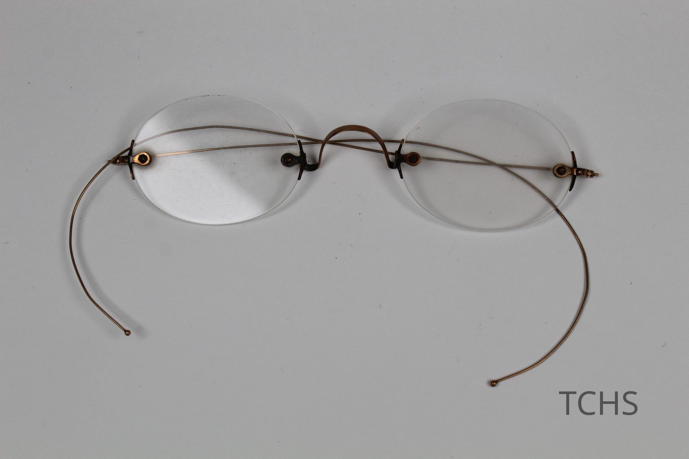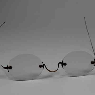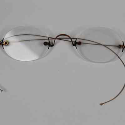A pair of thin wireframe glasses with round lenses.