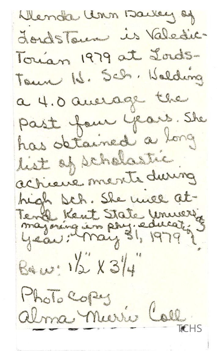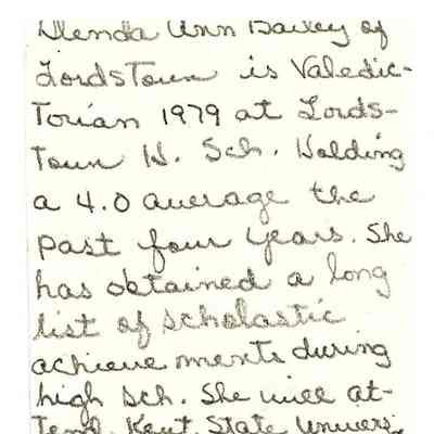 "Glenda Ann Bailey of Lordstown is Valedictorian 1979 at Lordstown H. Sch. Holding a 4.0 average the past four years, she has obtained a long list of scholastic achievements during high sch. She will attend Kent State University majoring in phy. education."