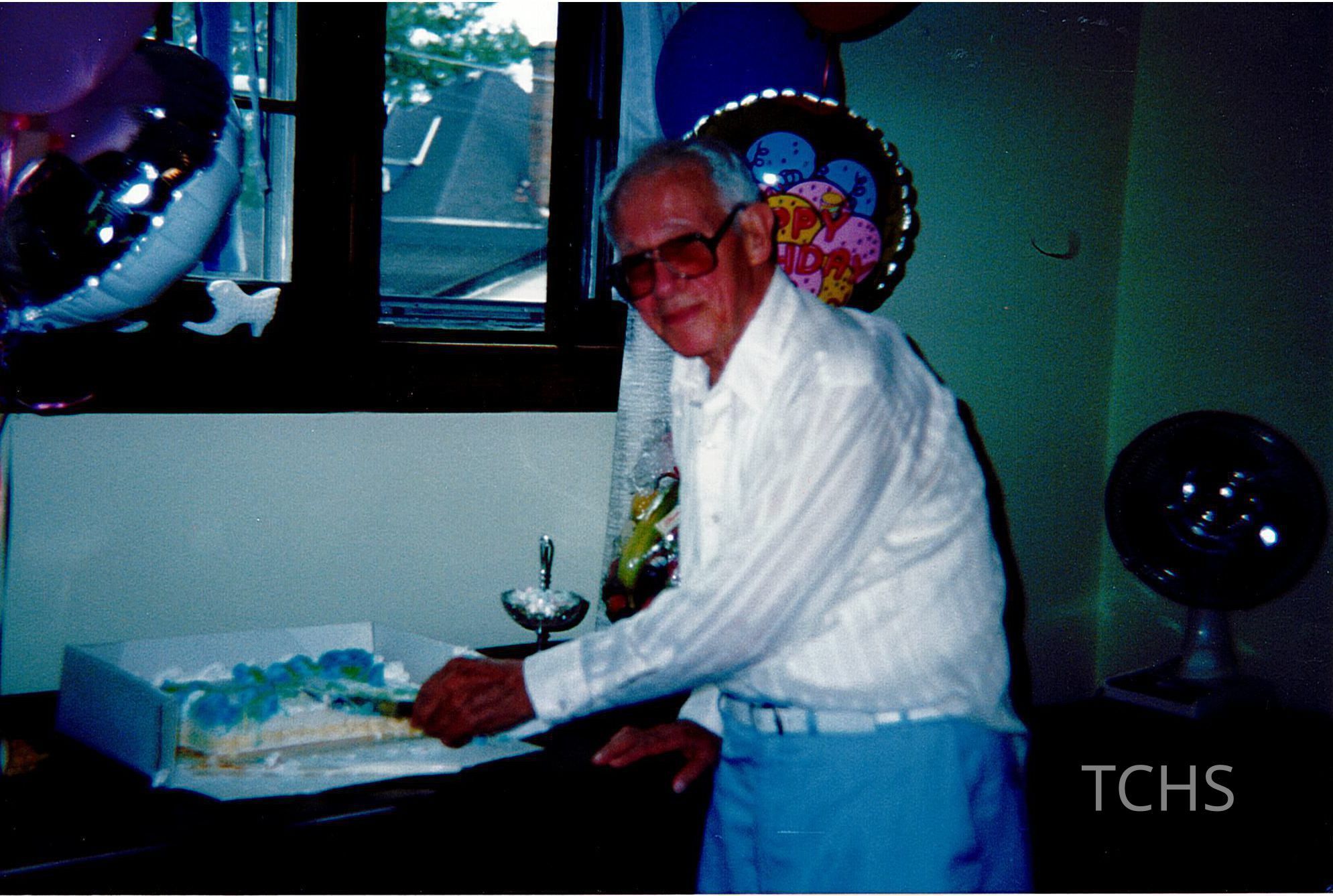 A photograph of Grandpa Martin cutting cake, no date.Collection