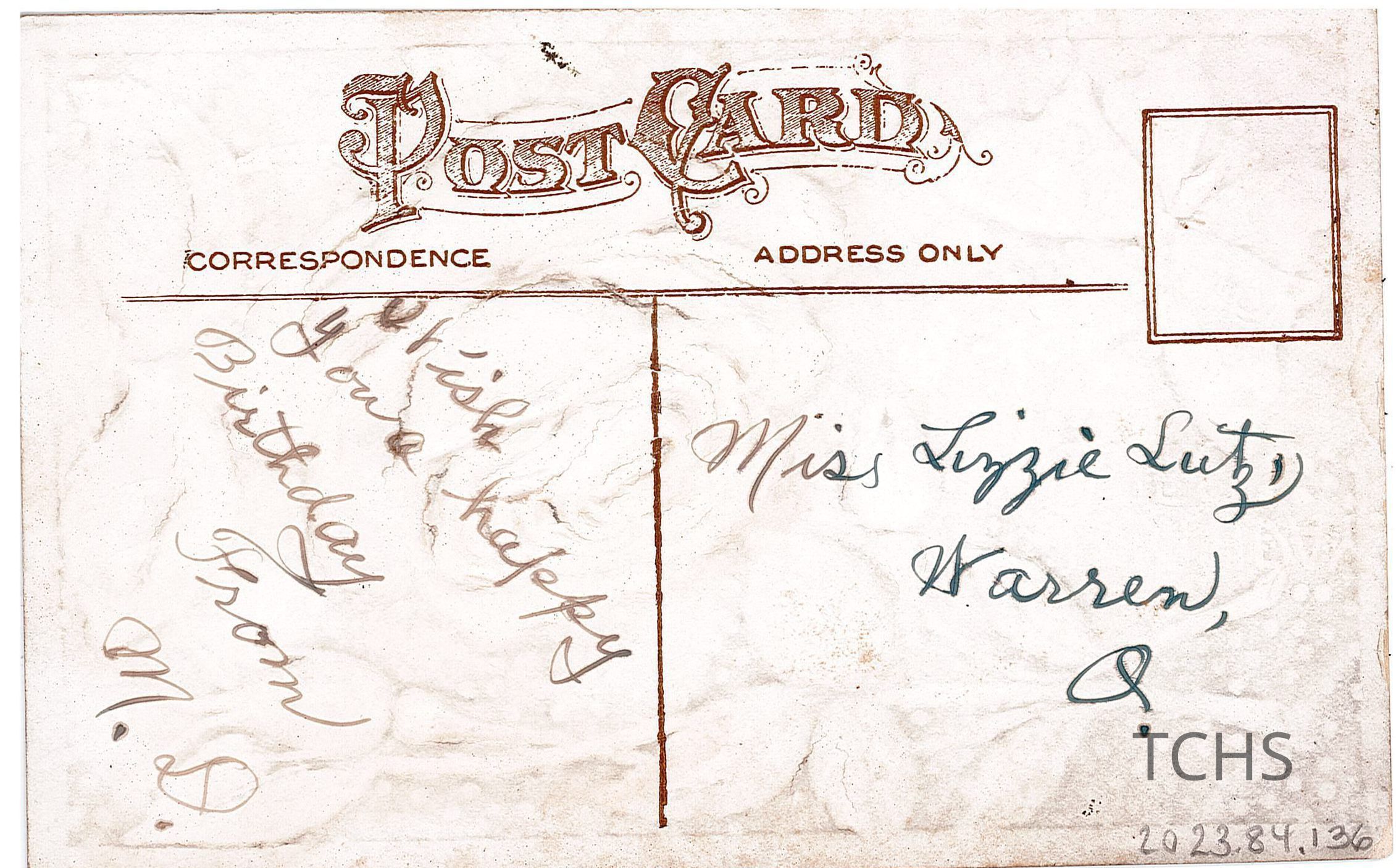 A birthday postcard to Elizabeth "Lizzie" Lutz from M.D., no date and not mailed.Acquisition