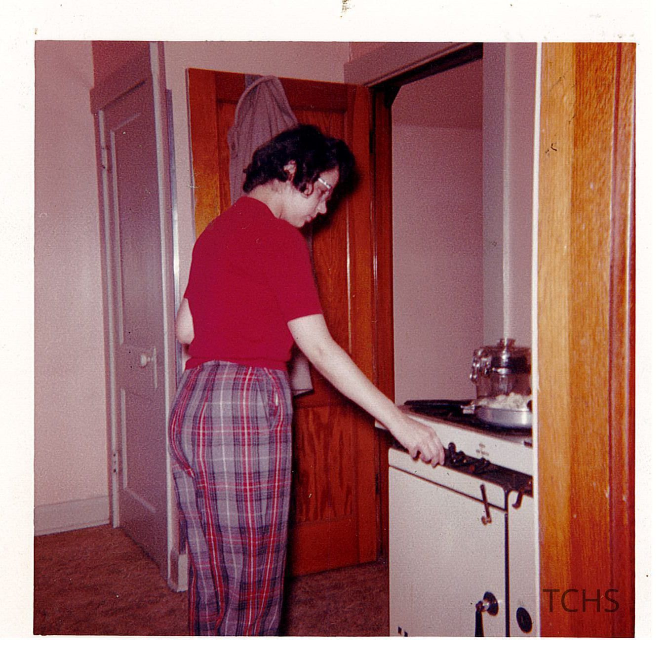 A photograph of one of the Griffiths twins standing in front of a stove, 1950s.Photograph Details