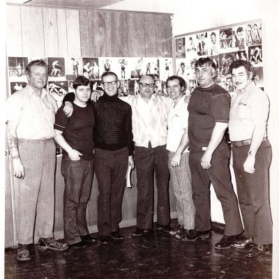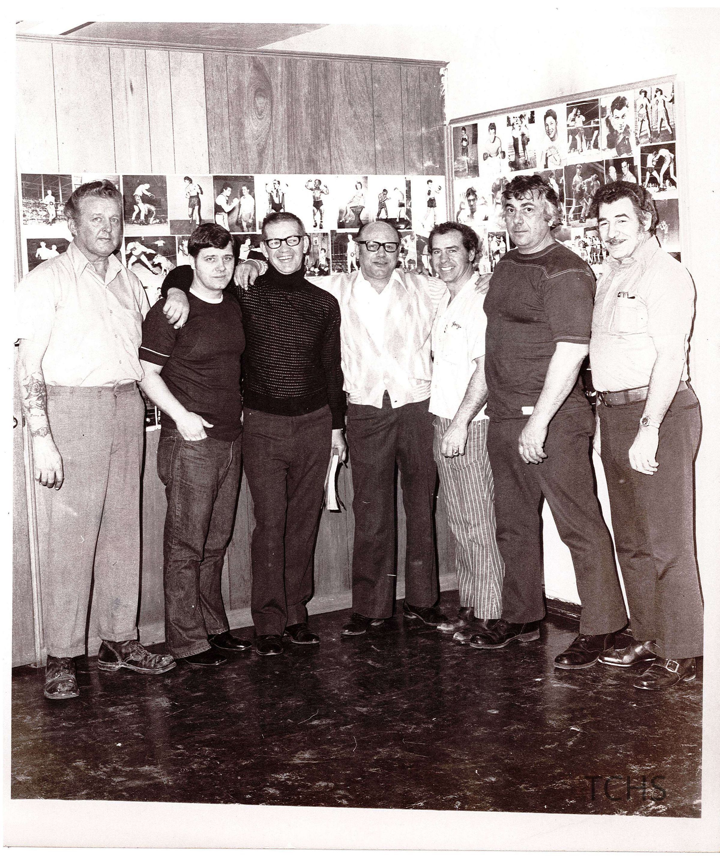 A group of men standing in front of a wall showcasing boxers.