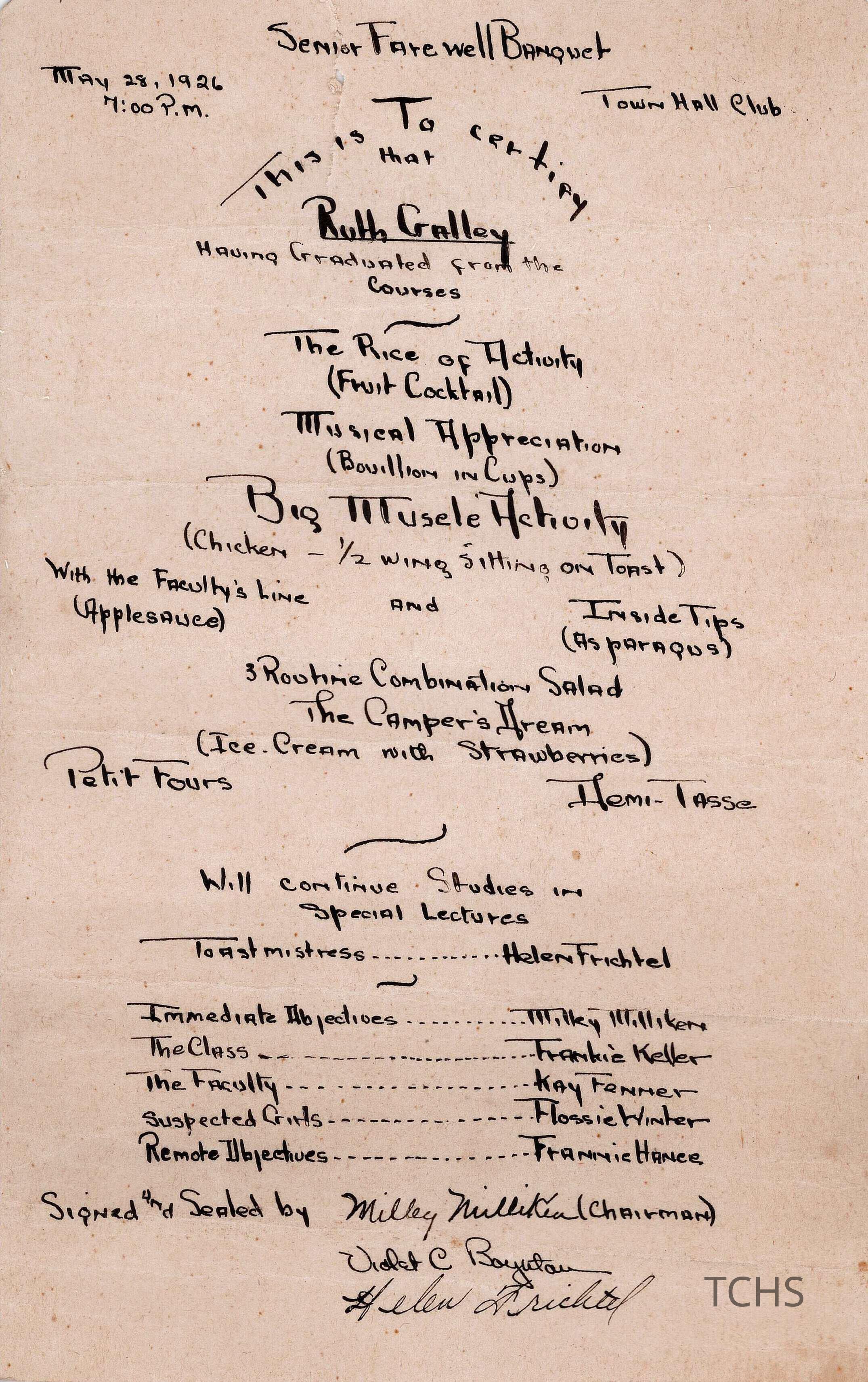 Handwritten graduation card to Ruth Galley from the Town Hall Club, May 28, 1926.Location