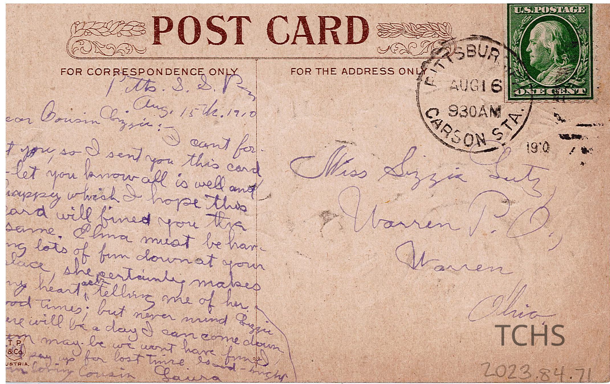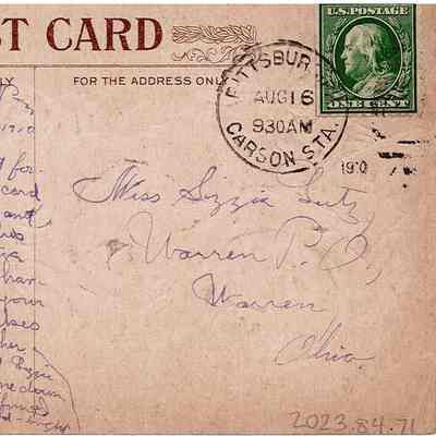 A postcard to Elizabeth “Lizzie” Lutz from her cousin Laura sent on August 16th, 1910.Acquisition