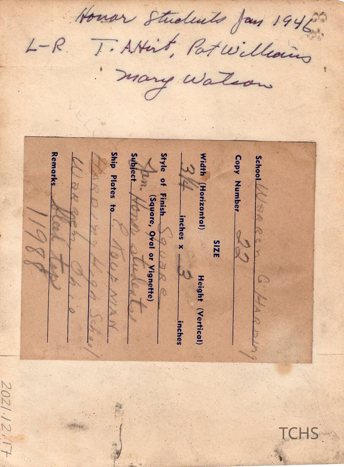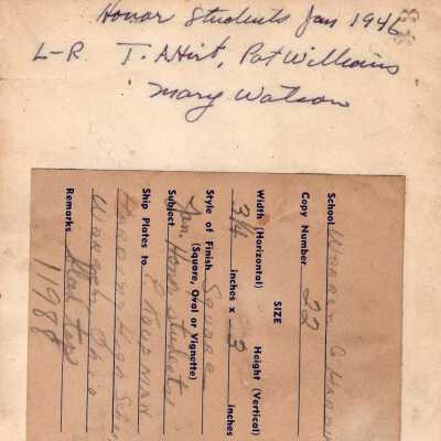 Text on Back "Honor Students from 1946, L-R T. A. Hirt, Pat Williams, Mary Watson"Collection