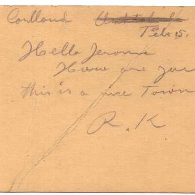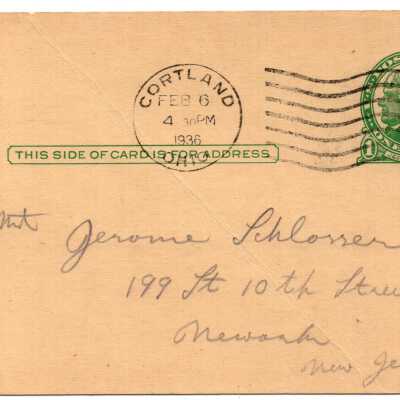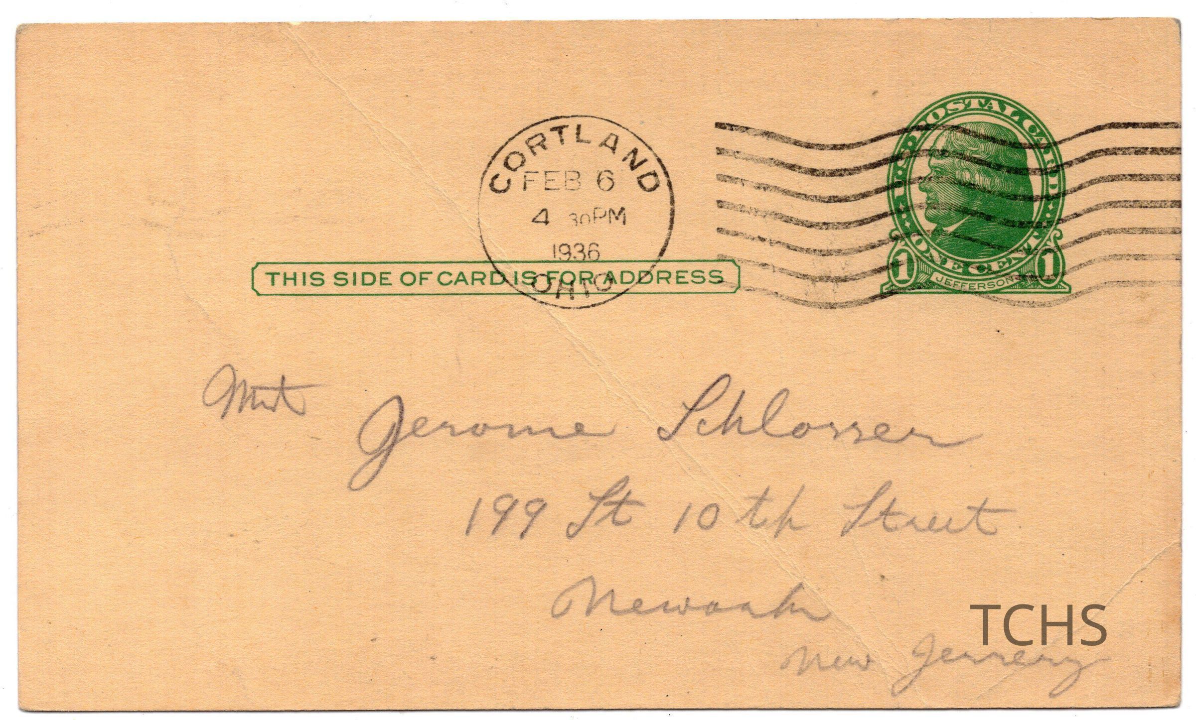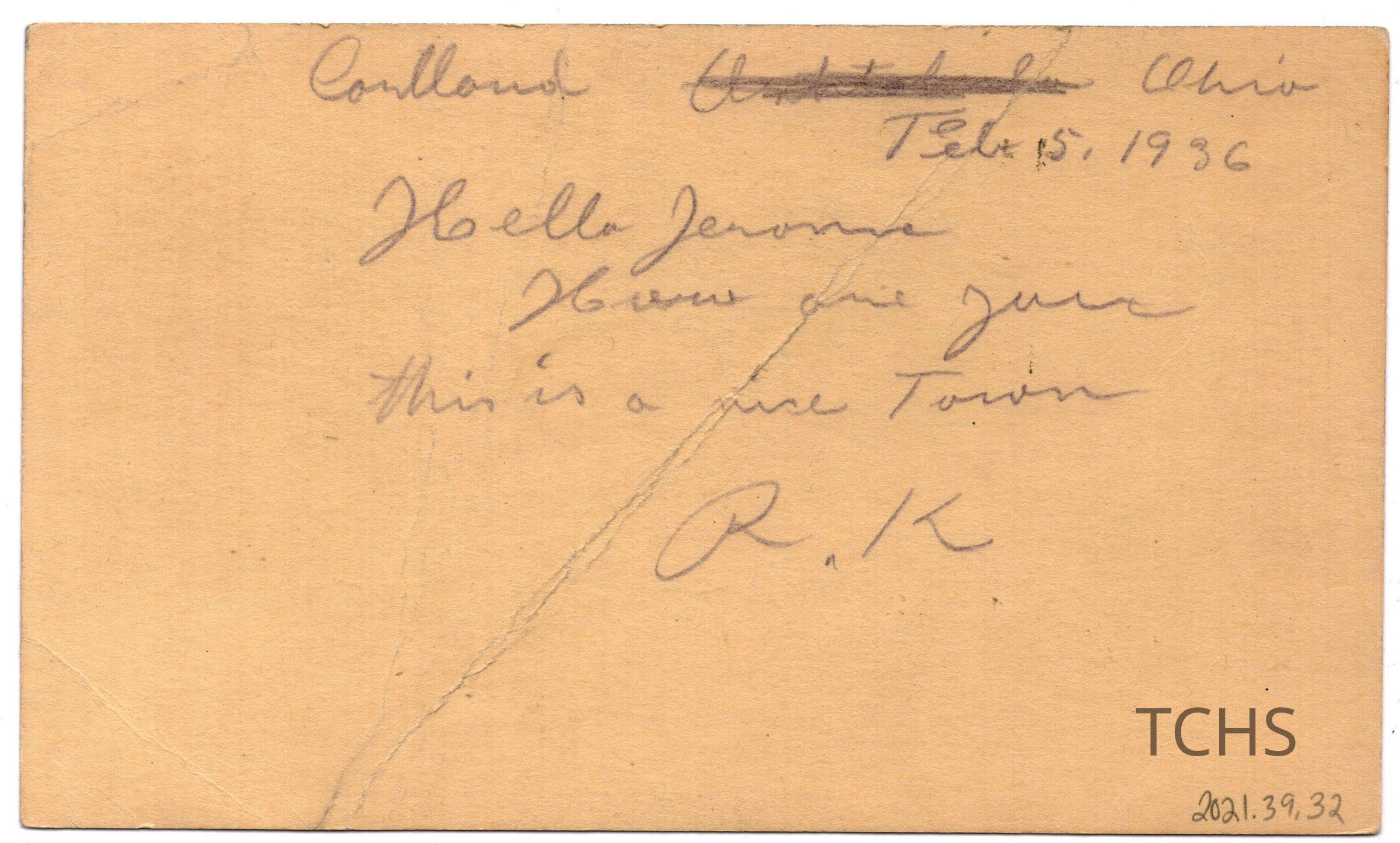 To Jerome Schlorrer, Newark New Jersey from R.K., Cortland Ohio. R.K. tells Jerome of how nice of a town Cortland it.Collection