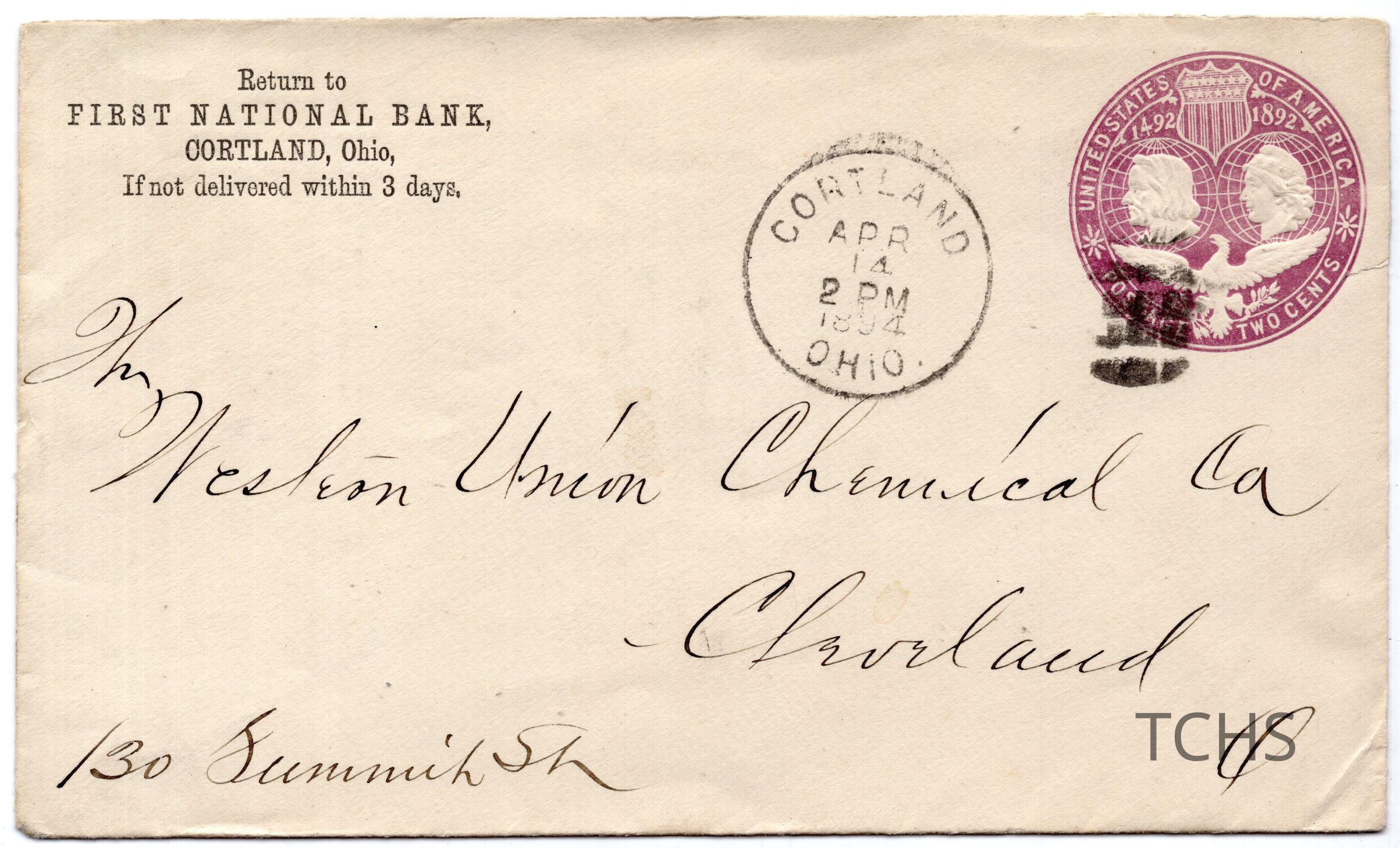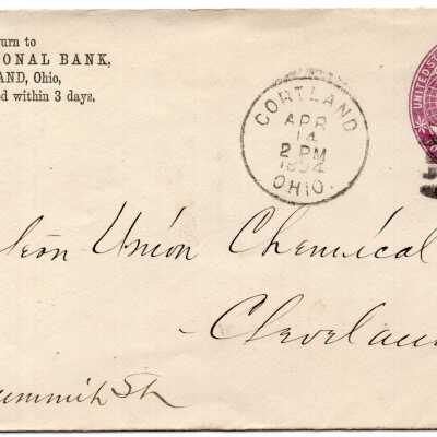 Sent from First National Bank of Cortland to the Western Union Chemical Co. of Cleveland O. (Chemical Company unknown)Collection