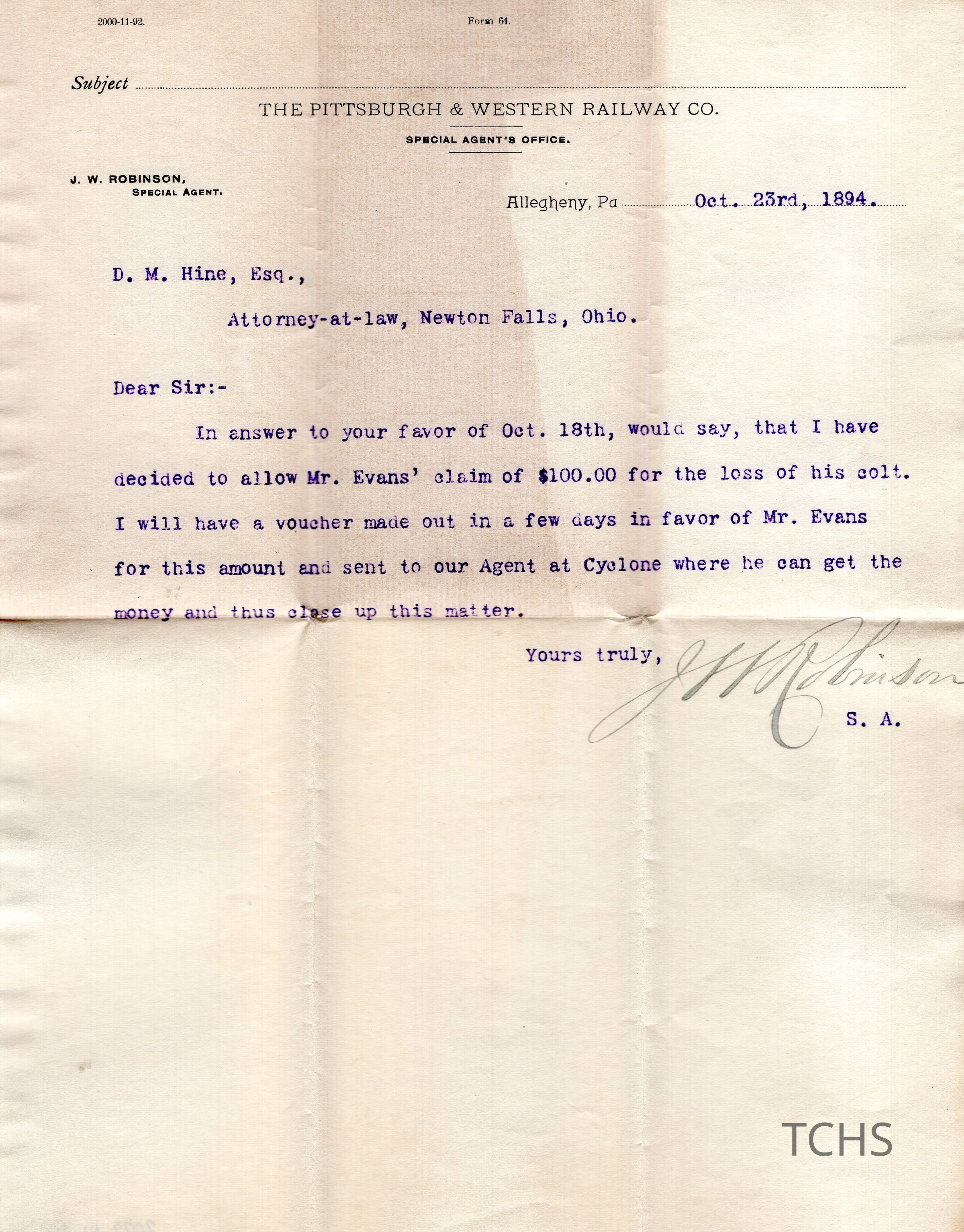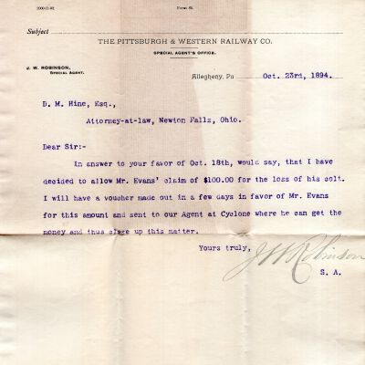 October 23, 1894 letter from J. W. Robinson of Allegheny, PA to D.W. Hine, Newton Falls, Ohio, regarding awarding Mr. Evans $100.00 for a lost colt.Acquisition