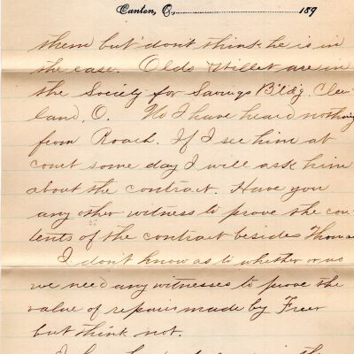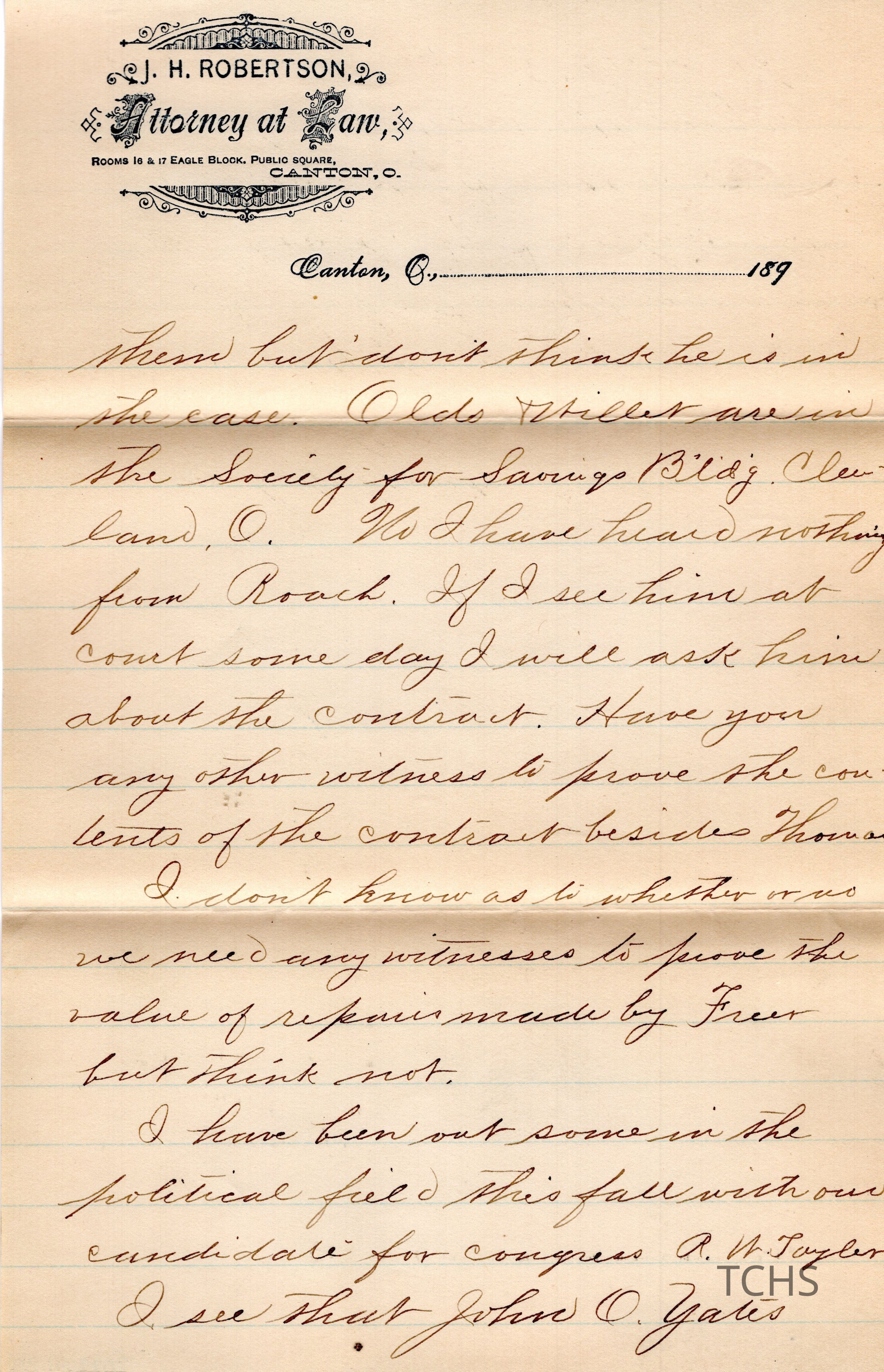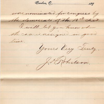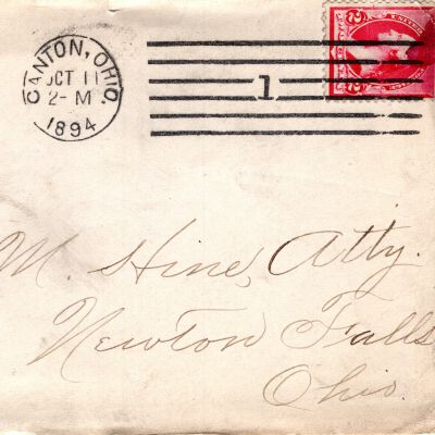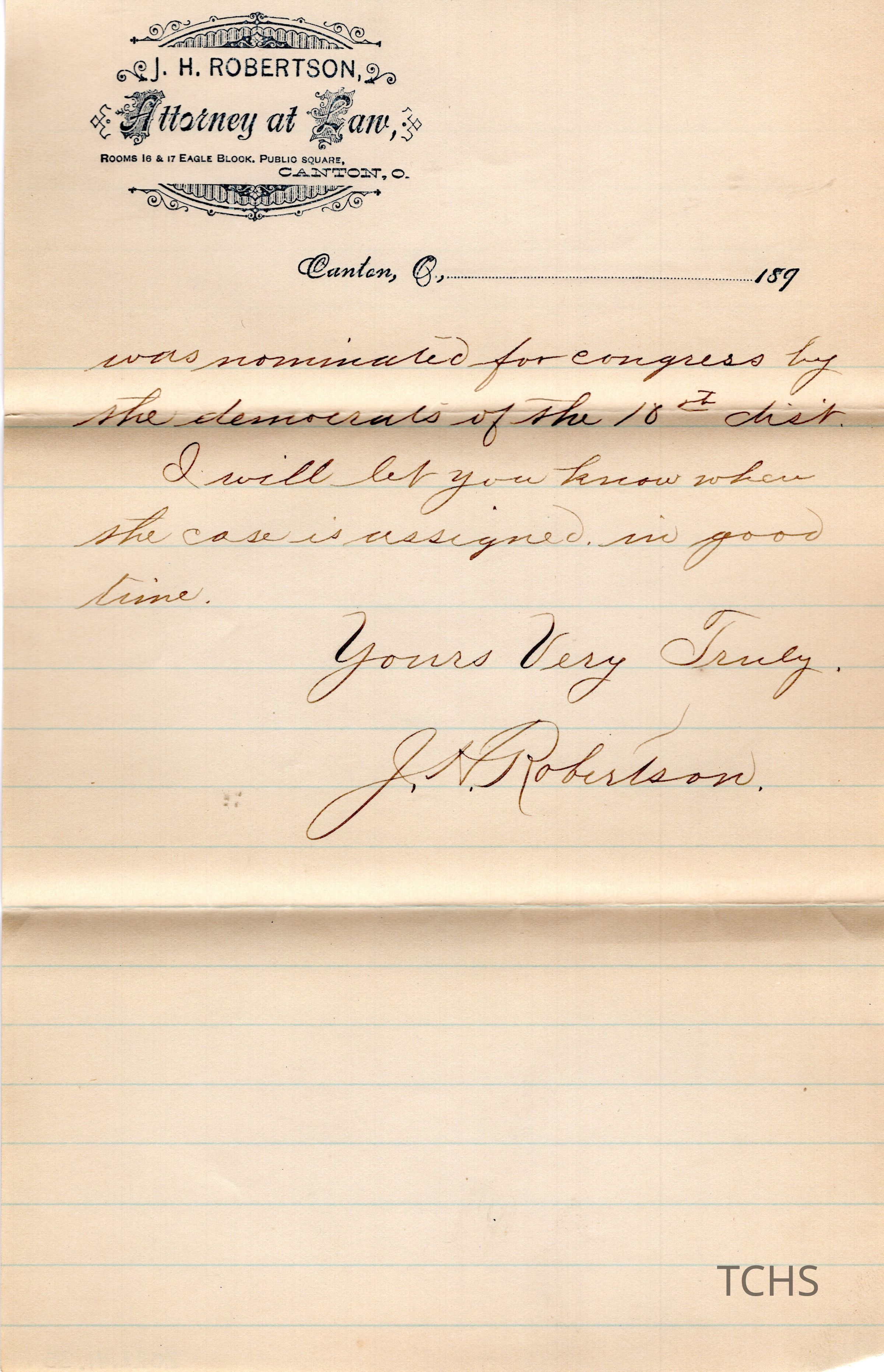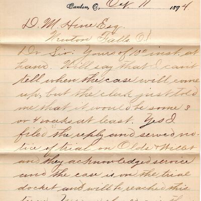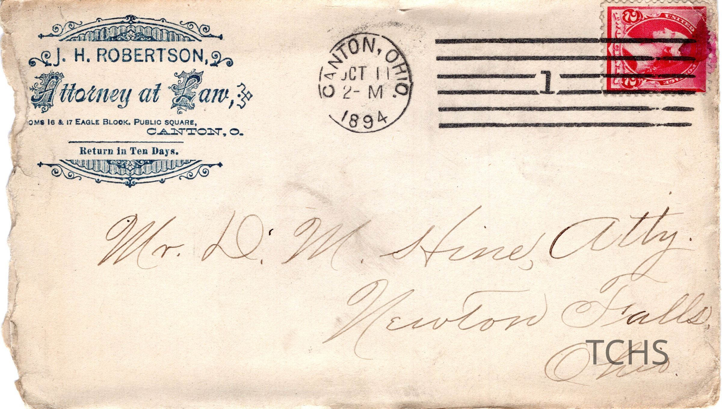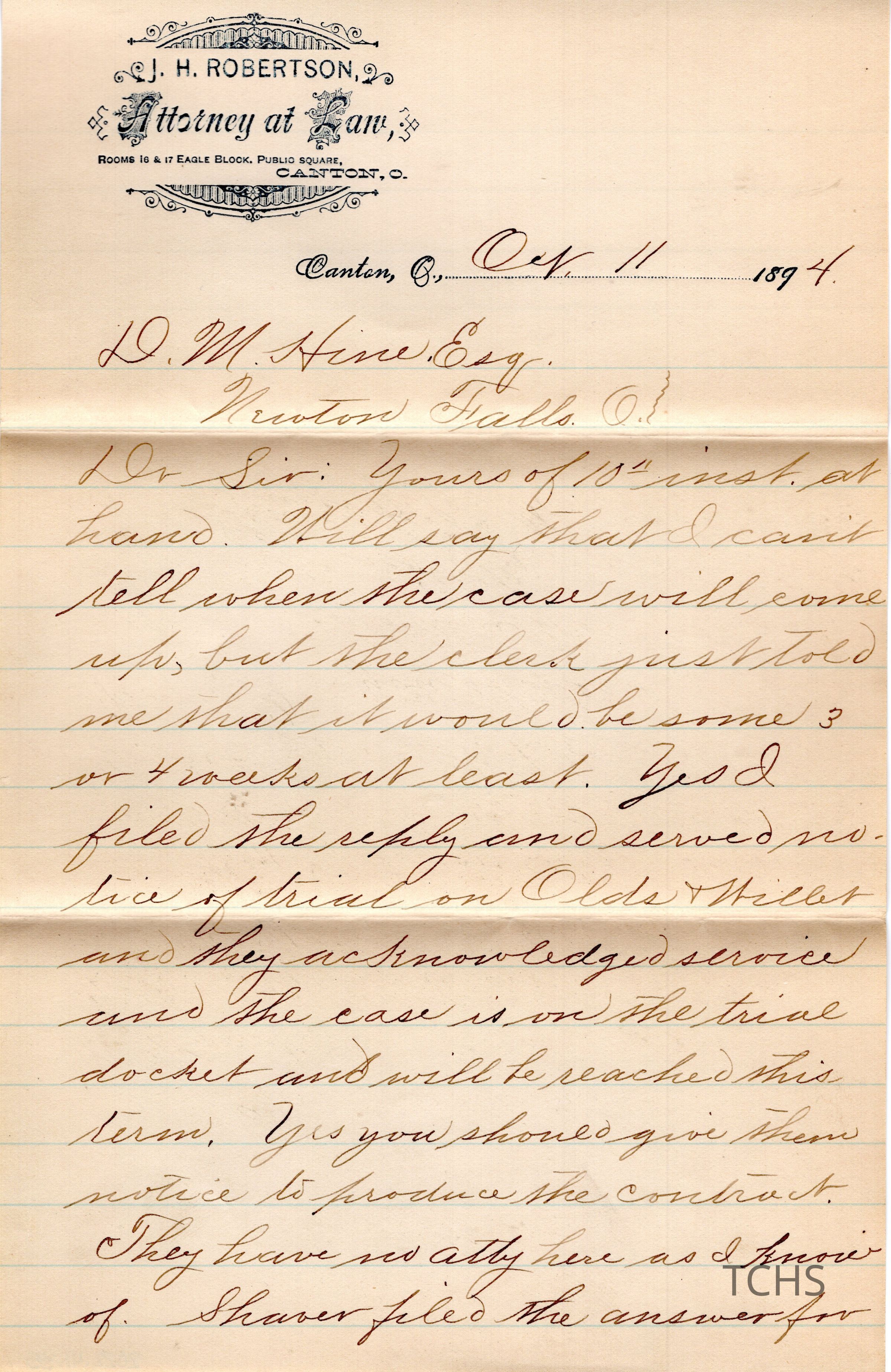 October 11, 1894 letter from J. H. Robertson in Canton, Ohio to D.W. Hine, Newton Falls, Ohio, regarding a case.Acquisition