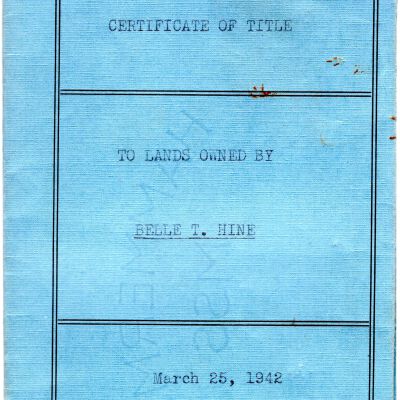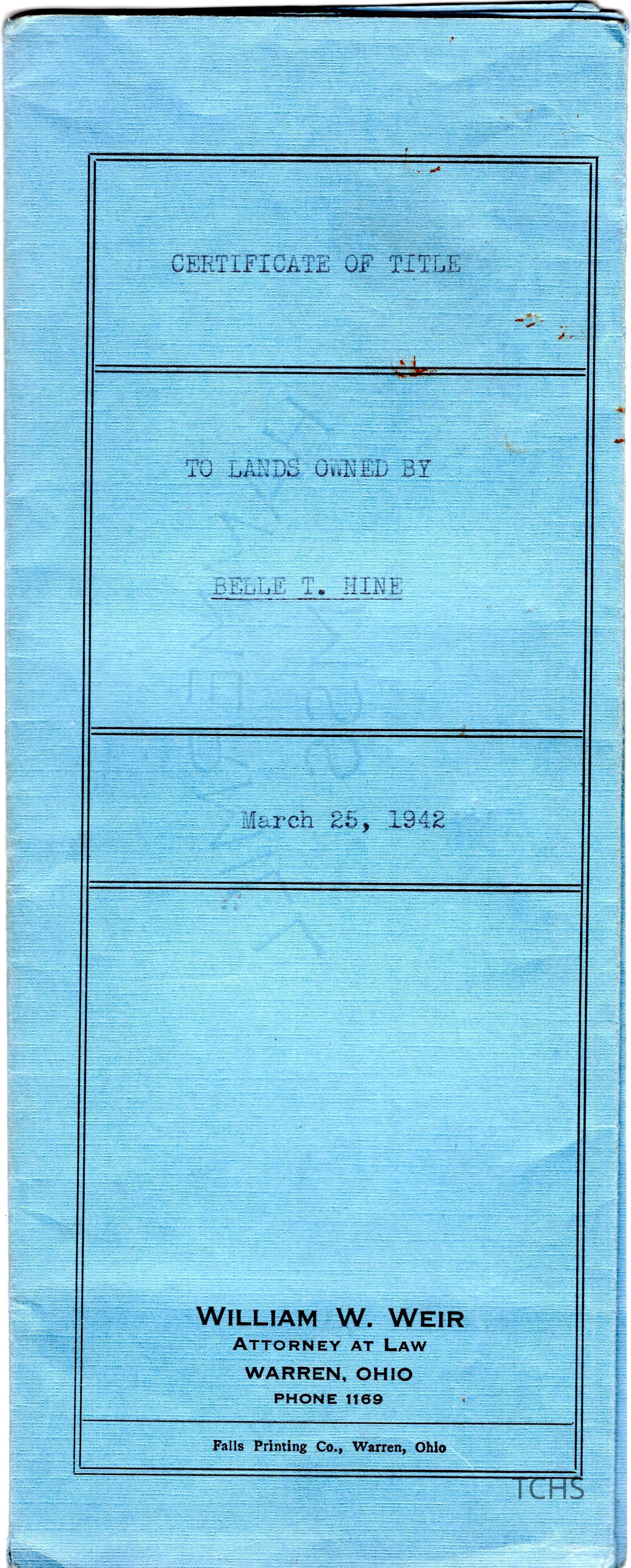 March 25, 1942 Certificate of Tile stating that Belle T. Hine is the owner of Lot No. 27 in Newton Falls, Ohio. This legal document was completed by William W. Weir, Attorney at Law in Warren, Ohio.