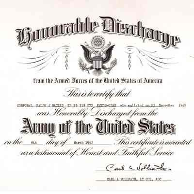 Certificate of honorable discharge for Ralph Bailes from the United States ArmyDate(s) of Creation