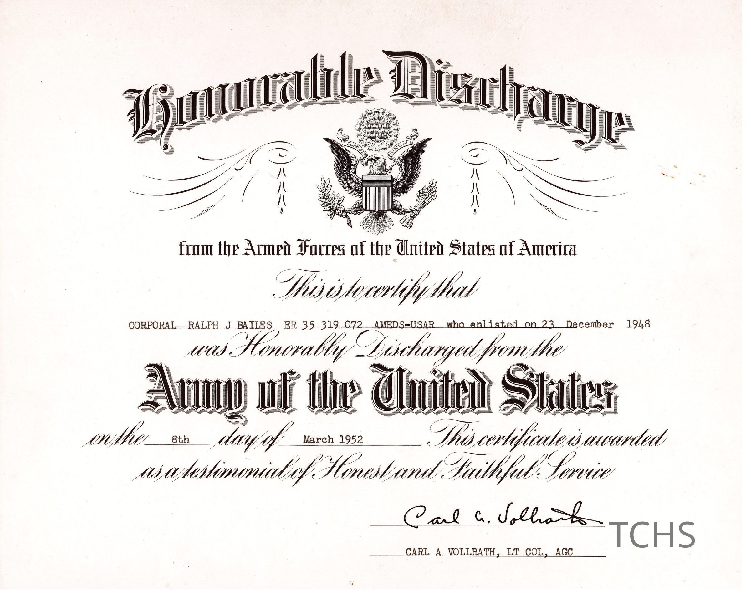 Honorable Discharge certificate from the United States Army awarded to Corporal Ralph J. Bailes, Enlisted Number RA 35 319 072, who enlisted on December 23, 1948, and was honorably discharged on March 8, 1952, as a testimonial of honest and faithful service, with an official seal and the signature of Carl A. Vollrath, Lieutenant Colonel.Acquisition