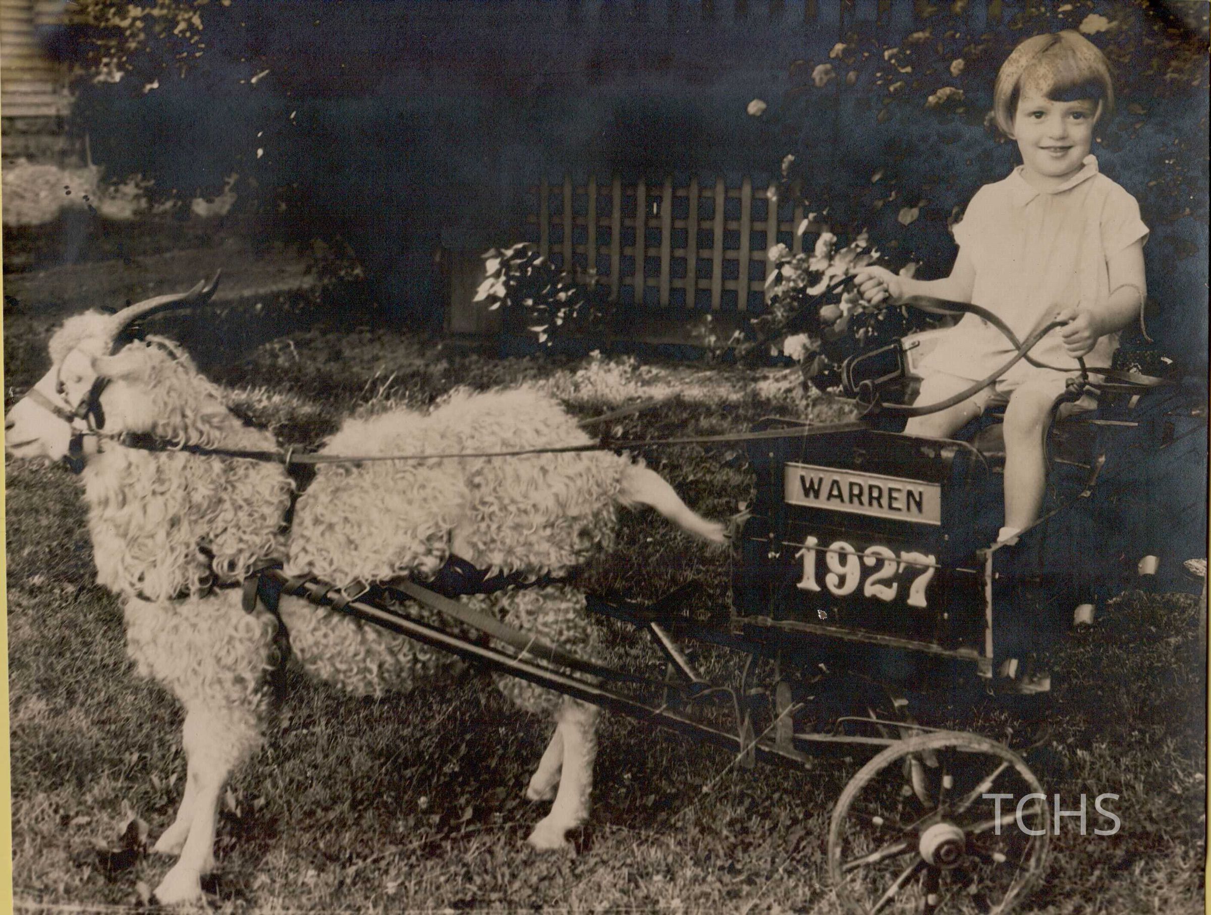 Hortense (Terry) Speak, Ralph Speak's daughter, riding a sheep with a sign that says "Warren, 1927"Collection