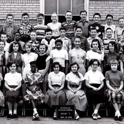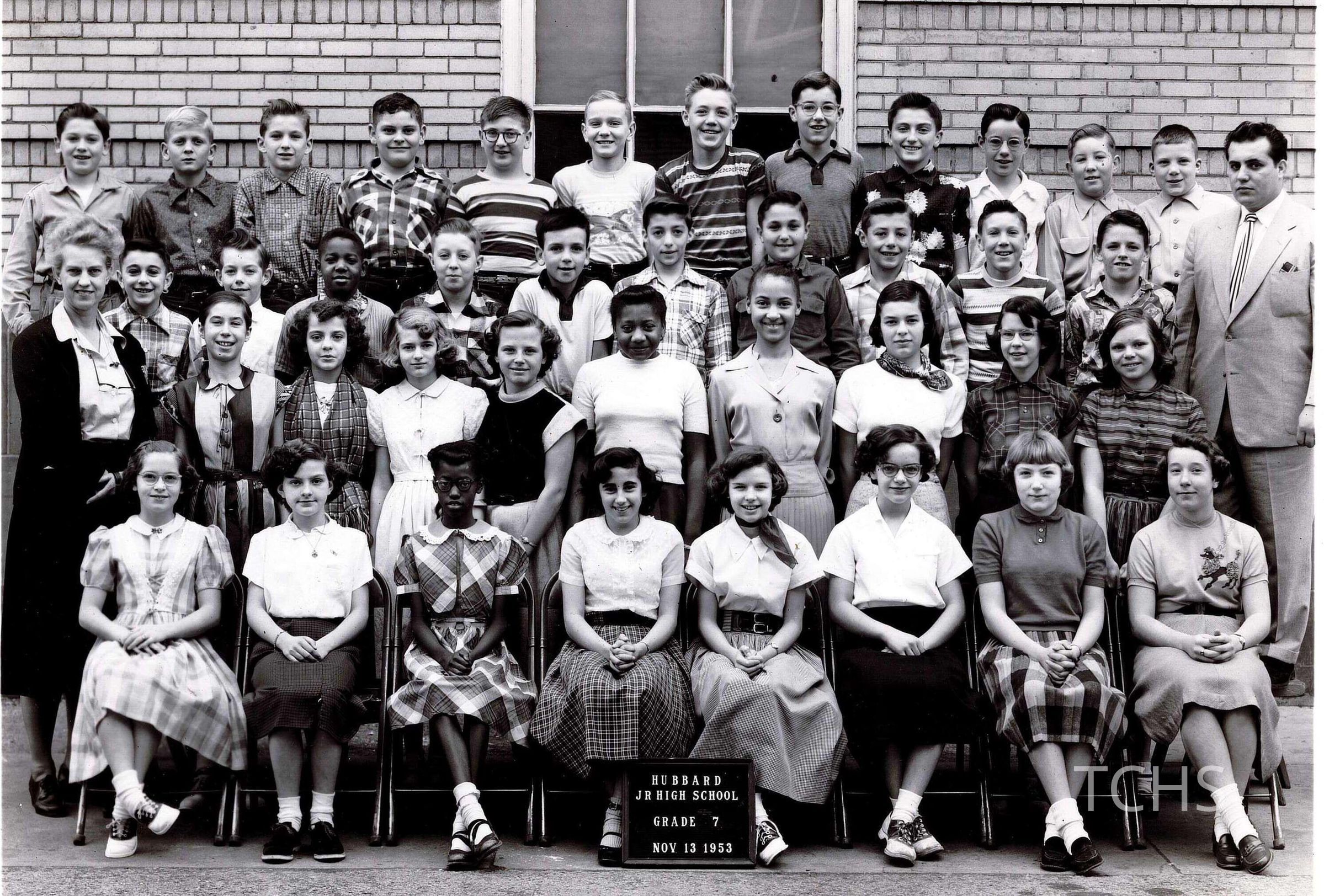 Hubbard Junior High School, grade 7 class photo with Ruth Galley as teacher on the left, Nov. 13, 1953Location