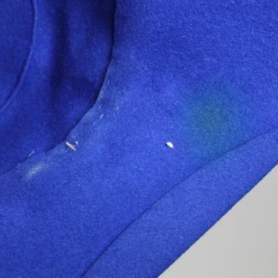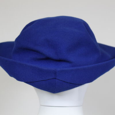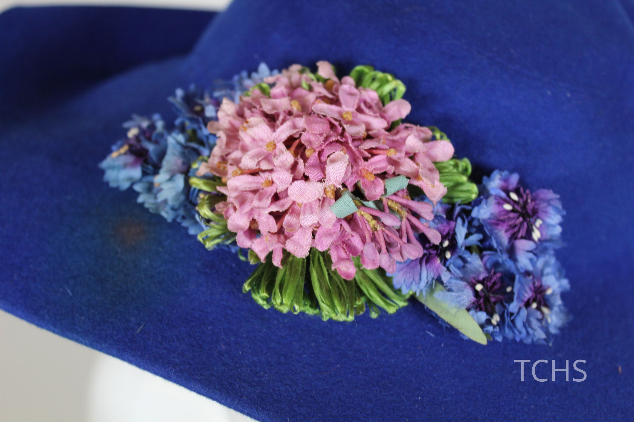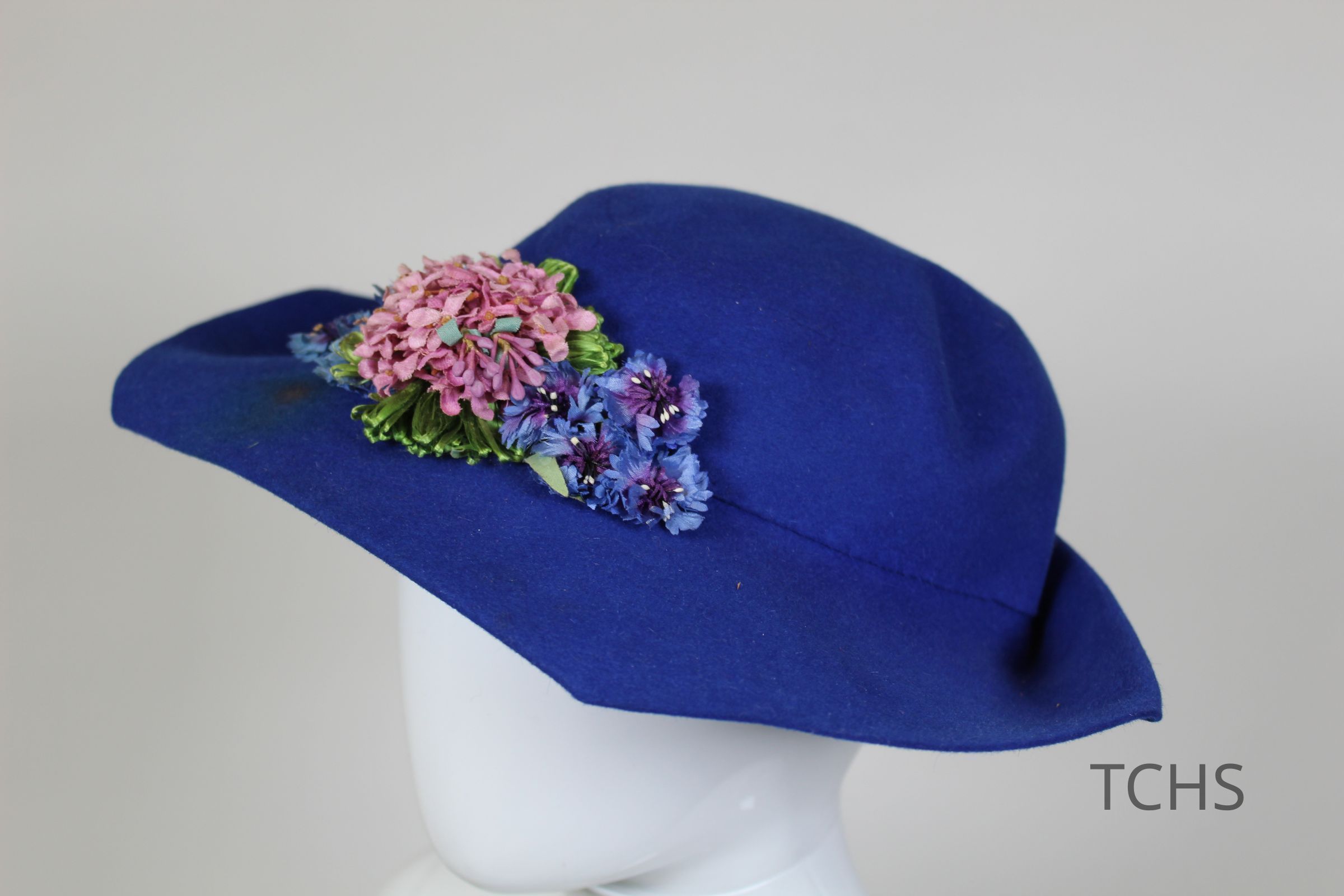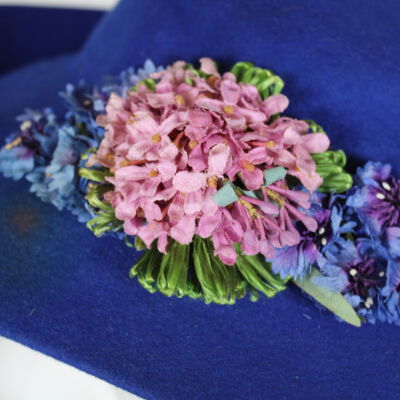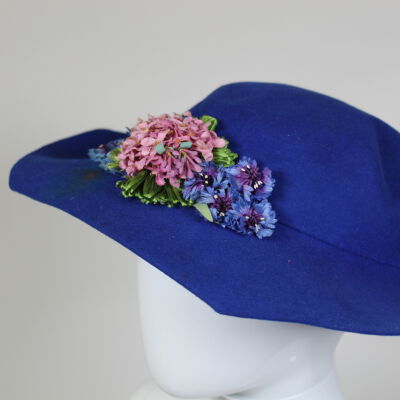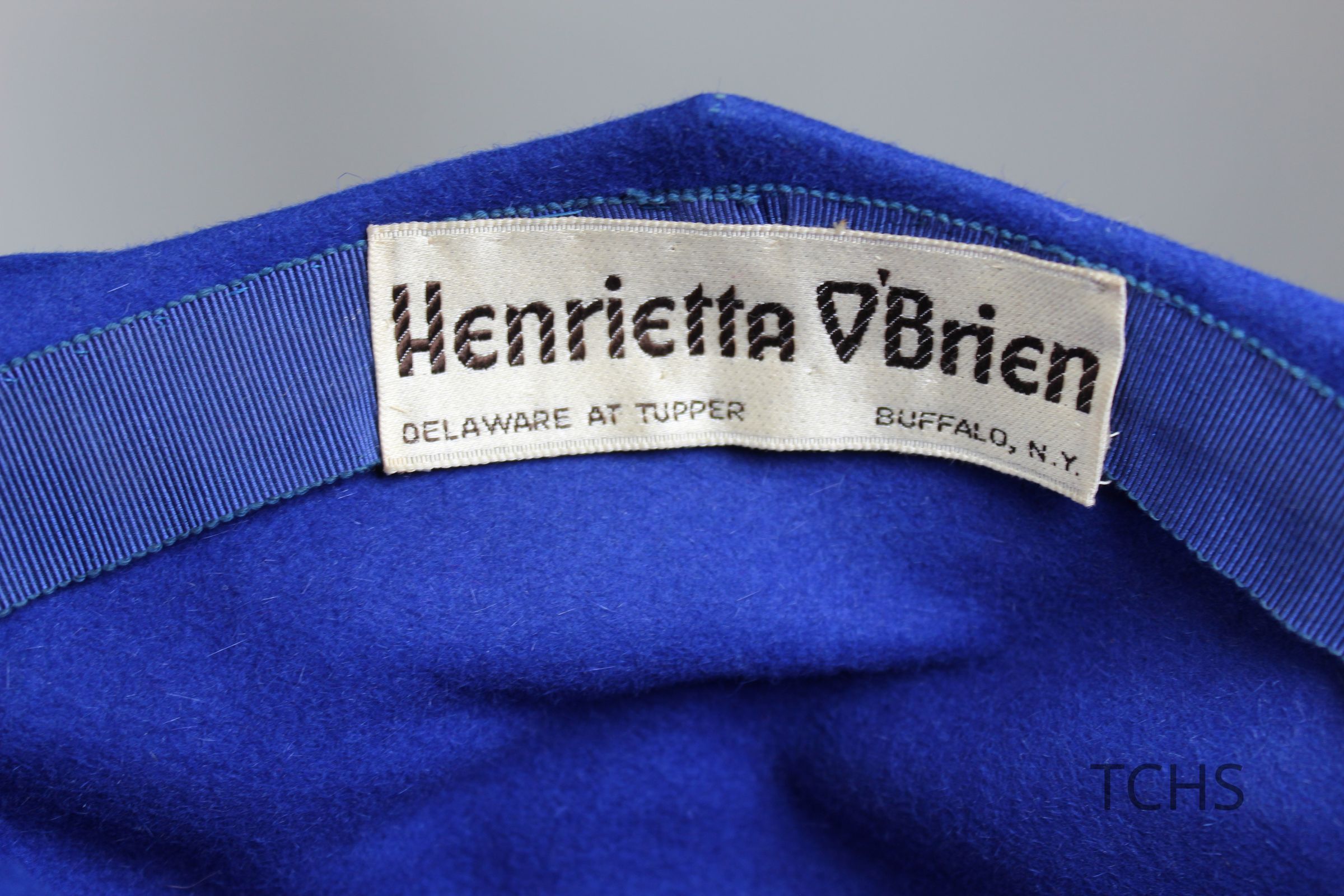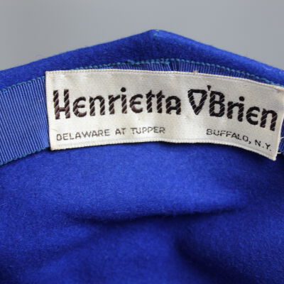 This is a blue hat with a medium-width flexible brim. There is a pink and purple floral decoration attached to the front of the hat. The label on the inside of the hat indicates that the brand is Henrietta O'Brien. Henrietta O'Brien ran a millinery shop in Buffalo, beginning around 1910 and continuing into the forties.