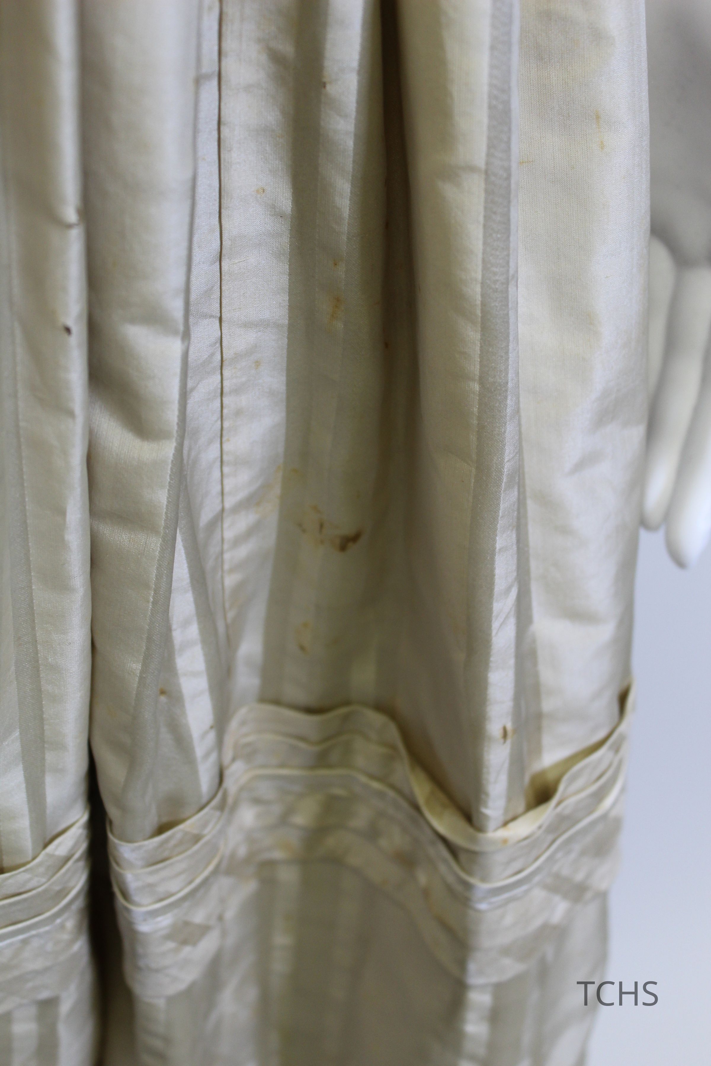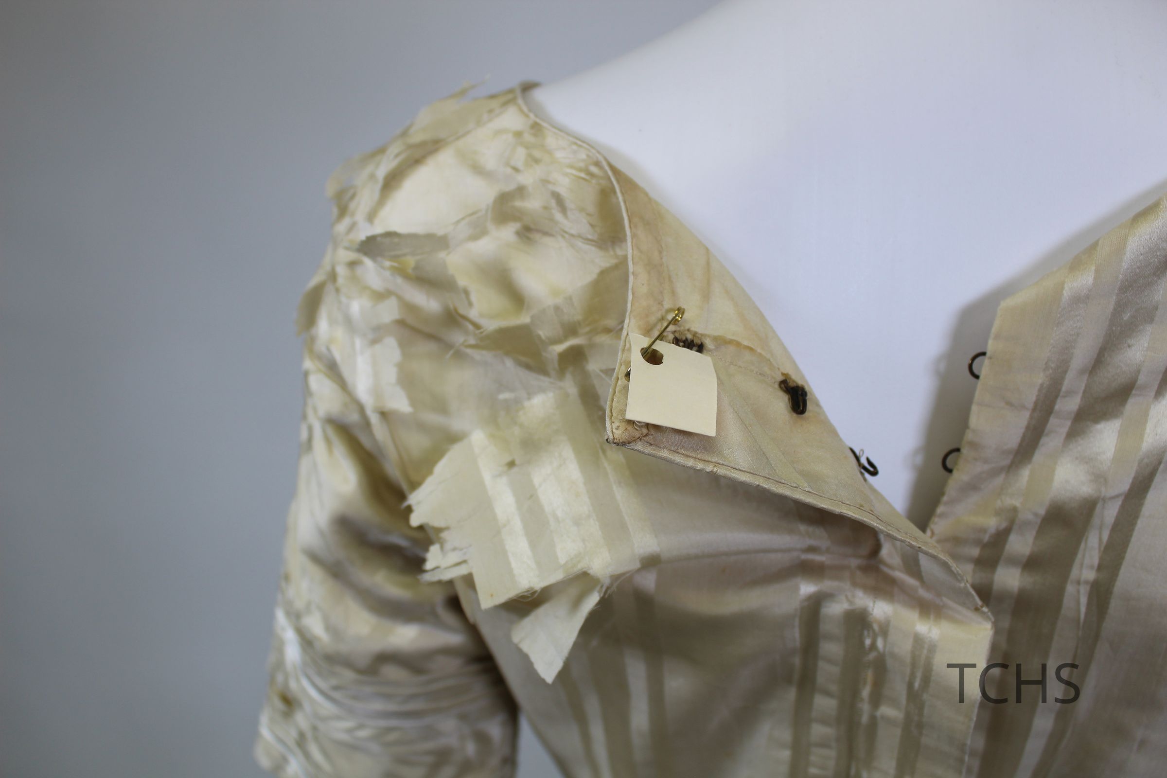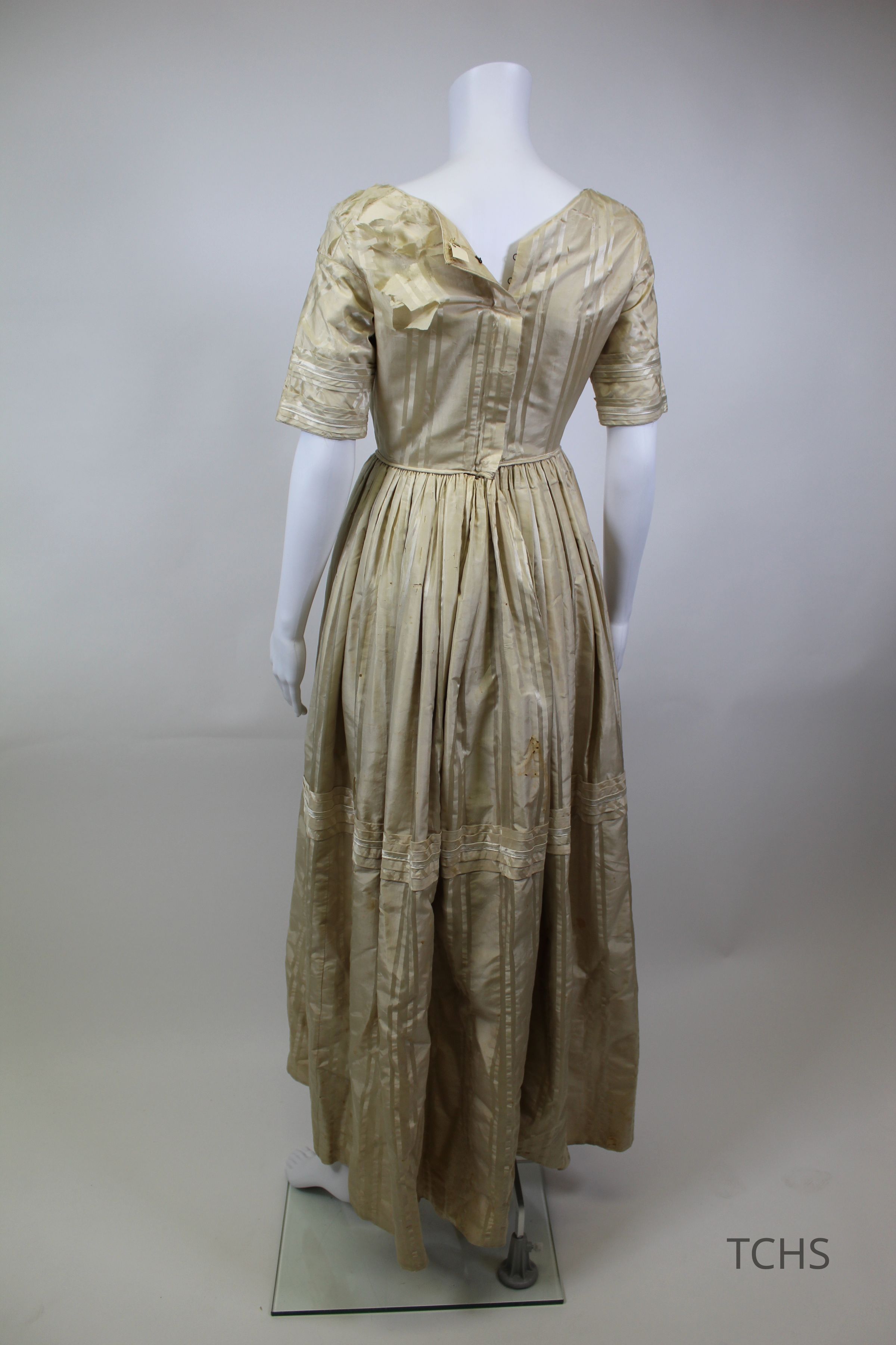 The ivory dress short sleeved with draping and pelted details. The long skirt has a faint vertical striped design. The dress closes in the back with a series of hooks. Was let out at the side along the chest and sleeves at some point..Acquisition