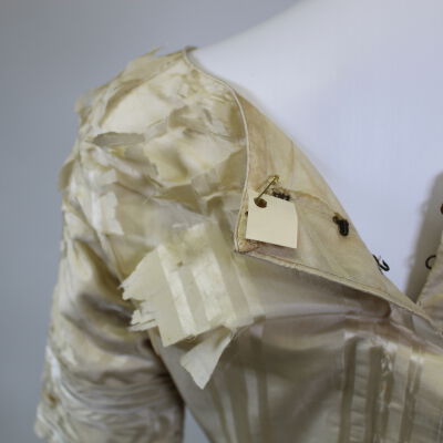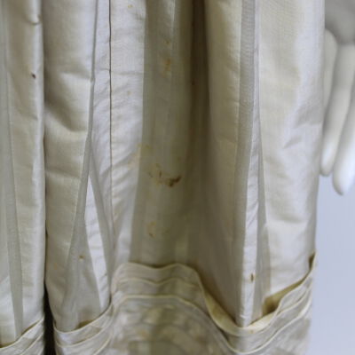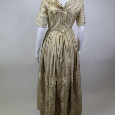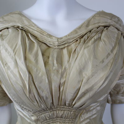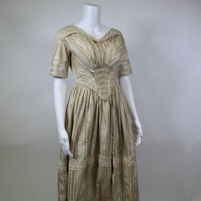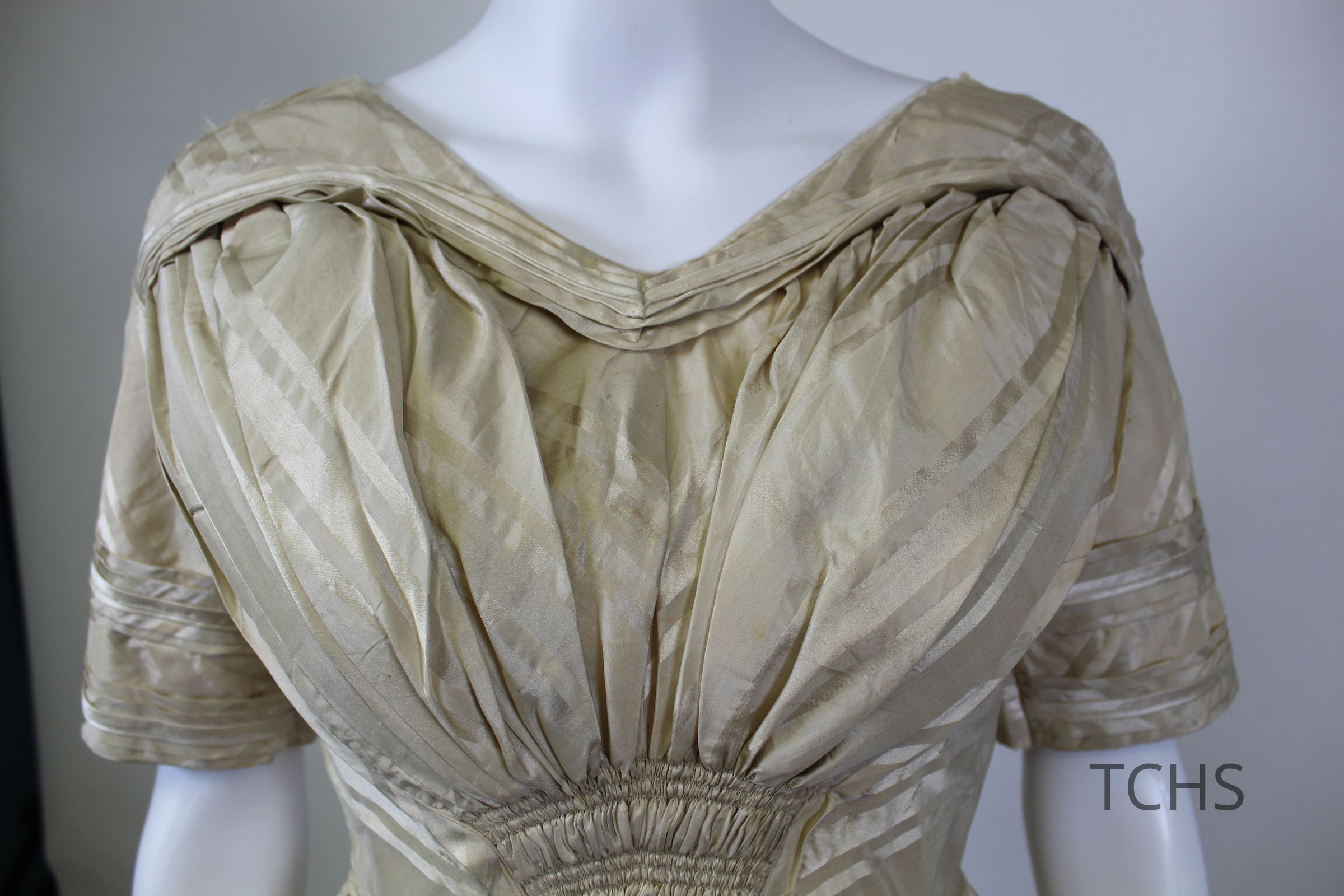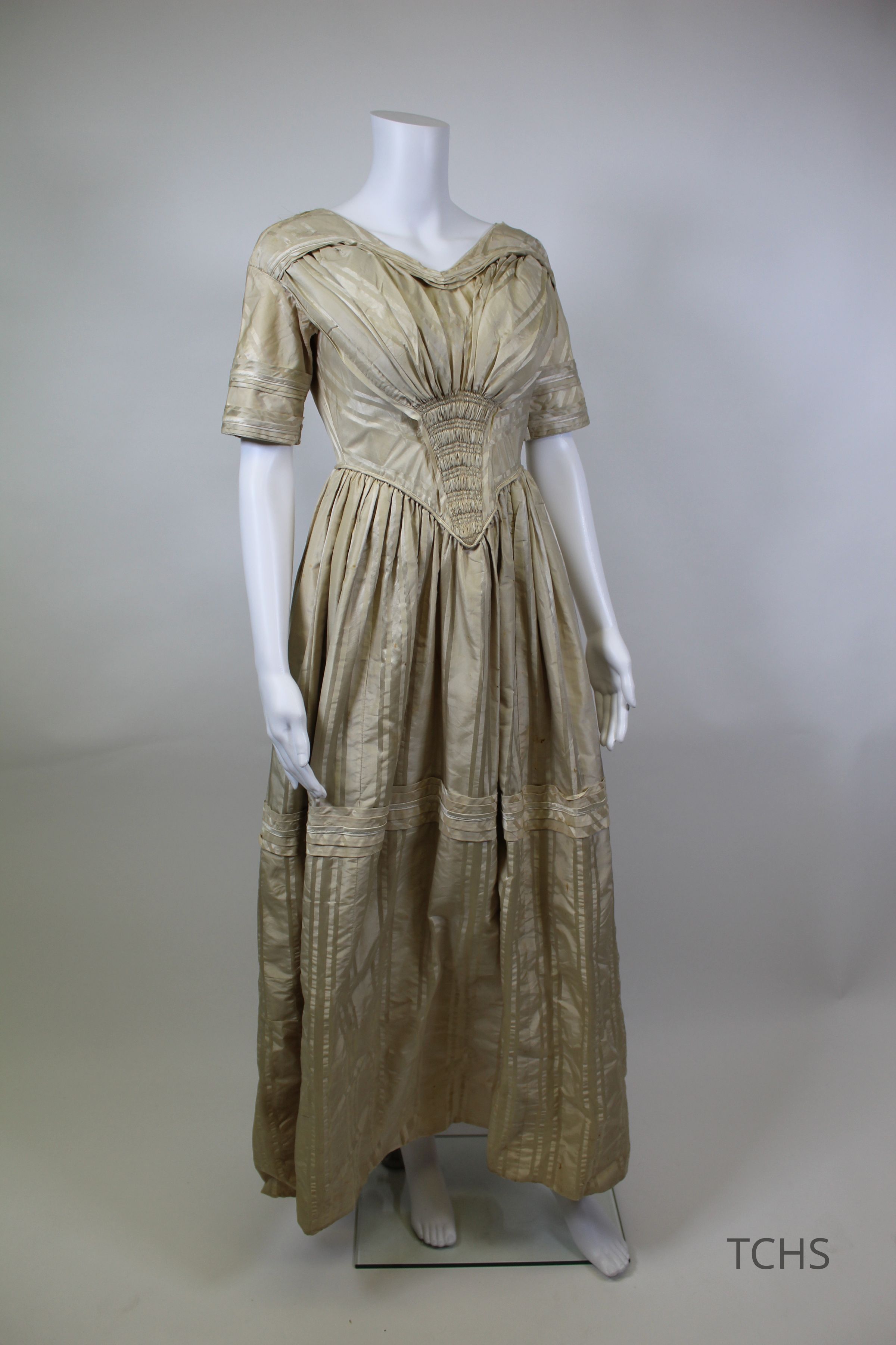 The ivory dress short sleeved with draping and pelted details. The long skirt has a faint vertical striped design. The dress closes in the back with a series of hooks. Was let out at the side along the chest and sleeves at some point..Acquisition