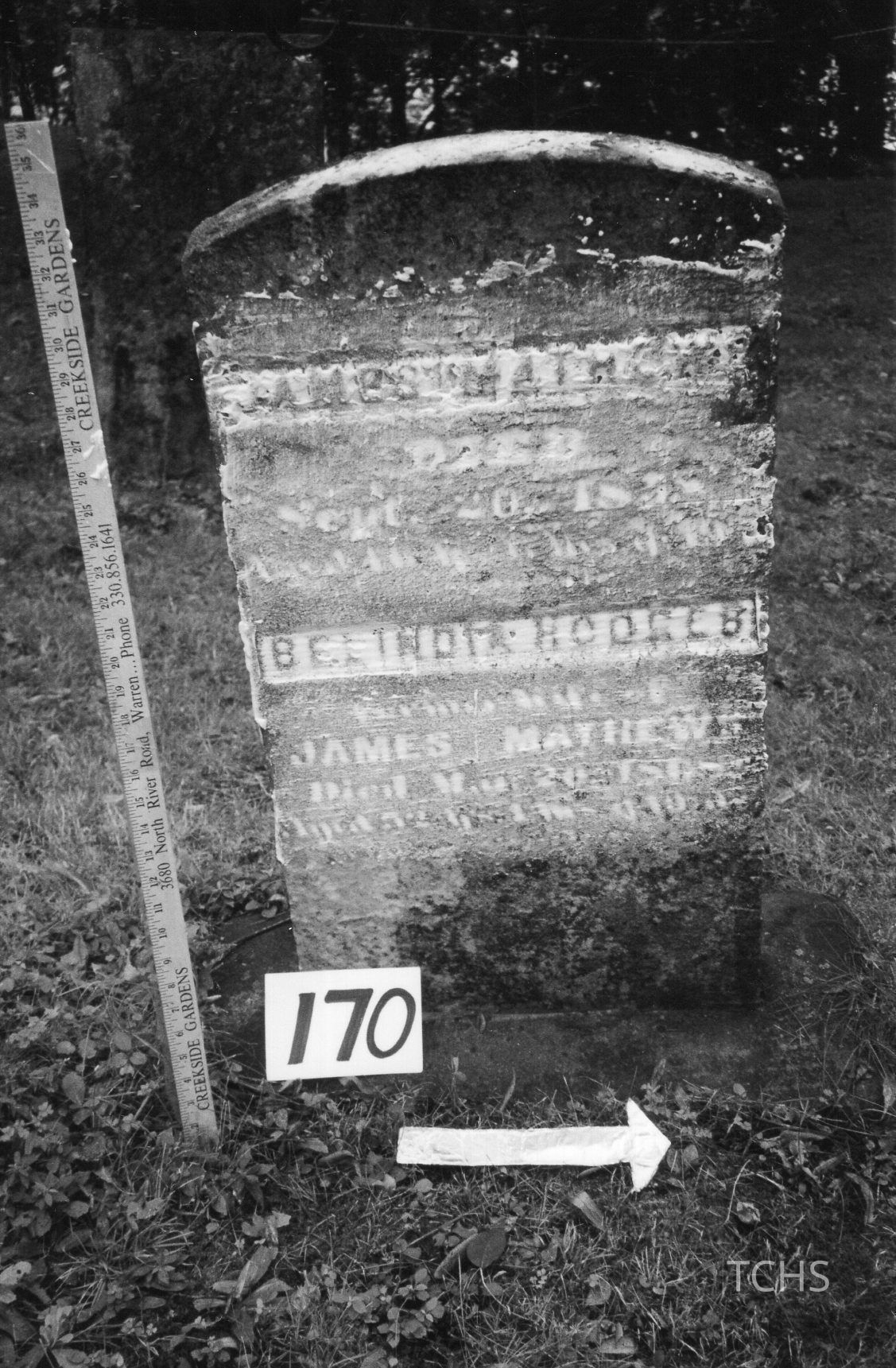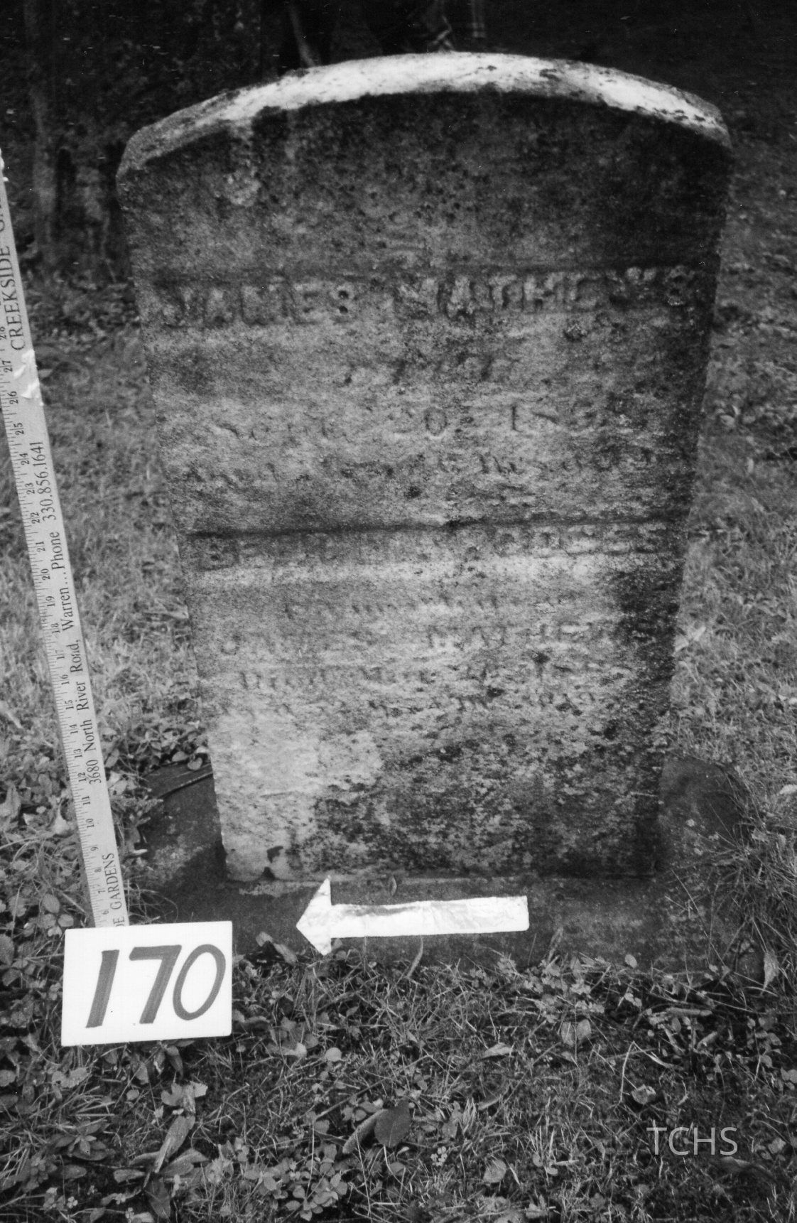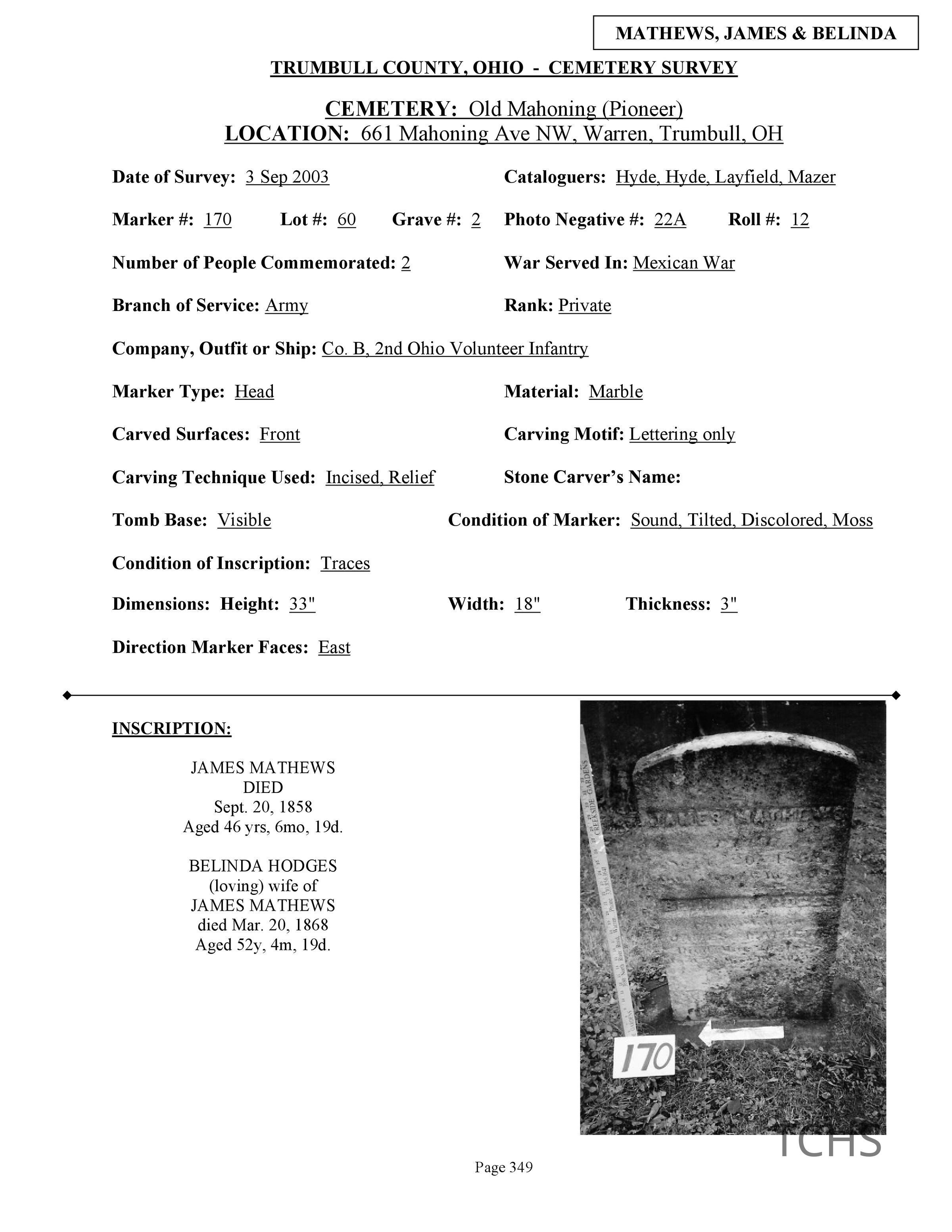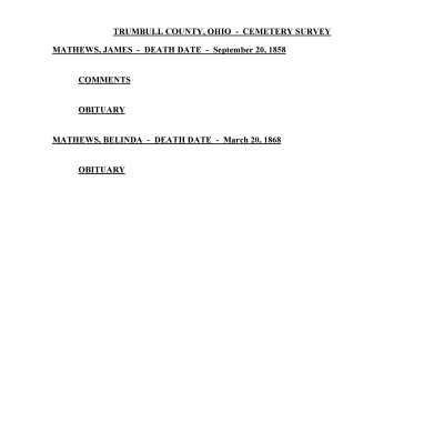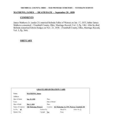James Mathews died September 20, 1858 at the age of 46 and is buried at the Old Mahoning (Pioneer) Cemetery. Belinda Mathews died March 20, 1868 at the age of 52 and is buried at the Old Mahoning (Pioneer) Cemetery. *There is an additional page attached that was found in the Veterans Index*