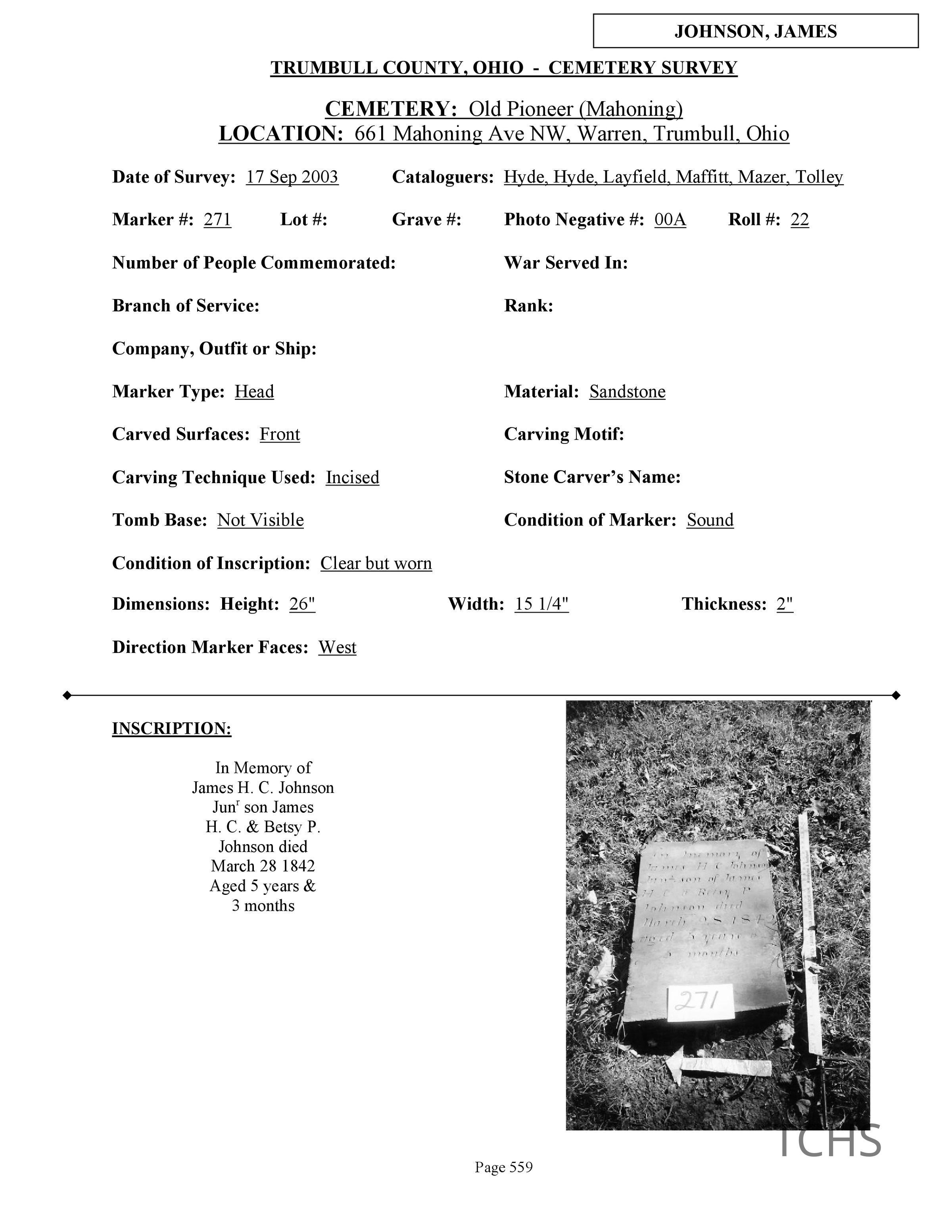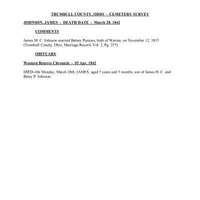 James Johnson died March 28, 1842 at the age of 5 and is buried at the Old Mahoning (Pioneer) Cemetery.