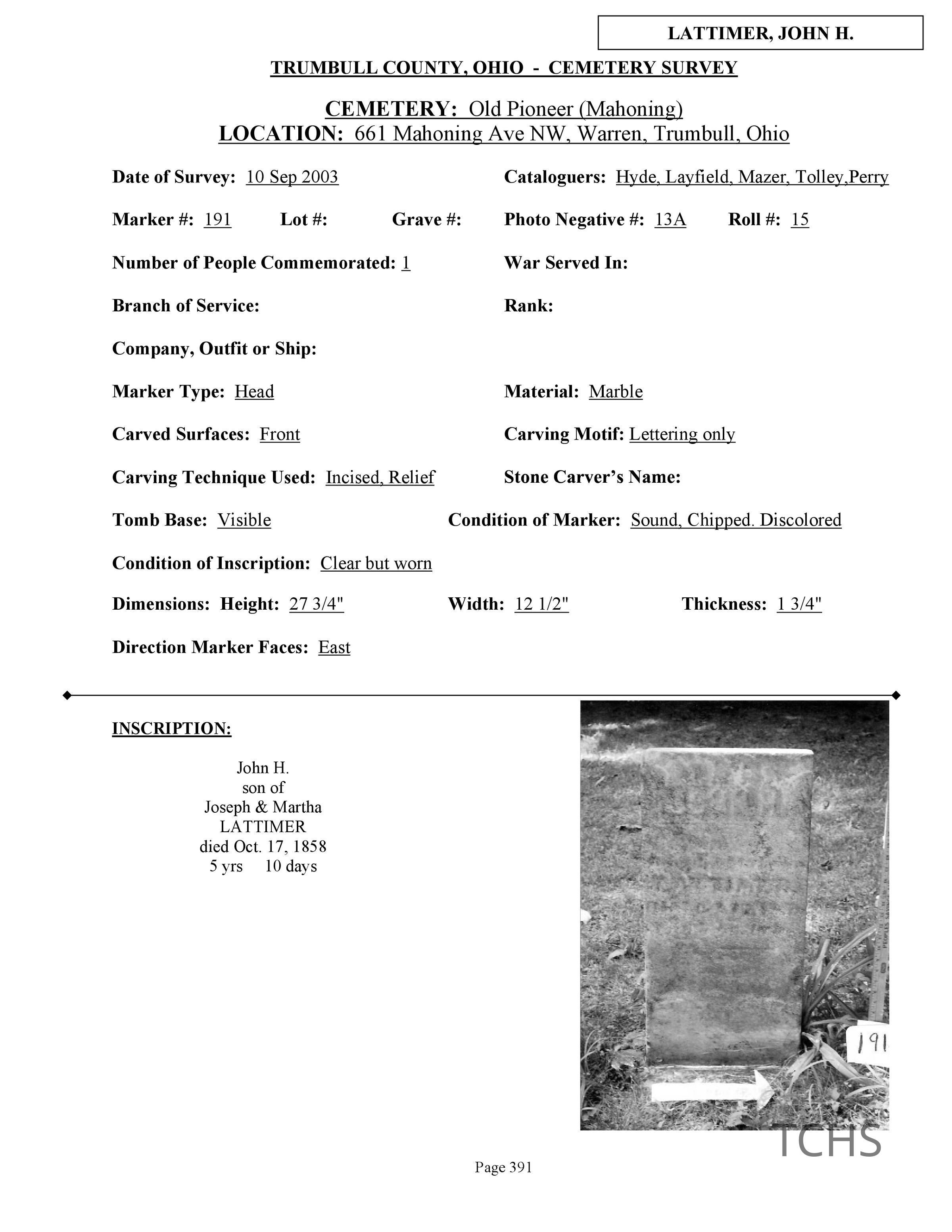 John H. Lattimer died October 17, 1858 at the age of 5 and is buried at the Old Mahoning (Pioneer) Cemetery.