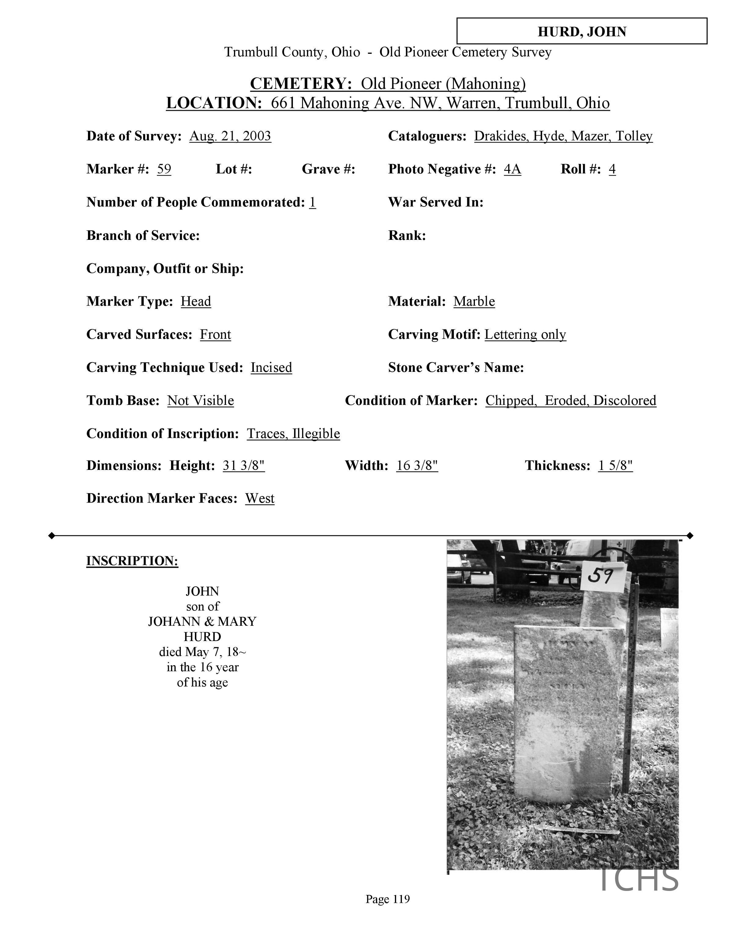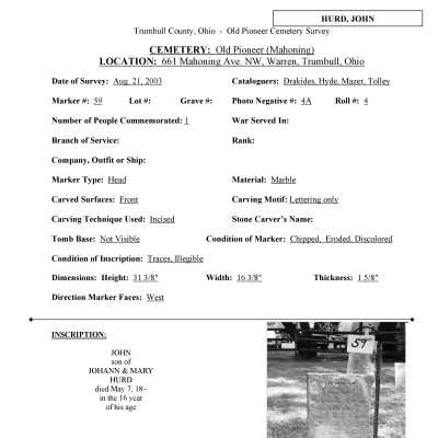 John Hurd died May 7, 18~ at the age of 16 and is buried at the Old Mahoning (Pioneer) Cemetery.